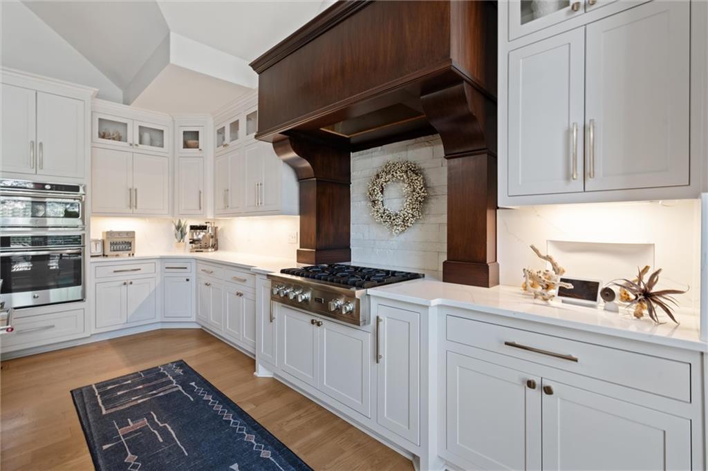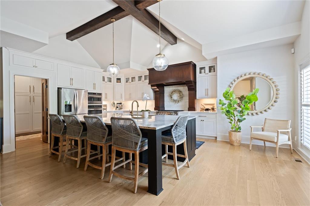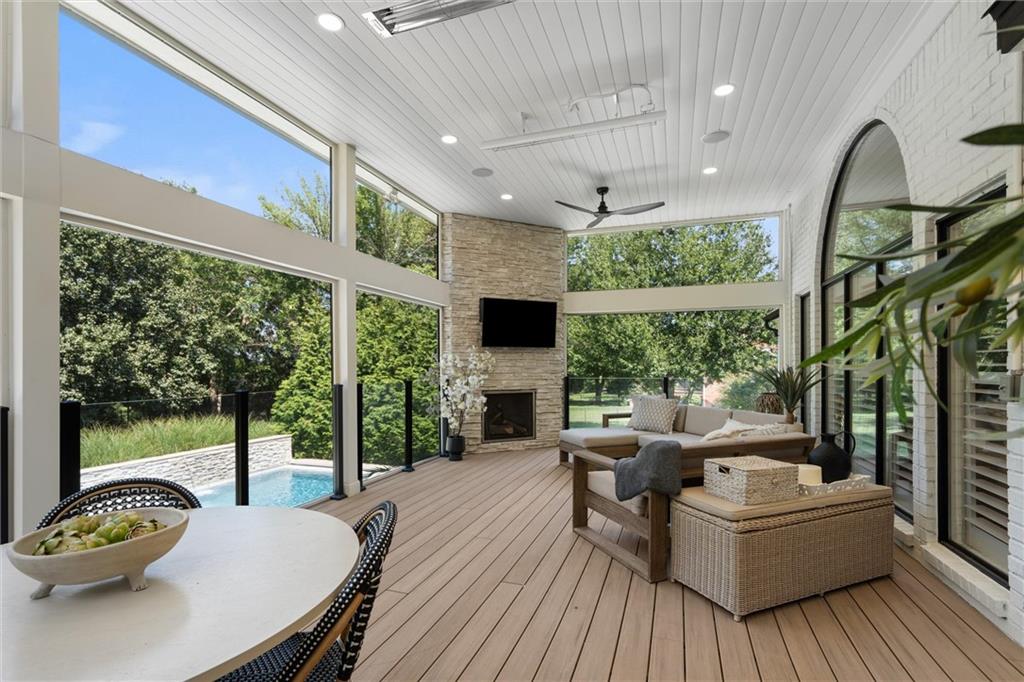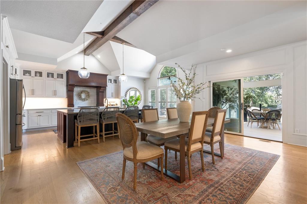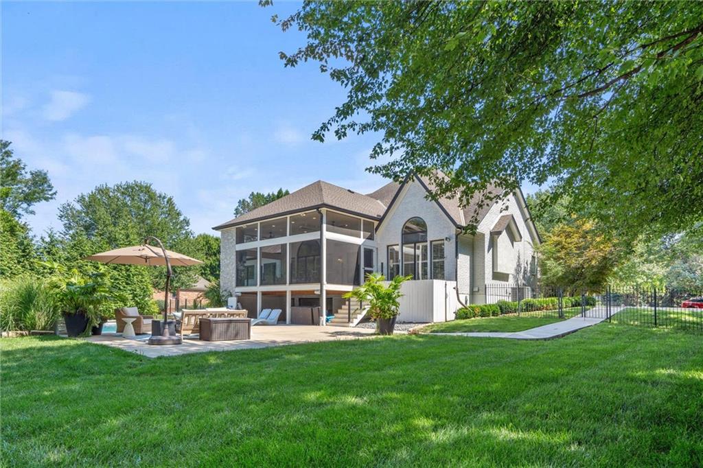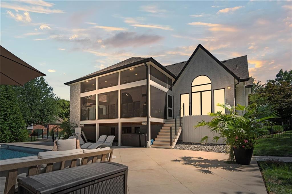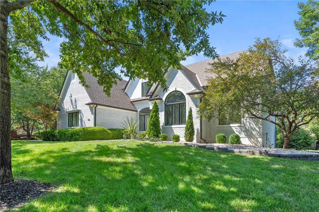 Welcome to this exceptional completely renovated 1.5-story estate nestled on a private double lot with 1.25-acres in the coveted Whitehorse neighborhood. Meticulously renovated with no detail spared, this 4-bedroom, 4.5-bath home blends elegance with modern functionality and a stunning salt water, heated gunite pool. From the entry you’re greeted by an expansive open floor plan with hardwood floors and designer finishes throughout. The main level features a stunning gourmet kitchen with massive island, custom cabinets, walk-in pantry with built-ins, and an impressive wet bar—ideal for both everyday living and entertaining. The living room, flows into the screened-in back patio, complete with a fireplace and ceiling heaters for year-round enjoyment. This serene space overlooks the gorgeous pool with tranquil waterfall features, remote cover, and a shallow lounging area—perfect for soaking up the sun or letting kids splash and play. The surrounding landscaping adds to the private, lush atmosphere, making the entire backyard feel like a five-star escape. The main-level primary suite is a retreat of its own, offering a soaking tub, huge custom walk-in closet with built-ins, and laundry area for convenience. Office with glass French doors is tucked away off the entry for a functional yet quiet space to work from. Upstairs, you’ll find two spacious bedrooms, each with en suite bathrooms and ample closet space. The walk-out lower level is equally impressive—featuring a second full kitchen, expansive living area, fourth en suite bedroom, and a versatile bonus room perfect for a theater or playroom. A massive fitness room with floor-to-ceiling mirrors and custom built-in cabinets completes the space, making it a wellness lover’s dream, and just steps away from the walkout leading to your backyard oasis. Discover unmatched comfort, design, and privacy conveniently located minutes from restaurants, shoppings, Blue Valley Schools, and everything South Leawood has to offer!