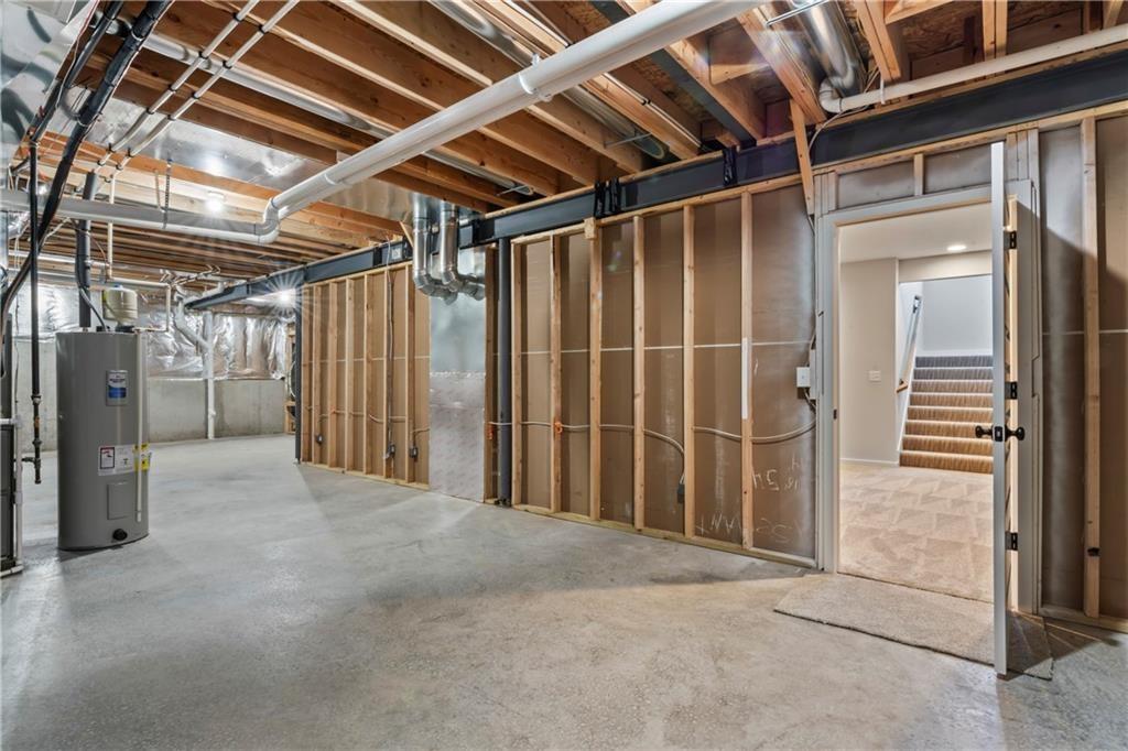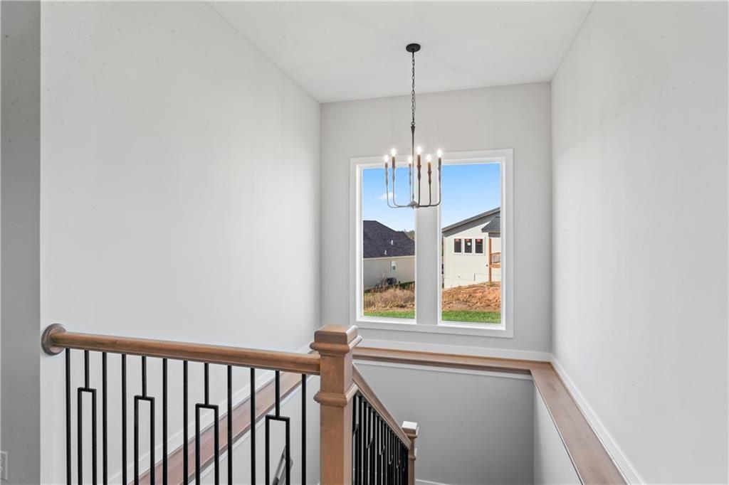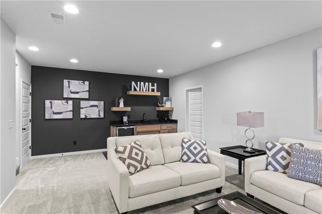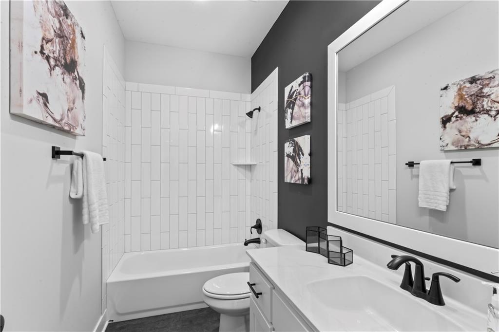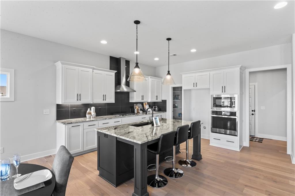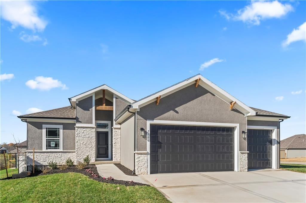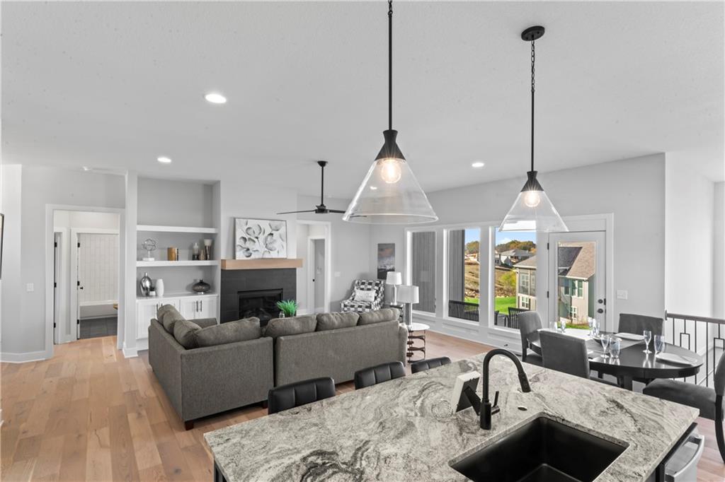 Stonebridge Villas, New Construction. The Grayson by New Mark Homes. 0.8 mi to Heritage Park • Open reverse 1.5-story • 4 months to completion. The Grayson by New Mark Homes offers open-concept main-level living with 4 bedrooms, 3 baths, and a 3-car garage. Great room features fireplace with built-ins and large windows for natural light. Kitchen includes island seating, walk-in pantry, gas cooktop, and double wall ovens. Dining area opens to covered patio for outdoor dining. Primary suite with dual vanities, tiled shower, and spacious walk-in closet connects to laundry and mudroom. Lower level includes daylight family room, bedroom, full bath, and unfinished storage. East-facing backyard with covered patio and level lawn. Located near Heritage Park, Olathe Lake, shopping, and highway access. Includes photos of a similar model—actual home under construction. Estimated completion in approx. 4 months.