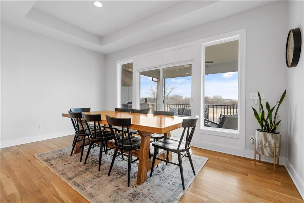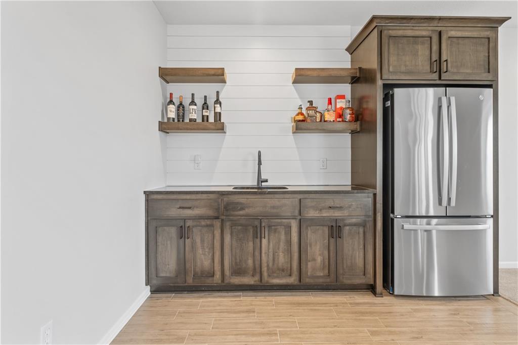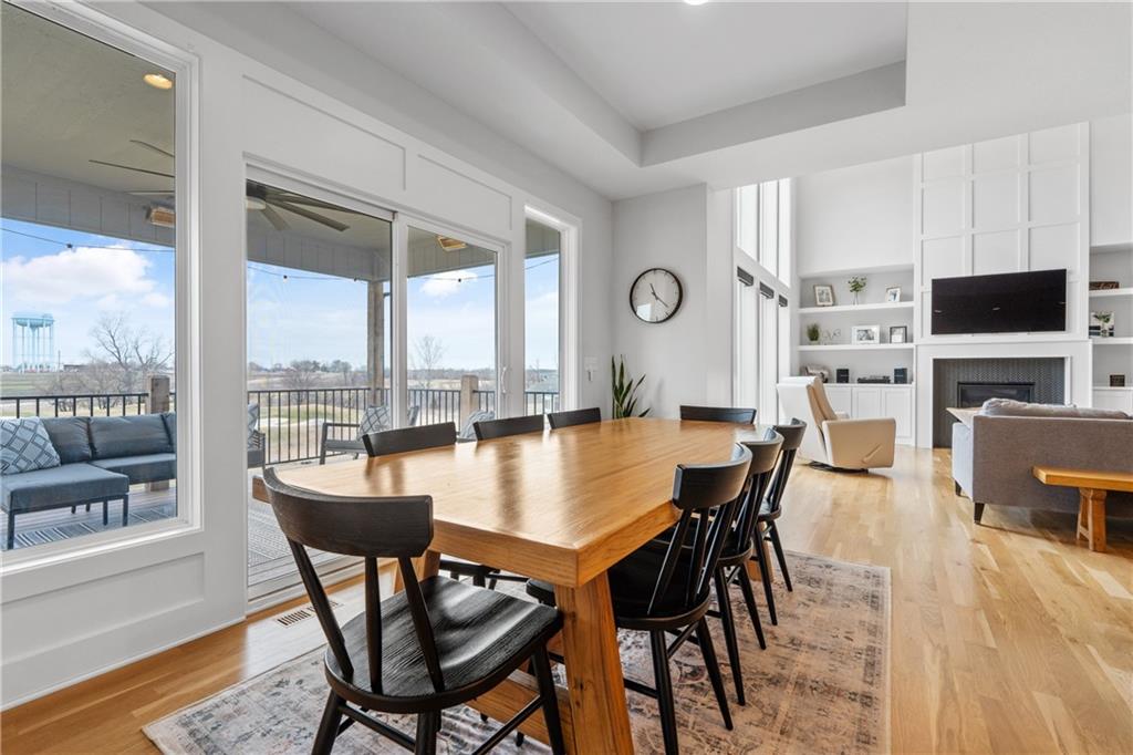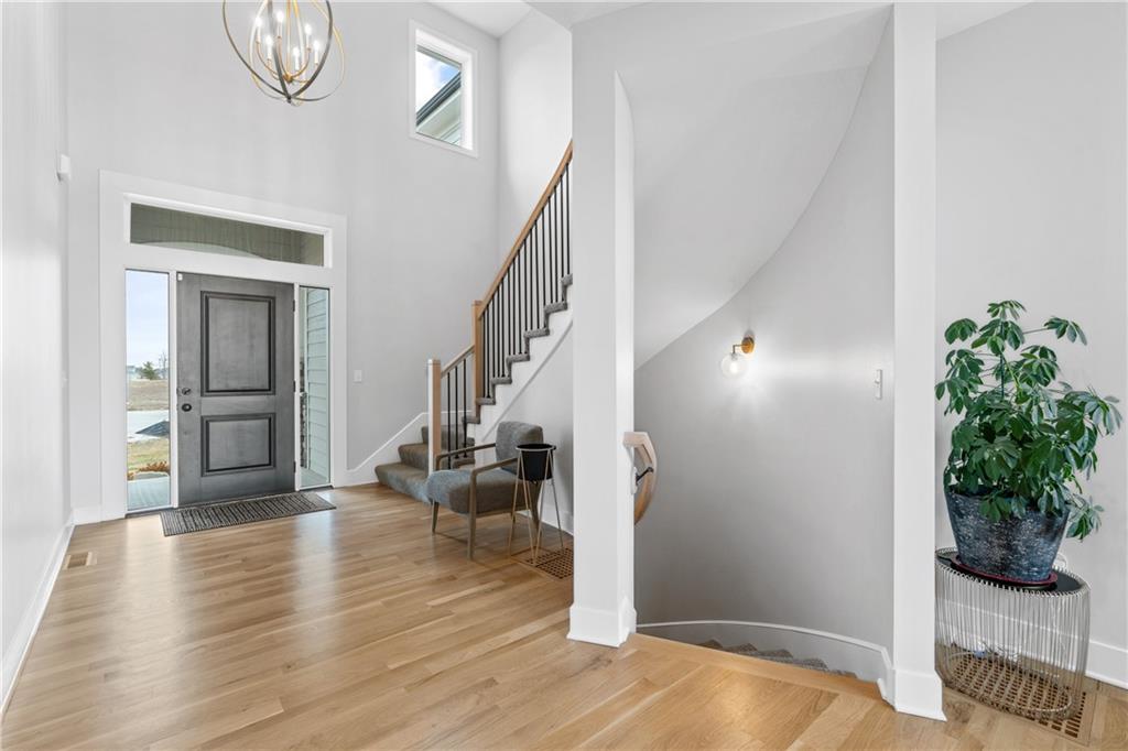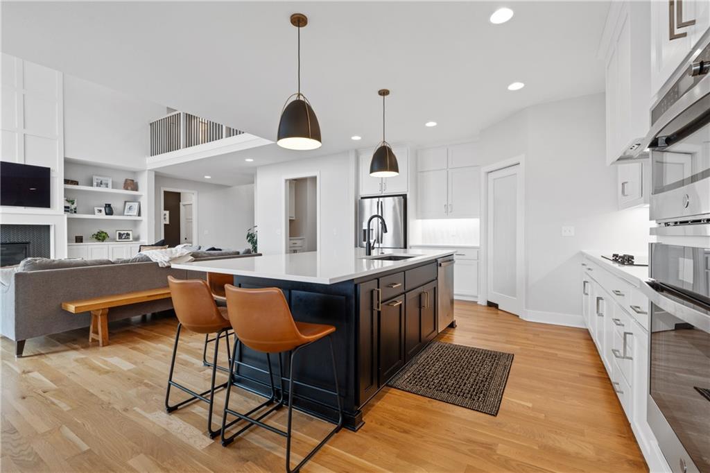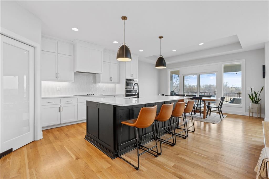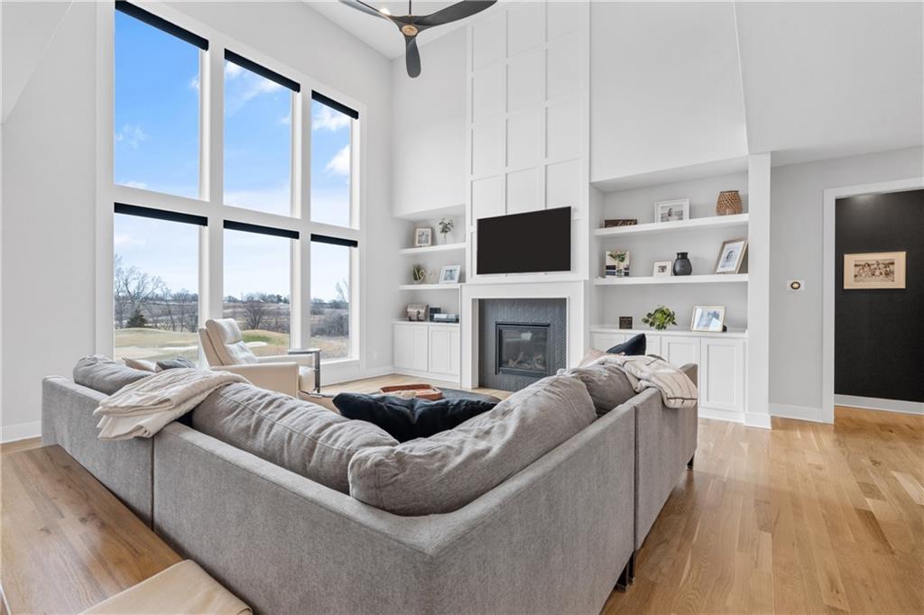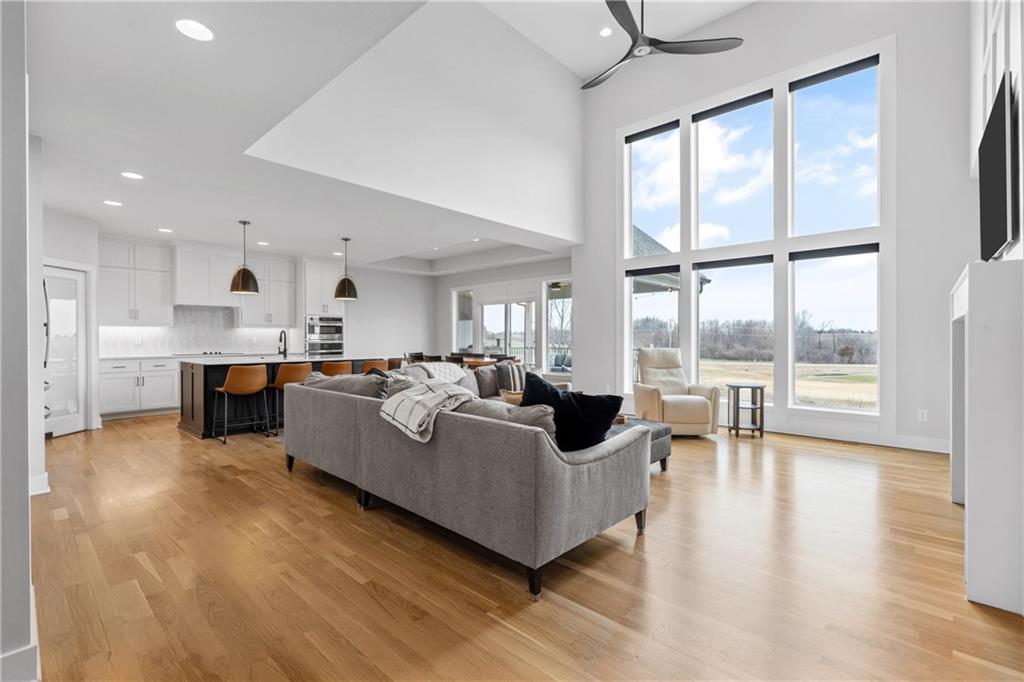 No detail spared in this stunning, like-new 1.5-story home nestled at the end of a quiet cul-de-sac. As you enter, a curved staircase greets you, leading into the Great Room that’s designed to captivate with its vaulted ceilings, floor to ceiling windows and a cozy fireplace with surrounding built-ins. Every detail has been meticulously crafted with premium upgrades including hardwood floors, dual HVAC systems, a tankless water heater and room expansions including the kitchen, deck, garage, primary suite and four second level bedrooms. The chef-inspired kitchen features high-end cabinetry, top-tier stainless steel appliances, a walk-in pantry with a coffee bar, and an oversized kitchen island with ample breakfast bar seating. The luxurious primary suite offers heated floors, double vanities, a soaking tub, and a large walk-in closet with custom shelving that is conveniently connected to the laundry room. The finished walkout basement is the perfect entertainment hub with a large recreation room, a wet bar with floating shelves and space for a full-sized fridge, sixth bedroom and a full bath. Enjoy breathtaking sunsets overlooking the 15th hole of the Falcon Lakes golf course from the covered deck or large patio. Falcon Lakes offers a golf course, swimming pool, tennis and basketball courts, playground, trails, and BBQ pavilion. Conveniently located, just minutes from Legends Shopping Center, KansasSpeedway, Sporting KC, and downtown Kansas City. Schedule your showing today!