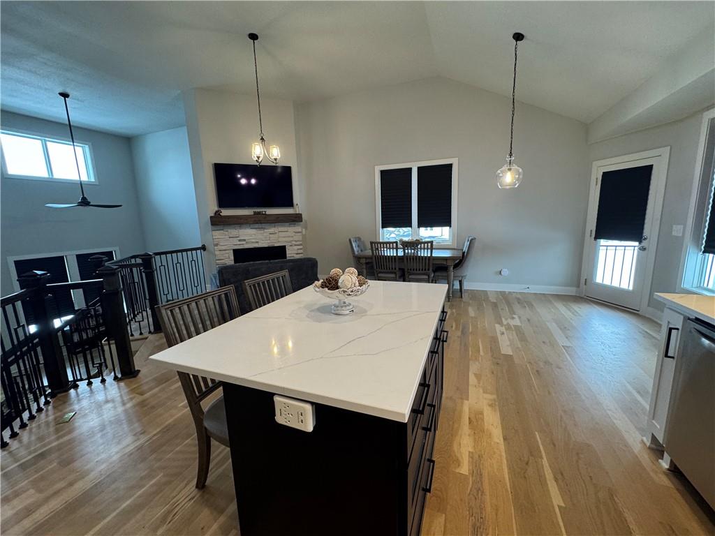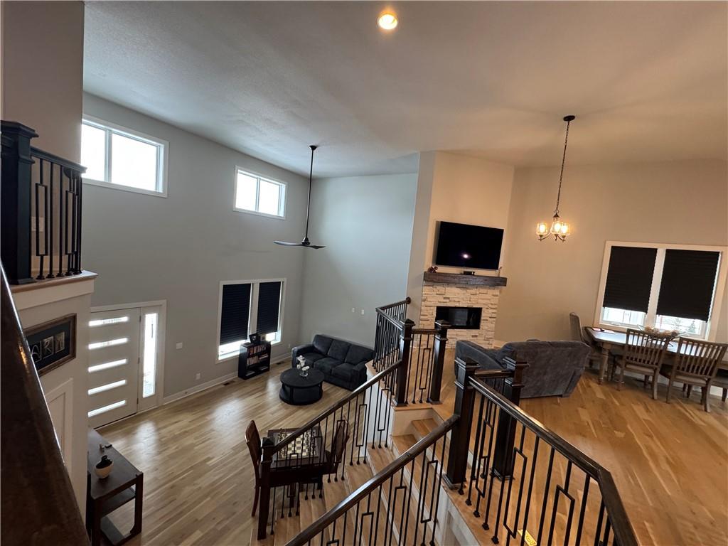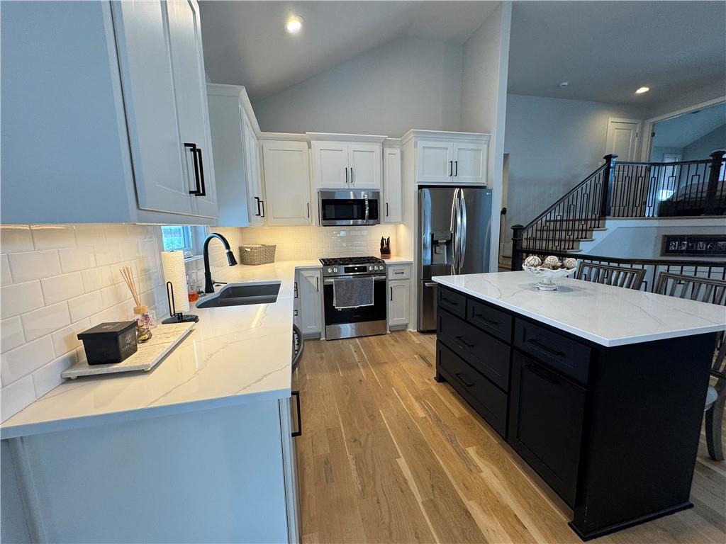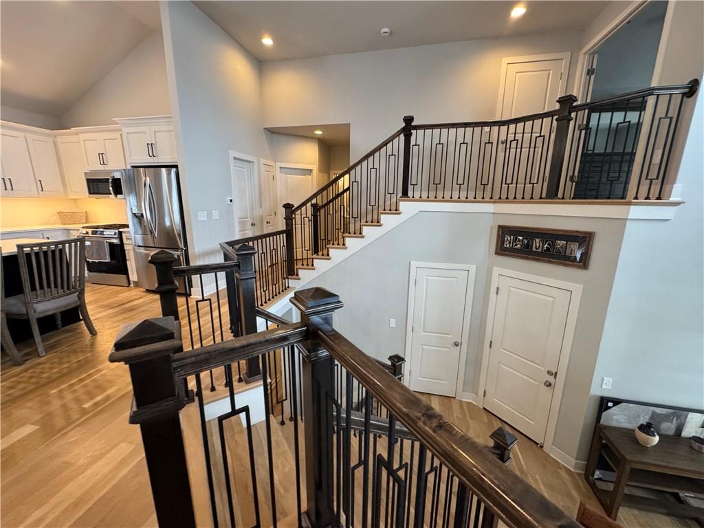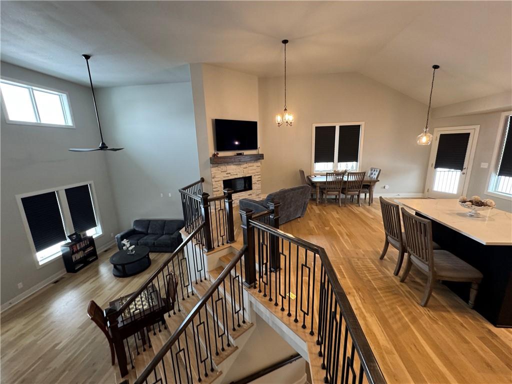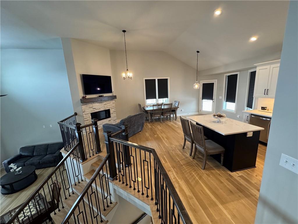 BEAUTIFUL TREED BACKYARD! VAULTED CEILINGS WITH OPEN FLOORPLAN..LIGHT AND BRIGHT WITH WALL OF WINDOWS. MODERN TWIST WITH THIS SPACIOUS FLOORPLAN. STEP UP INTO A PRIVATE PRIMARY SUITE WITH OWN FLOOR LEVEL BOASTING HUGE AMAZING CLOSET AND PRIVATE BATH WITH TILED WALK IN SHOWER, DBL VANITY. UNIQUE AND OPEN. COME CHECK IT OUT! HEARTH FIREPLACE OFF KITCHEN AND DINING AREA OVERLOOKING THE GREAT ROOM. ADDITIONAL 2ND F/P IN LOWER LEVEL WITH AMAZING WINDOWS WITH VIEW OF THE TREES! HURRY! DON'T MISS AN OPPORTUNITY TO OWN ACROSS FROM LAKE LENEXA. MOVE IN READY!