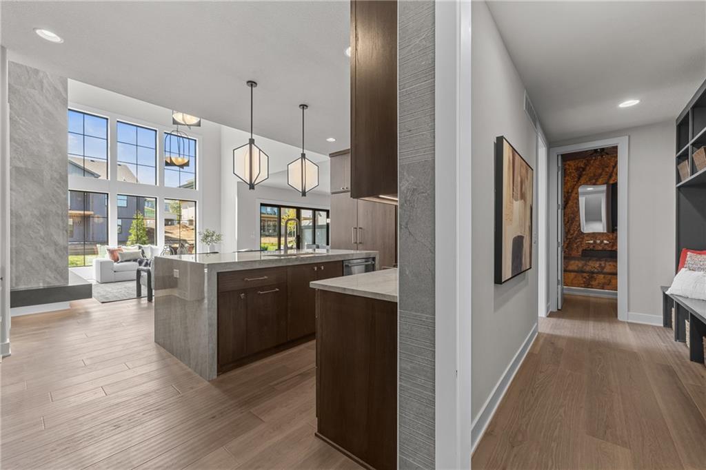 This new 1.5 Story Birmingham II plan by SAB HOMES is READY to tour!! This spectacular new MODEL HOME is an impressive mix of modern sophistication loaded with premium new upgrades. This home offers 3 levels of finished space at just over 4600 square feet. As you enter, this plan features a soaring two story ceiling, fantastic new modern lighting, two story great room with floor to ceiling tile fireplace with floating hearth and black linear fireplace. The spacious dining room showcases a sophisticated accent wall with mirrors and floating shelves and a double slider door to access the covered 17' x 10' tiled patio. The butlers pantry has an extra MOEN sink, water bottle filler and glass swing door to Chef's kitchen with premium CAFE appliances and DEKTON waterfall island and backsplash. Explore the main level primary bedroom with tile headboard accent wall with mirrored walnut side trim, spacious bath with freestanding tub and large closet. There are four bedrooms up plus a loft space at the landing ideal for upstairs game room or craft room. There is a space for everyone in this home with three floors and 5 bedrooms. The lower level offers 1339 sf of additional finished space ideal for entertaining or exercising with a whiskey wall bar with mirrored tiles and floating shelves, fitness room with double glass doors and Finnleo Sauna, full bath, and theater room. Don't miss the extra features including a guest bath backlit rock wall, extended 3rd car bump out for extra storage, split 3 car garage, real stone trim, large front porch, tiled front porch and patio TV wall. Come join the fun in Century Farms, a unique one of a kind upscale new home community in Overland Park. Century Farms has a spectacular clubhouse with a fitness center, resort style swimming pool, two pickle-ball courts, kids play area and community garden. It's located near the new Bluhawk shopping center, Heritage Park and the OP Arboretum. BLUE VALLEY SCHOOLS
