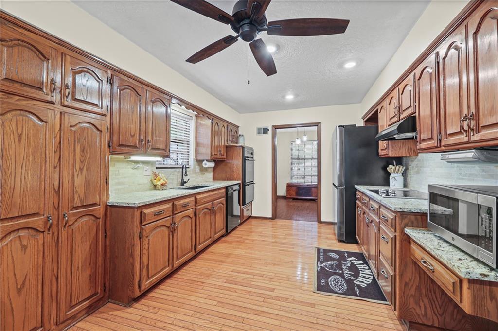 Step inside to a bright 2-story entry showcasing a dramatic catwalk & a vaulted great room with exposed beams, a 2-story fireplace, and built-in bookcases perfect for storage and display. Combination of luxury plank vinyl, hardwood floors flow (kitchen) throughout the main living space, creating a warm and welcoming atmosphere. The formal dining room offers flexibility to use as an office, playroom, or space for entertaining. The main level features three bedrooms, including two that share a convenient Jack-and-Jill style en-suite bath. Off the main hall, is a spacious bathroom that leads to the laundry room for added functionality. Upstairs, the large master suite is a true retreat with dual closets and dual vanities. A walk-in attic offers convenient storage across from the master suite or potential added space to convert to an office space, sitting room or perfect for gaming. The lower level provides even more opportunity with a customizable space featuring a stubbed-in bathroom, fireplace, and access to the oversized garage with built-in workbench, and private entry. Additional highlights include wiring for a security system, stubbed central vacuum (unit not included), and a large fenced backyard with patio that provides privacy for outdoor entertaining. Newer fridge, roof, carpet, hot-water heater, furnace, and extensive foundation work with a transferable warranty. Great access to shopping, dining, and area parks. Conveniently located, 5-6 min from I-70, making commutes to downtown Kansas City or other parts of the metro area both easy and efficient.