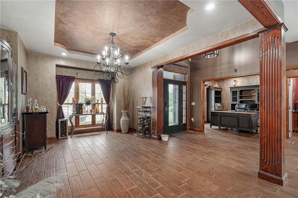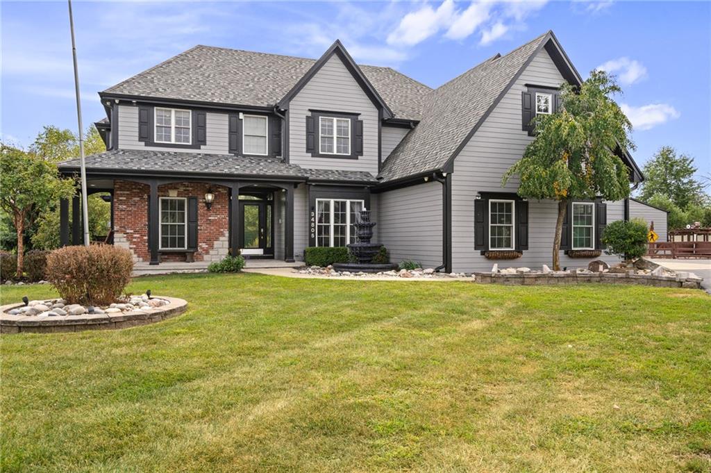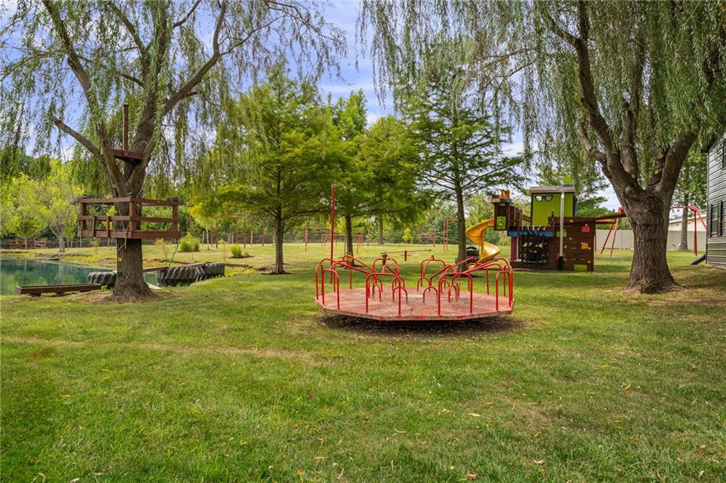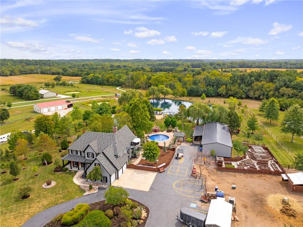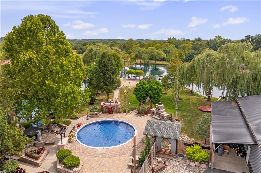 Live, work, and play like never before on this fully fenced, gated 5-acre estate on blacktop in Lone Jack—designed for entertaining, outdoor living, and enjoying the land your way. Whether you're into fishing, paddleboarding, raising chickens, gardening, hosting parties, or running a business from home, this unique property makes it possible. Three scenic ponds set the stage—one with sandy beach, dock, playhouse with hurricane deck, and zip line; another with a 12-foot stone waterfall framed by weeping willows. Outdoor living includes a pool, festive bar, outdoor shower, firepits, fountains, basketball court, and striped parking for nine. A vintage merry-go-round, playground, and wisteria-draped pergola add whimsy, while mature landscaping and unique trees create a lush, park-like setting. Grow and raise what you love: a fenced livestock area with shelters and duck pond supports chickens, goats, or a horse. A large raised garden with drip irrigation and auto-watering is ready for your green thumb. Built in 2006, the two-story home offers comfort and space with hard-surface flooring on the main level, five fireplaces, formal dining, home office, and hearth room kitchen with island seating and Viking six-burner cooktop. French doors open to a fenced dog yard with pergola and hibachi grill—perfect for pets and casual cookouts. Upstairs, four bedrooms each have private baths. The oversized primary suite includes a fireplace, sitting area, walk-in closet, and private covered balcony with mini split—your retreat above it all. The walkout lower level is built for fun and function, featuring a theater, arcade, full bar, non-conforming fifth bedroom, full bath, and access to a saloon-style patio with hot tub and firepit. A newly built outbuilding adds flexibility—with concrete floor, two oversized overhead doors, built-in compressor, and plumbing for future living quarters. Ideal for equipment, hobbies, or home-based business use.