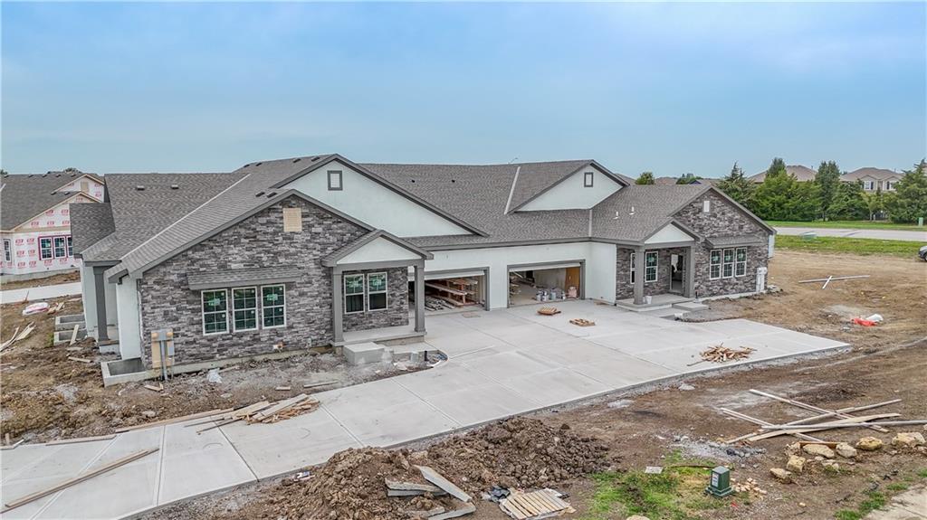 Welcome to the Maintenance Provided Ranch Villas. This residence will be move-in ready November 2025 and showcases an open floor plan with 10-foot ceilings and refined finishes throughout. Maintenance-free living includes lawn care, snow removal, and all exterior upkeep, including roof replacement. The main level is thoughtfully designed with a spacious living room featuring a stunning fireplace and abundant natural light. The gourmet kitchen is appointed with stainless steel appliances, custom cabinetry, under-cabinet lighting, and a generous walk-in pantry. Additional conveniences on the main floor include a mudroom, built-in desk area and laundry room. Hardwood flooring enhances the entry, living room, kitchen, mudroom, office, and dining areas. The primary suite offers a walk-in closet, raised vanity tops, and a spa-inspired bathroom with beautifully tiled shower walls and floors. The lower level expands the living space with a large recreation room complete with a dry bar, two additional bedrooms, and a full bathroom—bringing the total to four bedrooms.
