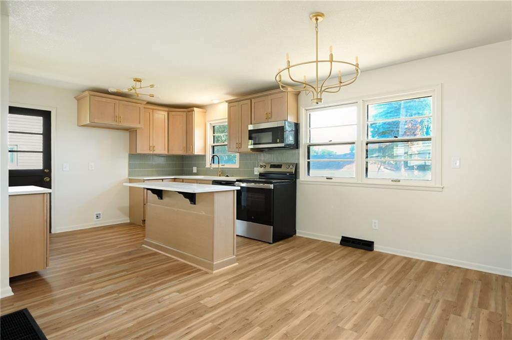 SELLER OFFERING $12K IN SELLER PAID CONCESSIONS!! You don’t want to miss this beautiful raised brick ranch tucked away in a quiet, mature neighborhood just ten minutes from The Legends and all the shopping, dining, and entertainment you could want. Step inside and you’ll appreciate the open-concept design that blends the living, dining, and kitchen spaces together. The fully updated kitchen features new soft-close natural oak cabinetry, granite countertops, a beautifully tiled backsplash, and brand-new stainless steel appliances. An oversized island adds bar-top seating and extra prep space while allowing you to stay connected with the living room. The formal dining area provides a more traditional option for meals and gatherings. The living room is warm and inviting, highlighted by a gorgeous brick fireplace that serves as a perfect focal point. The main level continues with all-new LVP flooring, fresh interior paint, new hardware, and updated light fixtures throughout. The hallway bath has been beautifully renovated with a new tub, tiled shower, vanity, shelving, and modern finishes. Bedrooms are nicely sized, and the primary suite stands out with a fully updated bathroom offering a tiled shower, tub, new vanity, and thoughtful storage. Downstairs, the lower level provides a spacious family room with a second fireplace and an eclectic accent wall, along with a fourth bedroom and a third full bathroom that includes a stand-alone shower and newer vanity. The oversized two-car garage gives plenty of space for parking and storage, and the well-maintained mechanicals give peace of mind. Outside, the fully fenced backyard offers privacy and plenty of space for activities or entertaining, complete with a large concrete patio. This home is clean, updated, and ready for its new owners to move right in.