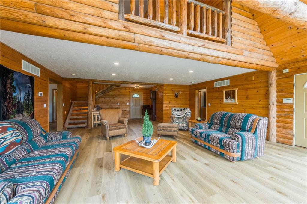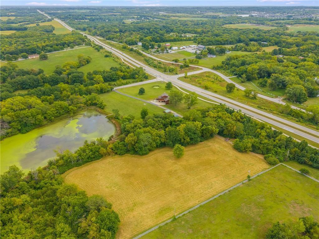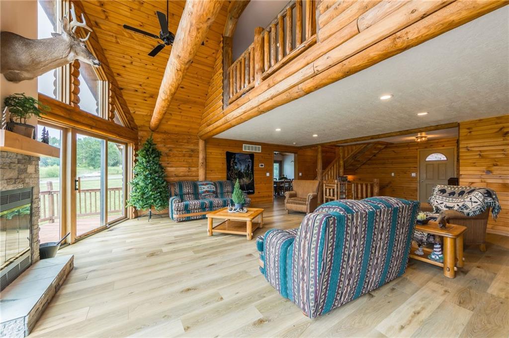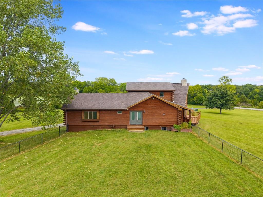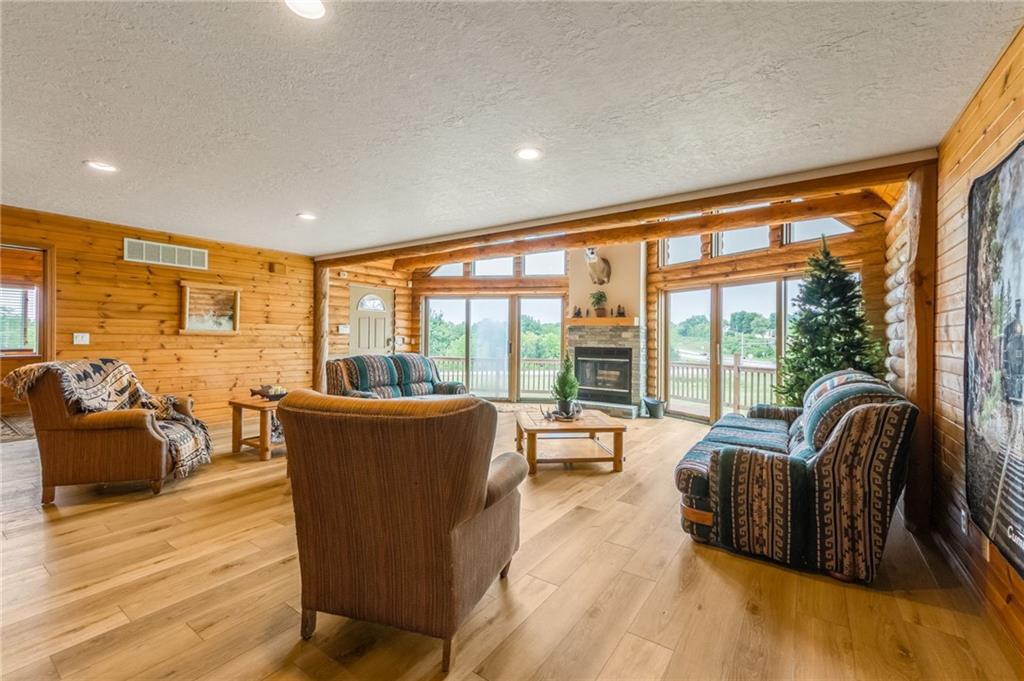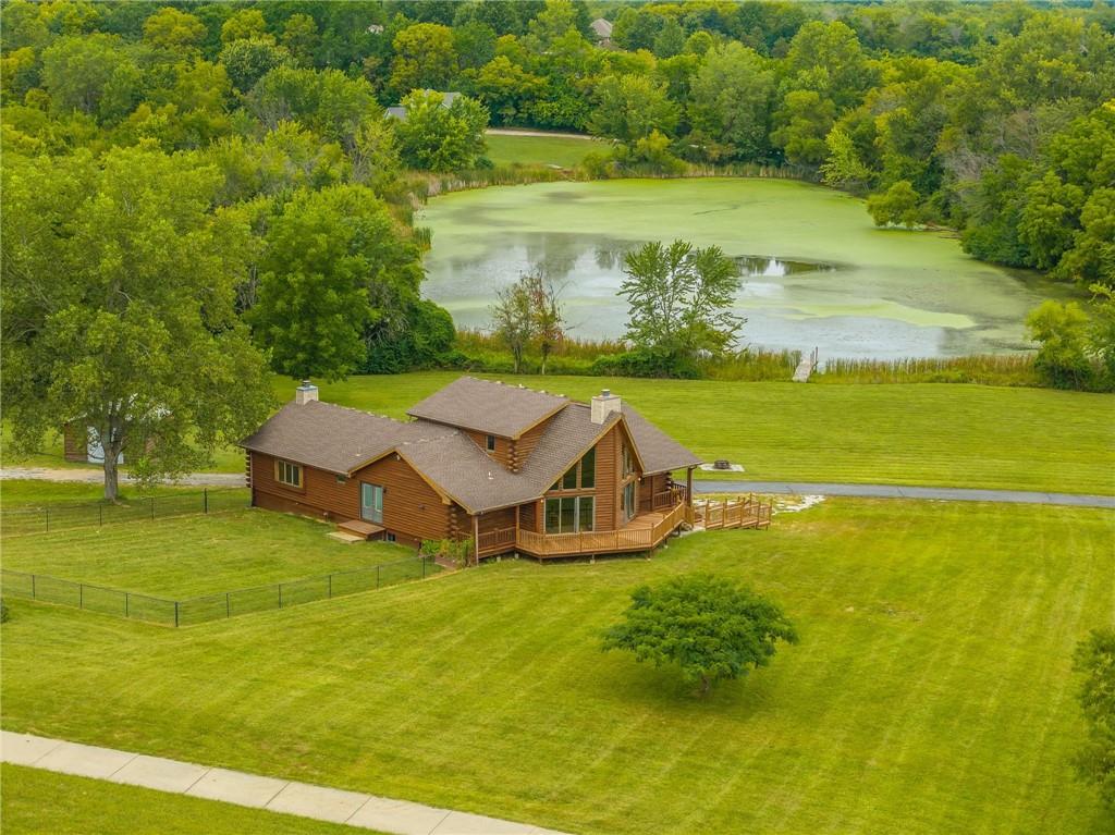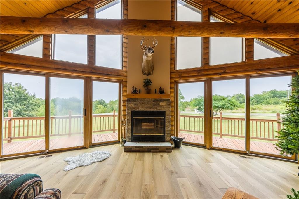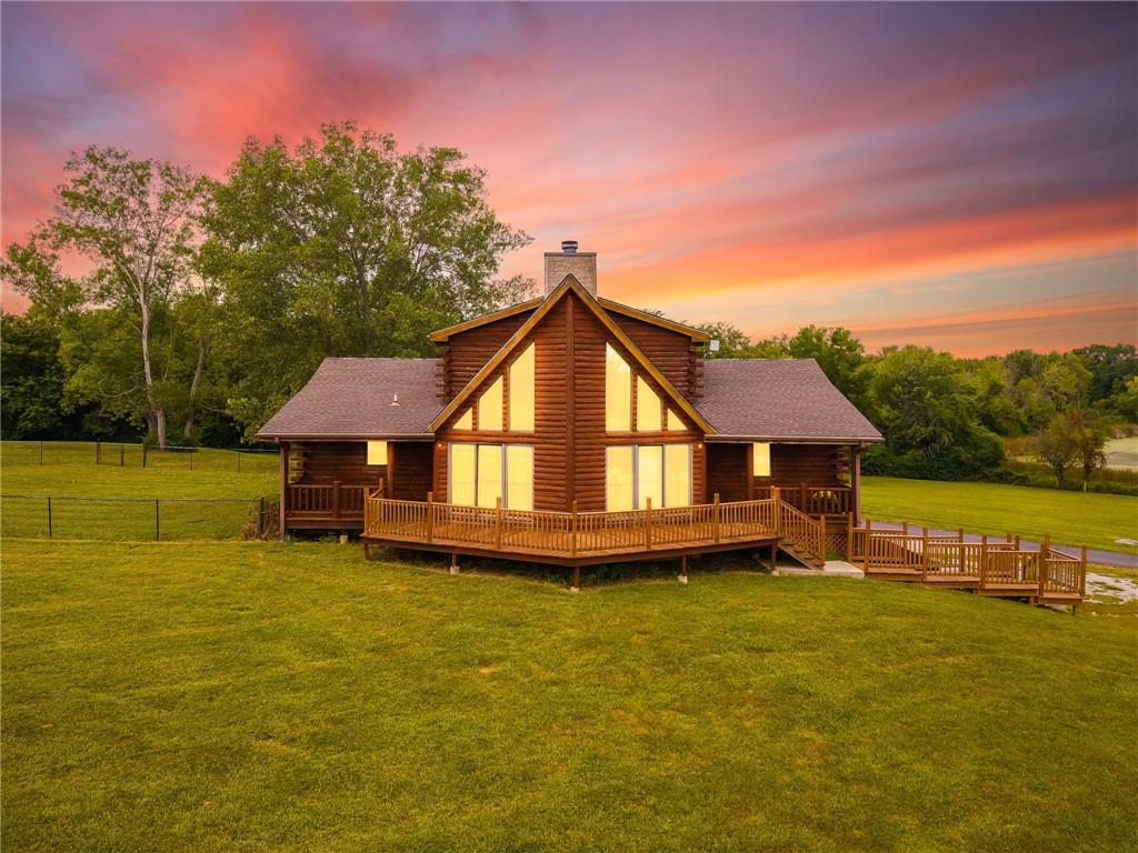 AMAZING location right off of main road for a business. Escape to your own private retreat on 8.78 acres overlooking a 3-acre stocked pond with a perfect mix of woods and pasture. This custom-built insulated log cabin offers both rustic beauty and energy efficiency, showcasing hand-carved stairs, soaring vaulted beamed ceilings, a gorgeous deck, and a dramatic two-story stone fireplace that anchors the heart of the home. There's even potential for a second apartment in the walkout basement. Step inside and you’re greeted with breathtaking views from every angle. The main level invites gathering with a spacious kitchen including tons of cabinets and center island, a cozy master suite with a walk-in closet and jacuzzi tub, and a large room with a second fireplace that could be a huge bedroom or separate living space. A door opens from the kitchen to a fenced yard great for the pets in your life. Upstairs, you find the coziest part of the home - a charming loft overlooks the great room, perfect for reading or simply soaking in the cabin atmosphere, along with another bedroom and bath. The finished walkout basement expands your possibilities with tall ceilings, a spacious gathering area, abundant storage, and an additional bedroom. Enjoy two solar-powered outbuildings and an extended 2 car garage for hobbies, storage, or workspace. Whether you’re fishing in your shared pond, exploring the woods, farming, or relaxing on the deck, this property offers the ultimate combination of privacy and lifestyle. Located less than 10 minutes from Longview Lake, shopping, dining, and amenities, this log cabin retreat is the perfect way to embrace the warm and relaxing lifestyle you are seeking.