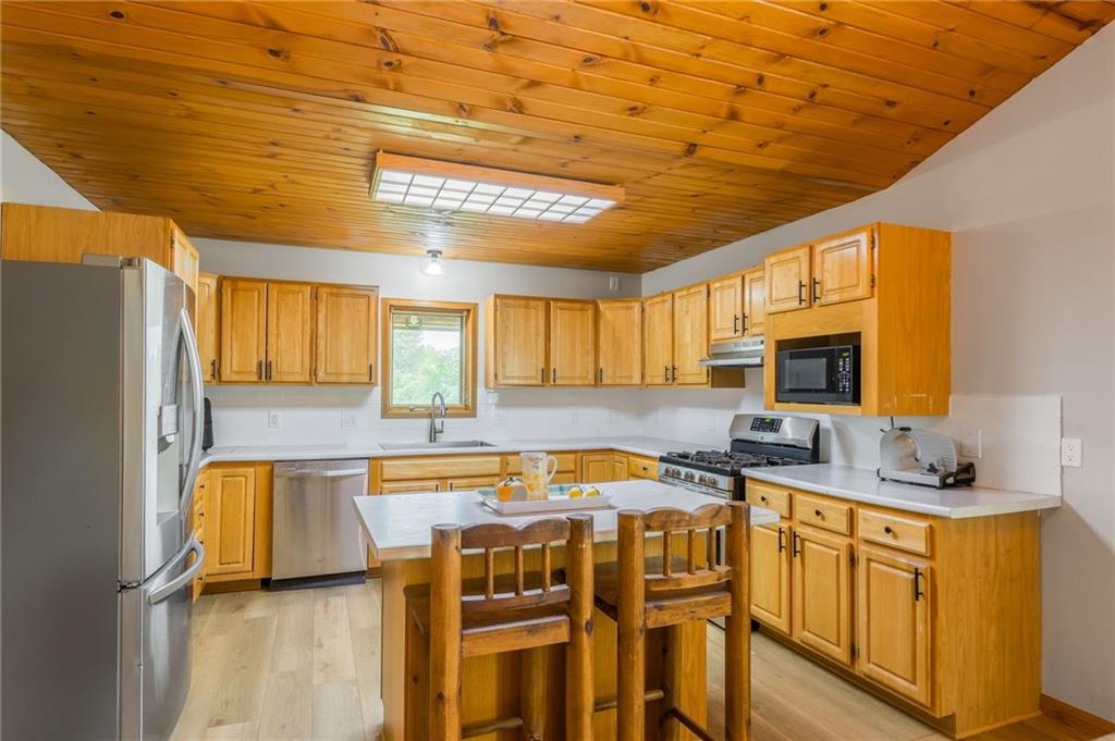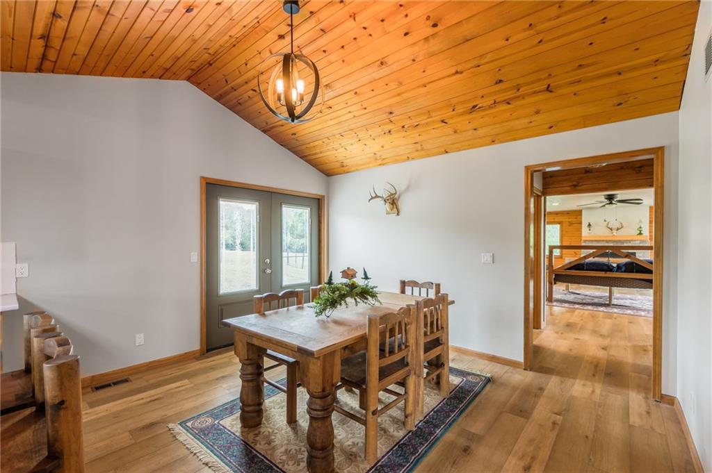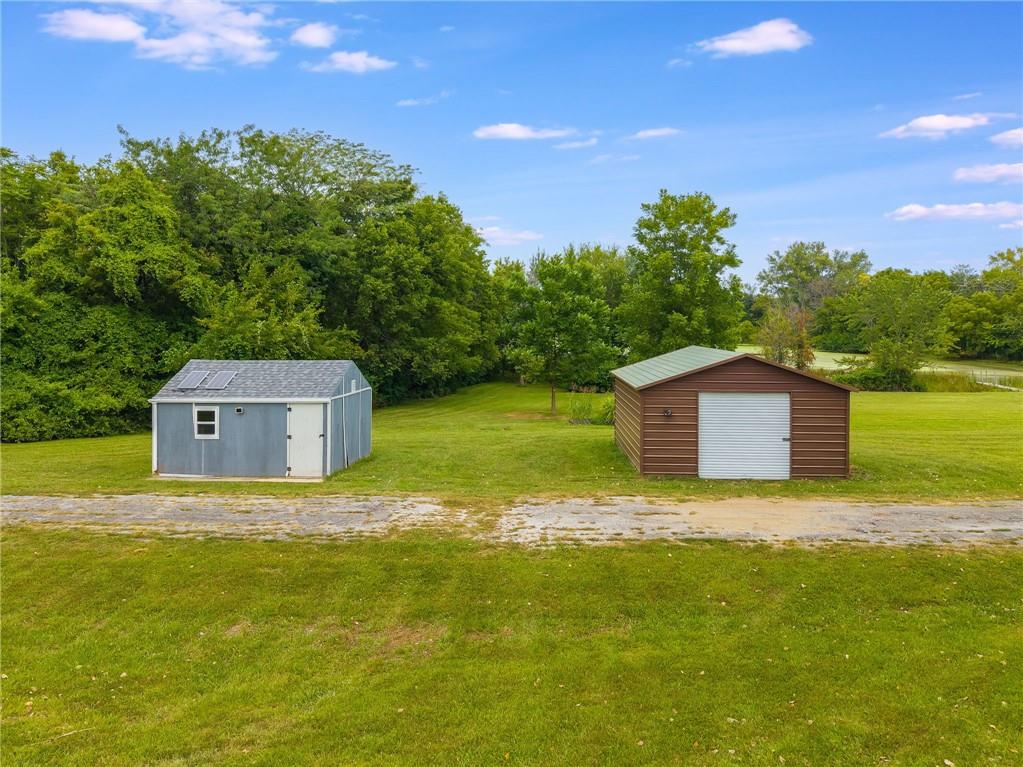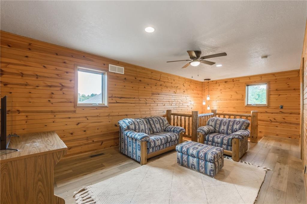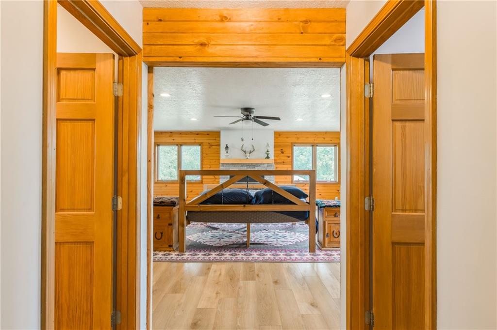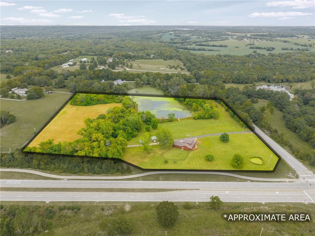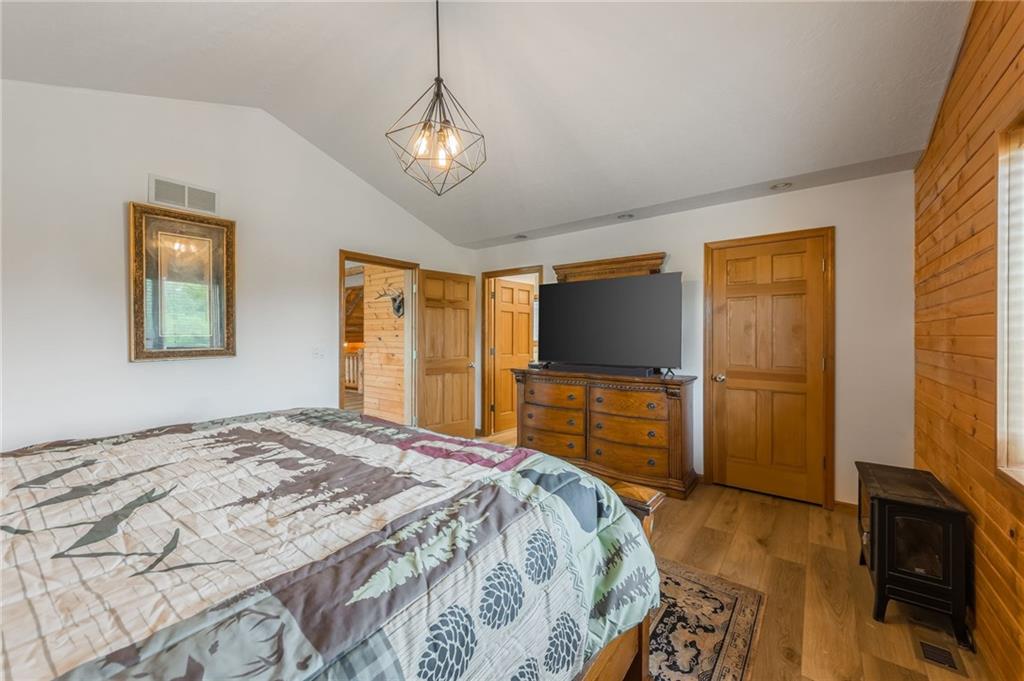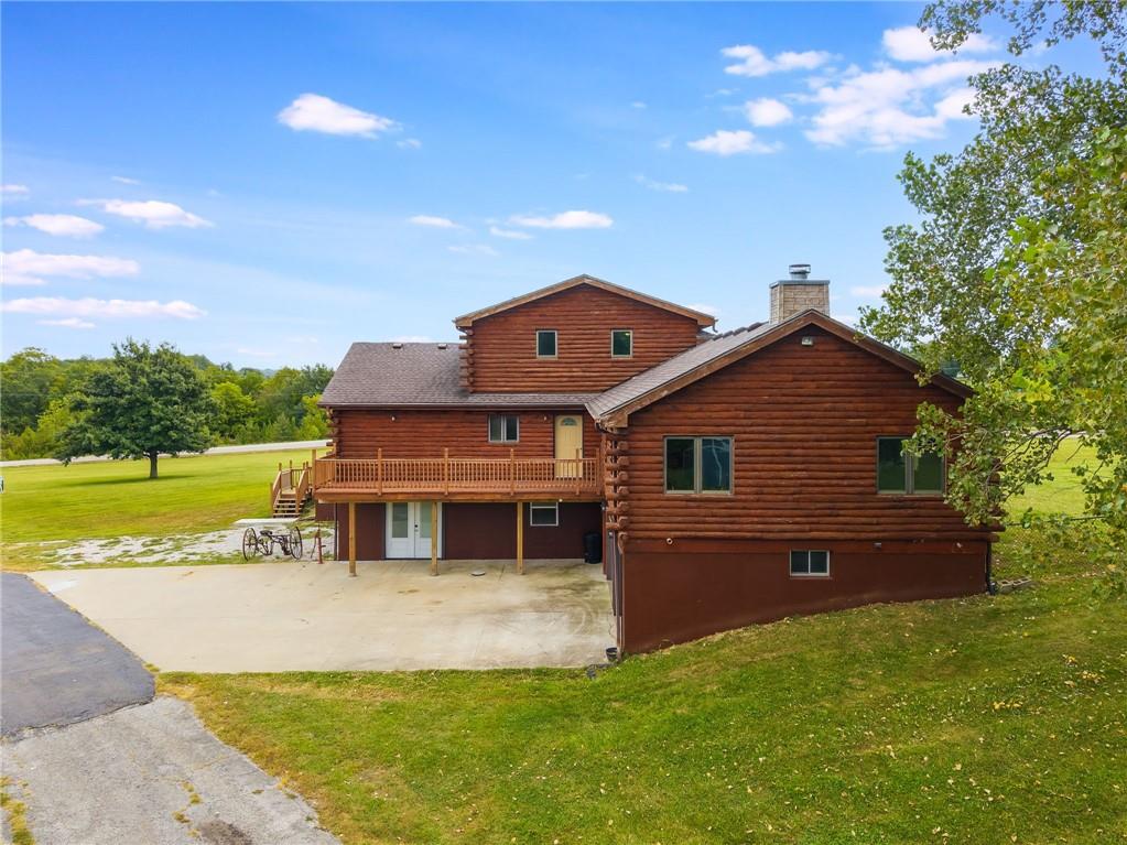 AMAZING location right off of main road for a business. Escape to your own private retreat on 8.78 acres overlooking a 3-acre stocked pond with a perfect mix of woods and pasture. This custom-built insulated log cabin offers both rustic beauty and energy efficiency, showcasing hand-carved stairs, soaring vaulted beamed ceilings, a gorgeous deck, and a dramatic two-story stone fireplace that anchors the heart of the home. There's even potential for a second apartment in the walkout basement. Step inside and you’re greeted with breathtaking views from every angle. The main level invites gathering with a spacious kitchen including tons of cabinets and center island, a cozy master suite with a walk-in closet and jacuzzi tub, and a large room with a second fireplace that could be a huge bedroom or separate living space. A door opens from the kitchen to a fenced yard great for the pets in your life. Upstairs, you find the coziest part of the home - a charming loft overlooks the great room, perfect for reading or simply soaking in the cabin atmosphere, along with another bedroom and bath. The finished walkout basement expands your possibilities with tall ceilings, a spacious gathering area, abundant storage, and an additional bedroom. Enjoy two solar-powered outbuildings and an extended 2 car garage for hobbies, storage, or workspace. Whether you’re fishing in your shared pond, exploring the woods, farming, or relaxing on the deck, this property offers the ultimate combination of privacy and lifestyle. Located less than 10 minutes from Longview Lake, shopping, dining, and amenities, this log cabin retreat is the perfect way to embrace the warm and relaxing lifestyle you are seeking.