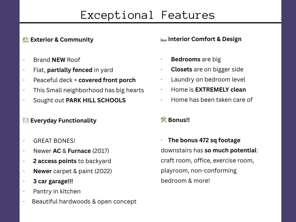 ***MUST SEE! ****Park Hill gem with over $40,000 in updates! 4 beds, 3-car garage, 2 separate living spaces + 472 sq ft unfinished space to make your own. BRAND NEW ROOF + Newer AC/Furnace, fresh carpet & paint + beautiful wood floors. Bright living space flows into Spacious open kitchen w/ pantry w/ access to peaceful deck perfect for entertaining, relaxing and everyday life. There is even a covered front porch on this one to enjoy rainstorms or watch passersby. Expansive second living area with flexible space perfect for homework, piano, library also with access to backyard. Subbasement has 472 sq ft — plenty of room to spread out and make it your own. Upstairs: 4 bedrooms, primary with big closet & bathroom. Other bedrooms are larger in size & have large closets + big laundry room on bedroom level. 2.5 BATHS. Flat, partially fenced yard. Large deck newly power washed ready for your own choice of stain color. YES!!-- the HOA is only $40/year. Did we mention location?! 3–10 mins from everything you need including schools, shops, airport, highways & downtown. Can walk to the elementary school & Line Creek walking trails! This one truly has it all!