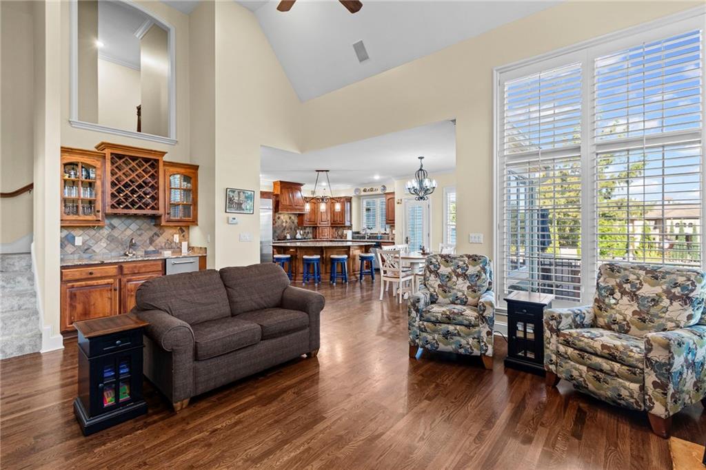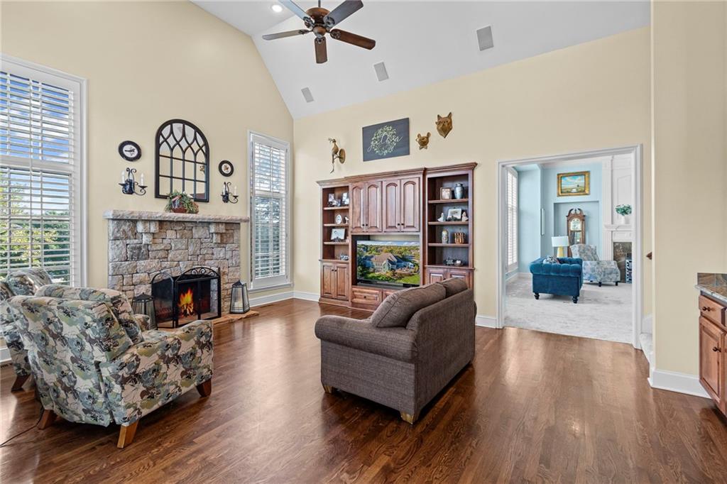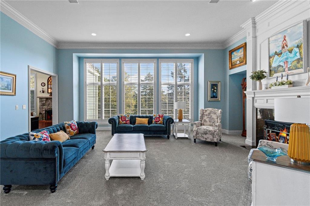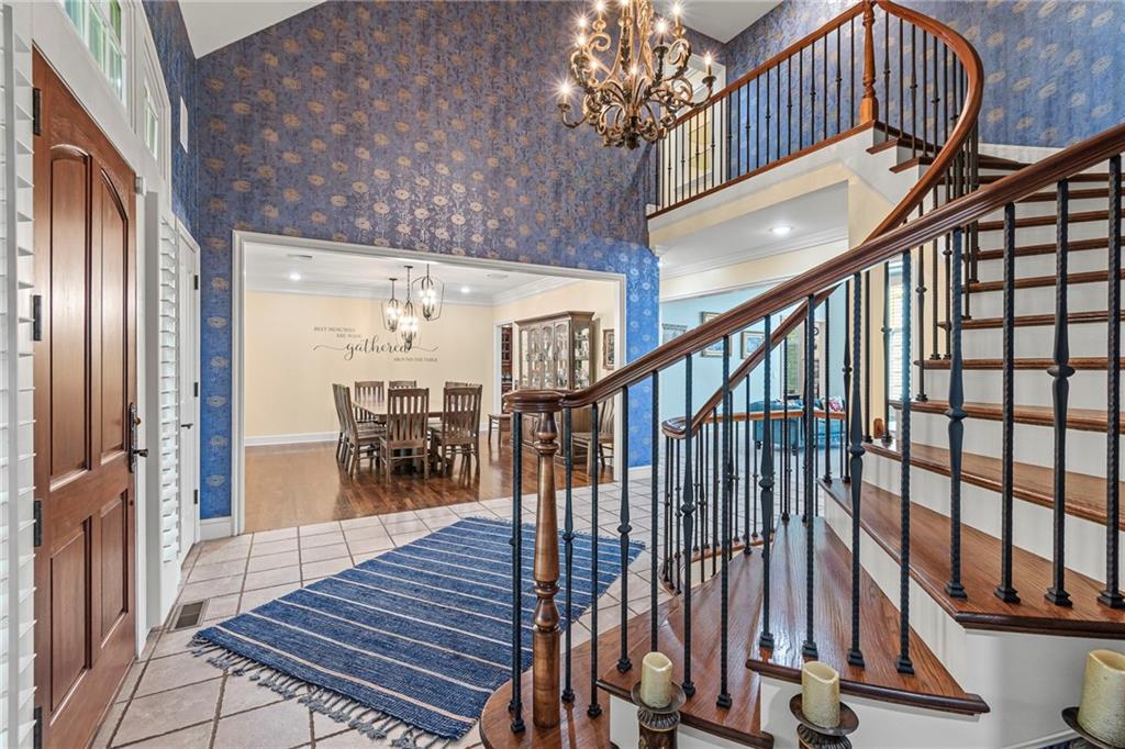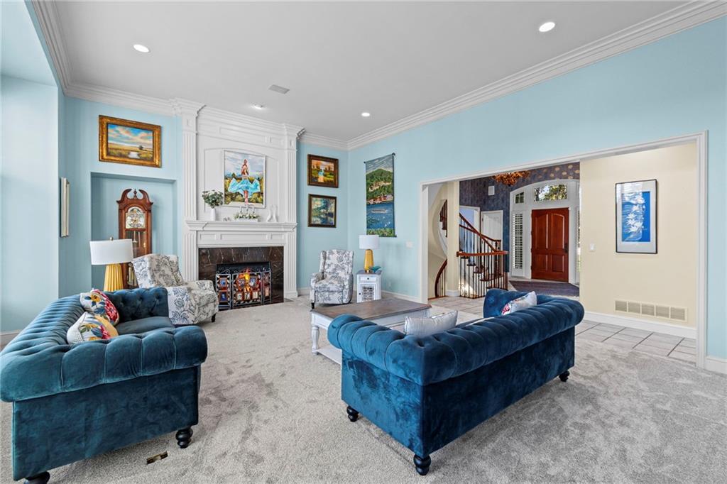 Multi-generational Estate size home with 2 primary suites and a 4 car side entry garage offers privacy on this 1+ acre lot. Additional square footage in the lower level has been professionally finished adding 2 bedrooms and 2 bathrooms to this home. Outside boast lots of trees, landscaping, a water feature, firepit & 2 patios. Upon entering you are greeted with a stunning 2 story circular staircase, plantation shutters, library with floor to ceiling built-ins, large Primary suite with new carpet, walk in shower and 2 closets. There are beautiful hardwood and carpet on the main level with a formal living and dinning room. Large chef's kitchen featuring gas cooktop, island, double ovens and pantry. The hearthroom has a beautiful stone fireplace, built ins and wet bar. Upstairs has 3 bedrooms with private baths, second laundry. New carpet upstairs in 2 bedrooms and hall. Walkout lower level w/full kitchen, rec room, 3rd fireplace, second primary suite and additional bedroom w/bath. 4 car Garage has floor to ceiling cabinets a 2nd separate staircase to the basement. This home a plenty of space for entertaining.