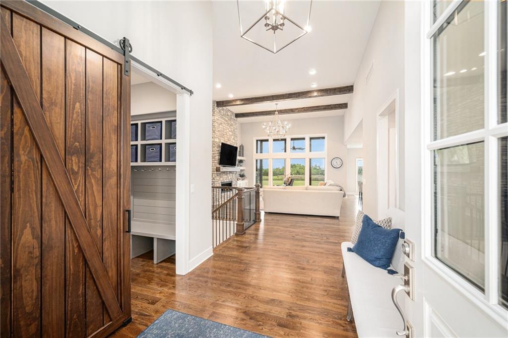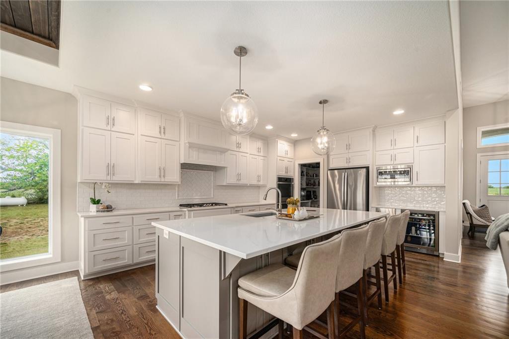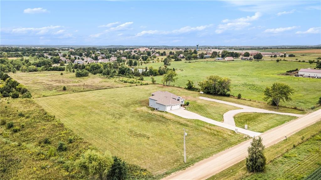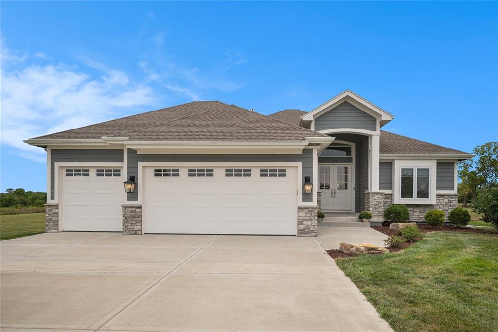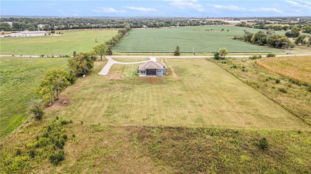 LIKE NEW Reverse 1.5 Story home on 5 acres! This custom home has a stunning double door entry with a large open layout. The great room has a stone fireplace, built-ins, 14-foot ceilings, beautiful wood beams, and large windows overlooking the backyard and patio. All white kitchen with stainless steel appliances, gas range, huge center island, built-in beverage fridge, and a walk-in pantry. Main floor primary suite with a spa-like bath and walk-in closet, plus a main floor laundry room and 2nd bedroom or office. Finished lower level with a family room, exercise room, three bedrooms, and two full bathrooms. Screened-in patio overlooking the property's private acreage. Great location close to all three Eudora schools. Convenient access to K-10. Use Google Maps for driving directions.