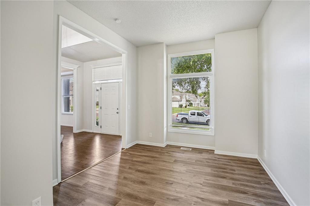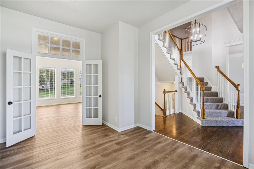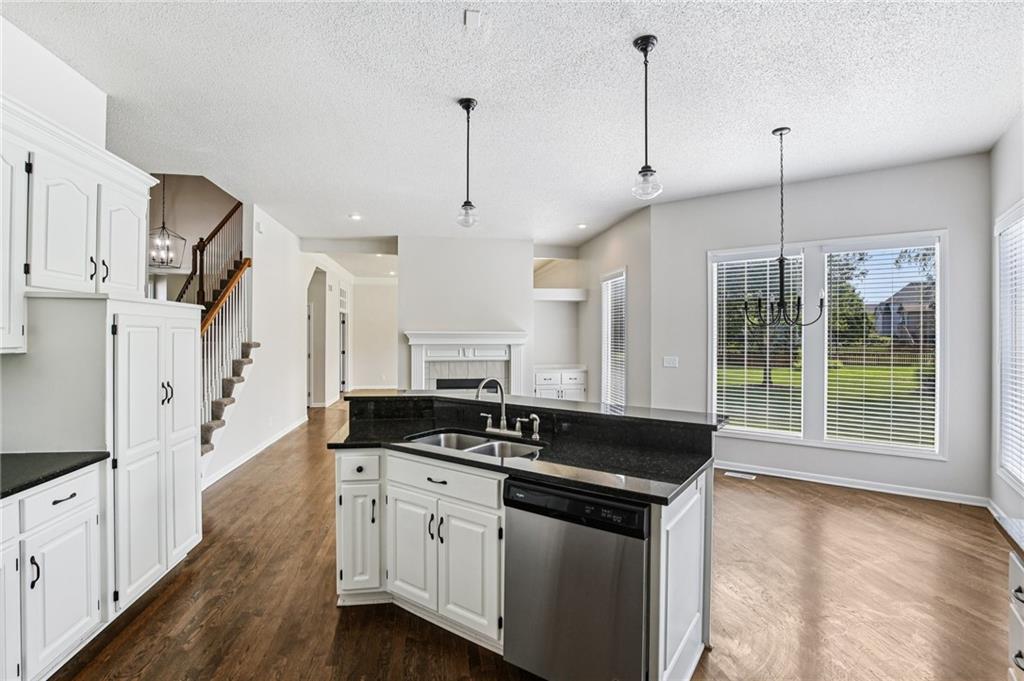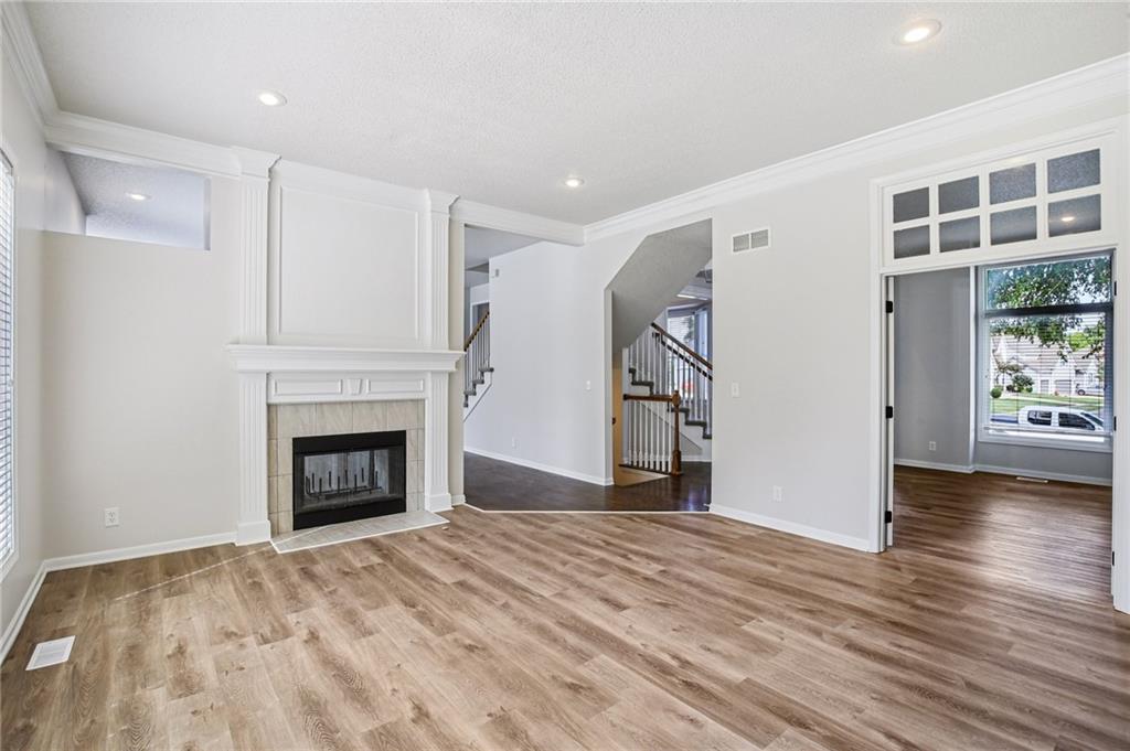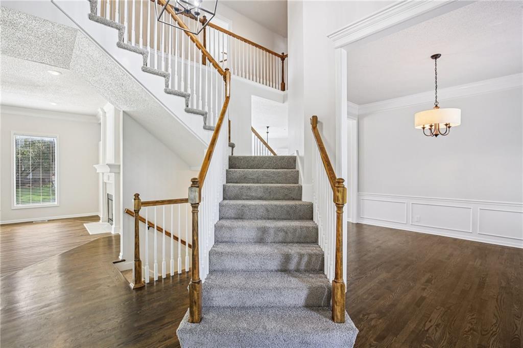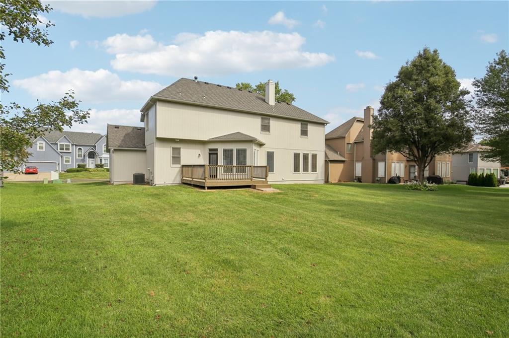 Welcome to this spacious 2-story home in the desirable Kensington at St. Andrews community. With over 3,100 square feet above grade and a finished lower level, this property offers 4 bedrooms, 3.1 baths, and a 3-car garage. The main floor includes an open living area with a see-through fireplace connecting the great room and hearth room. A formal dining space and large kitchen with granite countertops, custom cabinetry, island, and stainless steel appliances provide both function and flexibility. Hardwood flooring carries throughout much of the main level, and the home has fresh interior paint and new carpet. Upstairs, the primary suite features a spacious sitting area and two large walk-in closets, plus a private bath with double vanity, jetted tub, and separate shower. Secondary bedrooms include one with a private ensuite and two that share a hall bath. Laundry is conveniently located on the bedroom level. The finished basement provides a recreation room and half bath, extending your living and entertaining options. Outdoors, enjoy a covered deck, patio, and a landscaped, treed lot with in-ground sprinklers. Community amenities include two swimming pools, trails, and a playground, all within the Blue Valley School District. Conveniently located near shopping, dining, and highway access, this home combines generous space with a sought-after neighborhood setting.