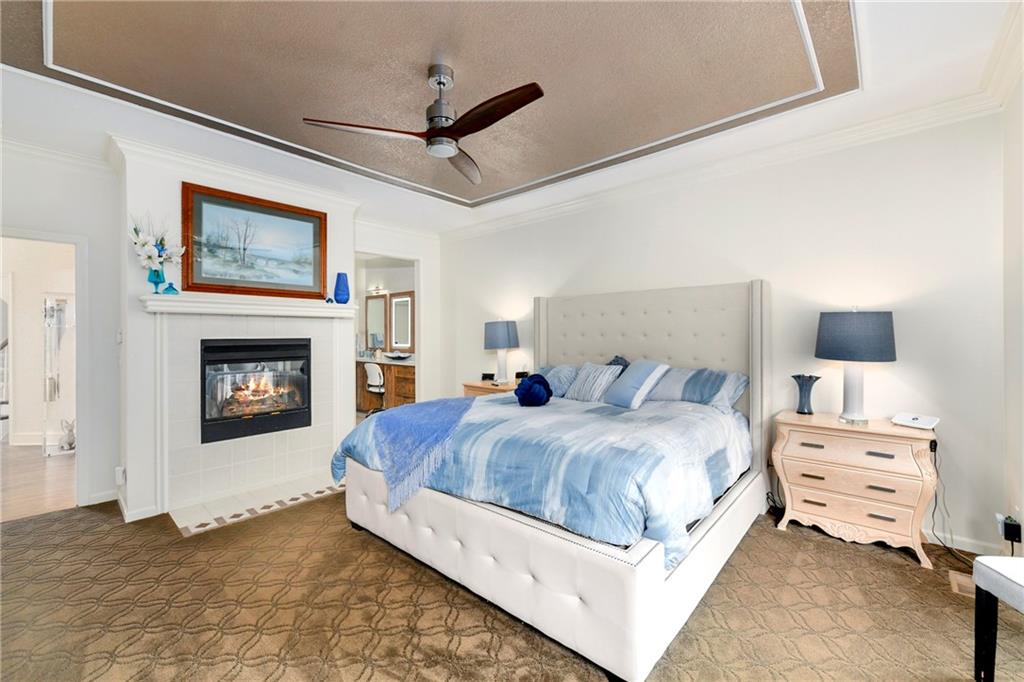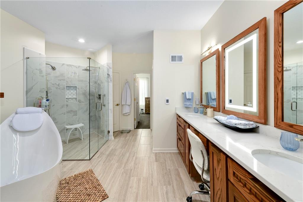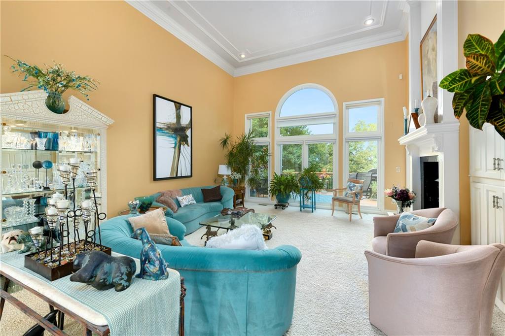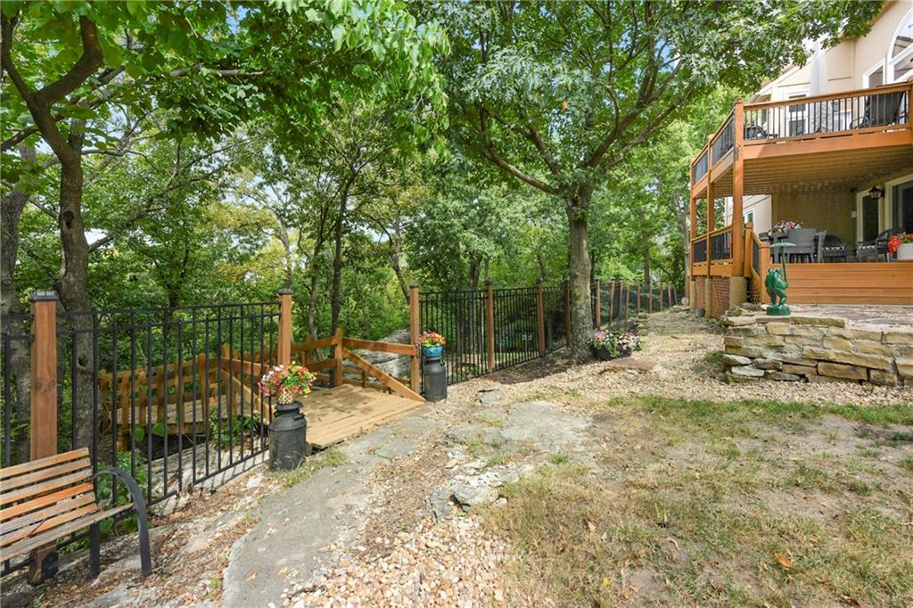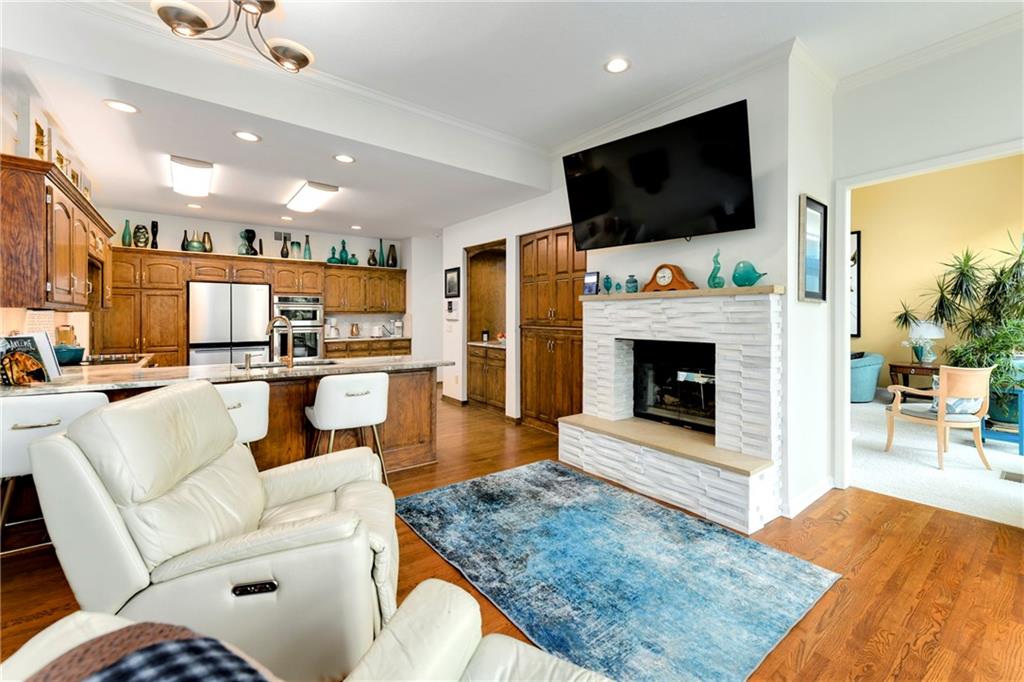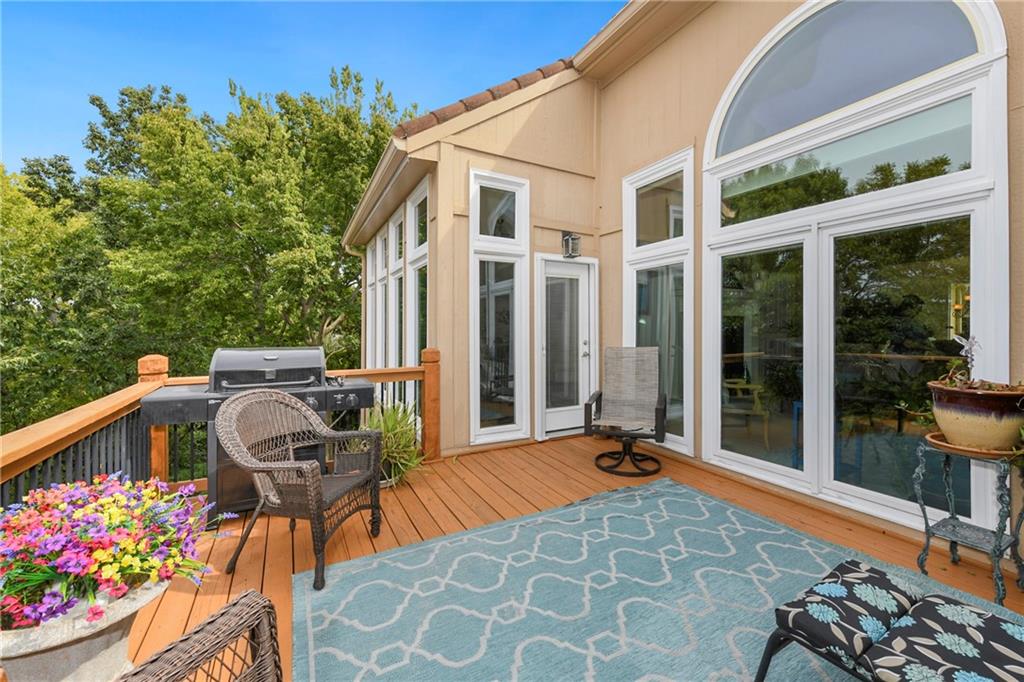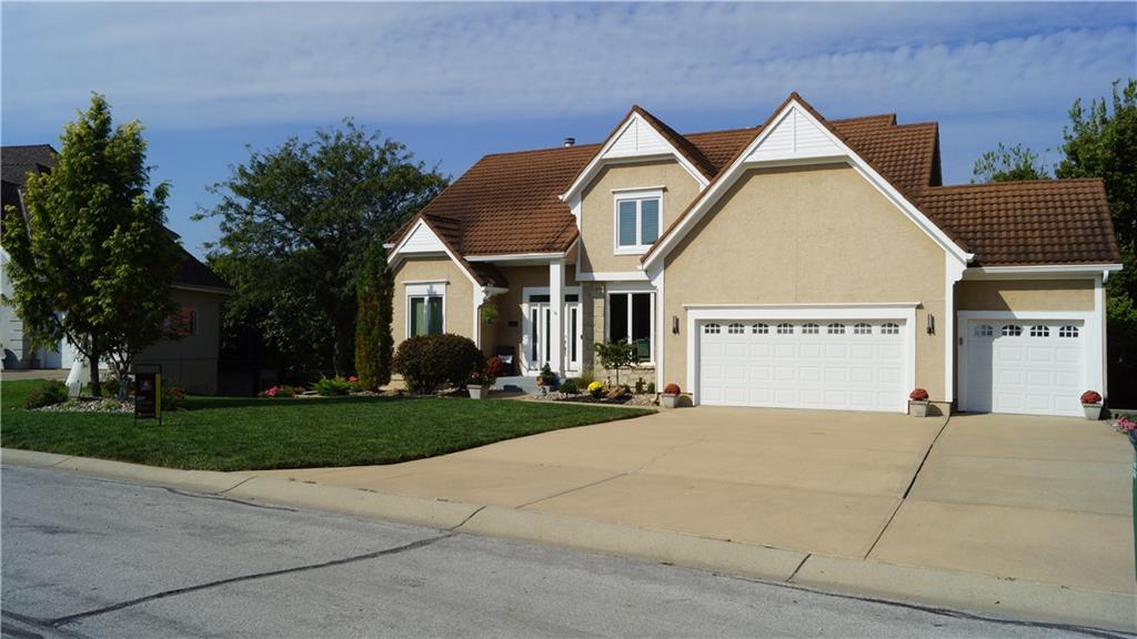 Highly desirable Arbores neighborhood in the Blue Springs school district. Neighborhood includes two lakes (with fishing), and beautiful streets for strolling. Yard professionally landscaped within the last year. Main level includes a two story foyer, Great Room, formal dining, large eat in kitchen with hearth room, laundry, powder room, access to upper deck and primary suite. Formal dining room and Great Room are open plan with partial opening to kitchen. Hearth room, included within kitchen space, features a see thru fireplace to Great Room. Kitchen/Hearth room/Great room have wall to wall windows with great view of trees. Large primary bedroom has tray ceiling, wall to wall windows and recently remolded master bath with heated tile floors, custom designed dual vanity and large zero entry shower and soaker tub in front of the see thru fireplace between master bedroom and bathroom. Upstairs are 3 large bedrooms with walk in closets, one bedroom has private bath with a Jack/Jill bathroom between the other 2 bedrooms. Upstairs also includes a large cedar closet for off-season clothes storage. Upstairs has a separate HVAC system. Extra large lower level with walkout to lower deck. Lower level is open plan and includes a full bathroom, kitchenette area with sink/cooktop/refrigerator/cabinets, large gas fireplace with mounted tv and two person office area. Plenty of room for entertaining- large gatherings in front of TV, a pool/game table and dining table. Lower level also has 3 large storage closets. Unique and private backyard with decorative fencing, and ramp to lower area ideal for kids playset or gardeners paradise. Three car garage with epoxy floors, shelving and work bench.