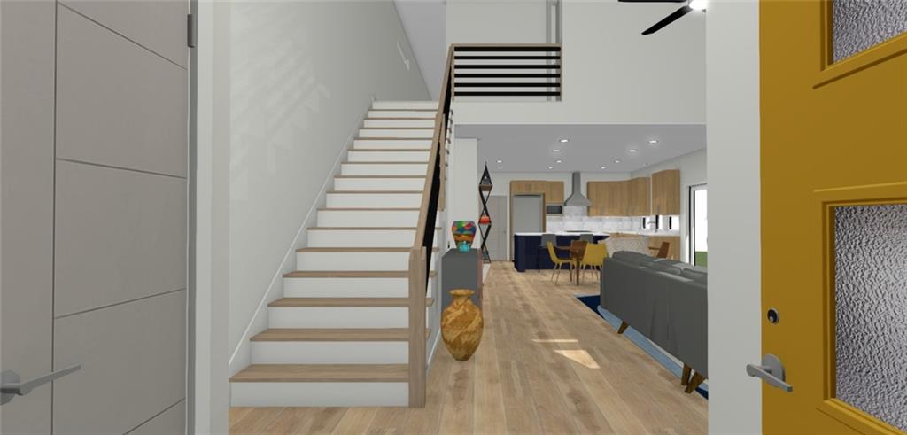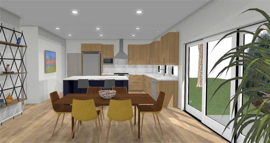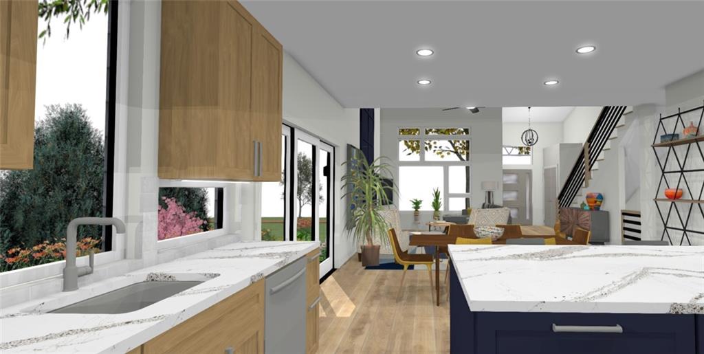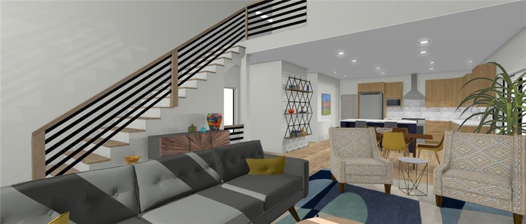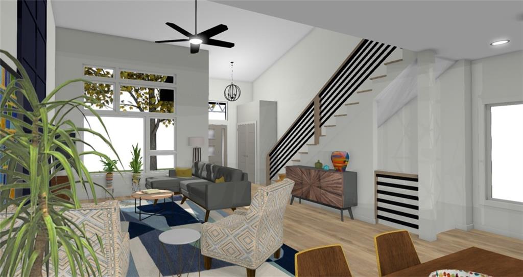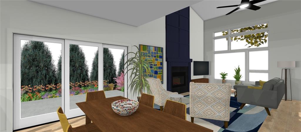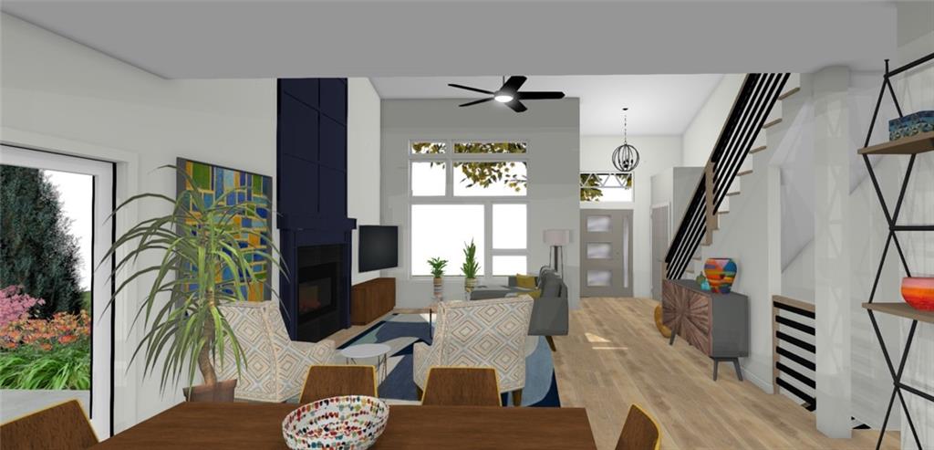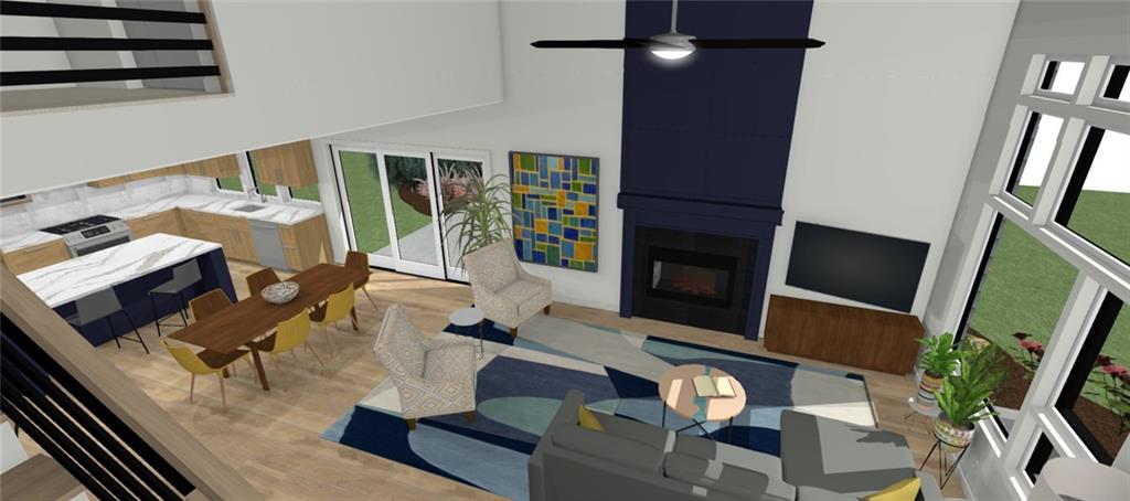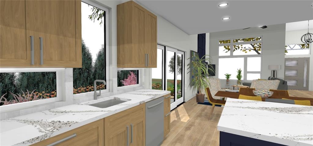 Thoughtfully designed contemporary home blends modern style, comfort, and efficiency. This two-story home perfectly bridges contemporary design with our beloved historic East Lawrence elements; the front is outlined by a revitalized brick sidewalk that sits under a well-established catalpa tree. Custom built newels and handrail on classic white oak stair treads greets you with architectural elegance as you walk in. Seamless flow on main level brought together by 7-inch white oak floor, custom designed mantle encasing gas fireplace balances modern and traditional flair, dramatic vaulted ceiling in living room. Kitchen equipped with large kitchen island, walk-in pantry and gas range. Just off the main level a spacious patio extends your living space outdoors to nicely landscaped, tree-shaded yard. Upstairs, laundry is conveniently located near two bedrooms that share full bathroom with separate vanity sinks. The primary suite is a true treat with coffered ceilings, spacious walk-in closet, and an extended double vanity with a fully tiled walk-in shower. Natural lighting sprinkled all though out, adds to the daylight basement equipped with a wet bar creating the perfect place for entertaining. This home was built for quality at every turn starting with superior 2x6 framing and blown-in insulation surround intentionally improving the laundry, bathrooms and overall energy efficiency. Experience the East Lawrence charm all while enjoying the luxury of a new home boasting 4 Bedrooms, 4 bath areas and an oversized attached 2 car batt insulated garage near downtown Lawrence.