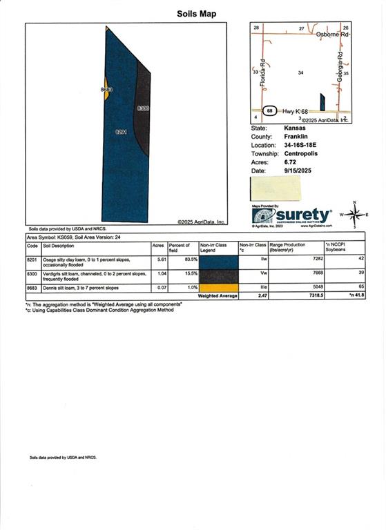 Heavily Wooded 6.7 Acres located on K-68 Hwy. This is an inherited property and Seller has very limited knowledge. There is a Water Well but there is no pump. There was an old septic tank but Seller has no knowledge of it. There use to be a small pond toward the NE corner of property but Seller has not been on the property in years. There is a 25 x 12 Shed built in 1980. There is no easement to the property at this time but Seller is in the process of acquiring an easement on an existing driveway that adjoins the property on the West in the SE corner of adjoining property and has been used for many years but there was never an easement for this property. There is no Sellers Disclosure. Property is in the 100 year flood plain. There is a creek on the property Aerial map, created with Surety Pro paid subscription & used with permission from AgriData, Inc.