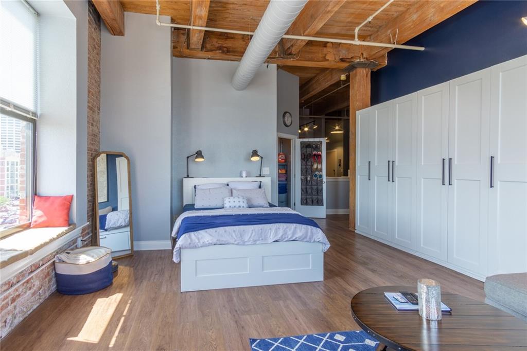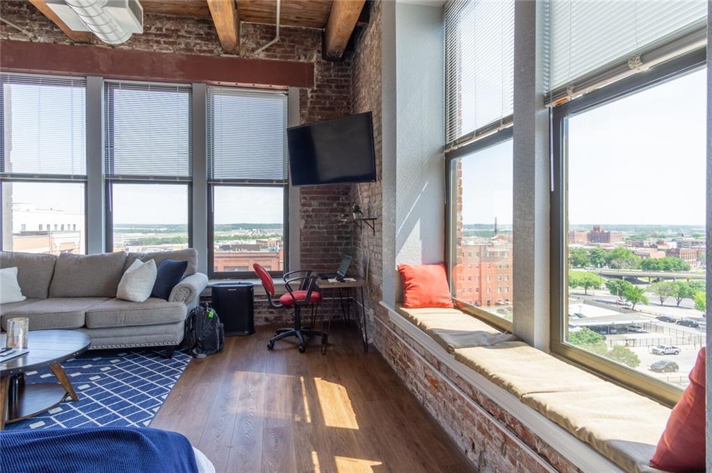 Bright corner energy, skyline views, and serious style make this studio simply impossible to resist. Plus, it comes complete with furnishings, making it rental-ready from day one. Oversized windows fill the space with natural light, highlighting a mix of industrial edge and cozy comfort. Wood floors, exposed brick, open ductwork, and a tongue-and-groove ceiling adds depth and character, built-ins provide practicality, and a window seat offers a quiet spot for morning coffee or a good book. The tucked-away kitchen includes all the essentials, ample cabinet space, and room for a small eat-in area. A generously sized bathroom and in-unit laundry add everyday convenience. Soho Lofts sits in the historic Garment District, putting dining, bars, shops, and entertainment right at your doorstep. Residents also enjoy a rooftop deck with panoramic skyline views, a fitness center, sauna, yoga room, and a club room for gathering with friends. The River Market, Power and Light, and the Crossroads are just a quick stroll or streetcar ride away. Garage parking is available for lease at an additional cost. Whether you’re searching for a smart investment (think low HOA with 1 month minimum rental), a downtown retreat, or your first loft, this cutie is full of possibilities.