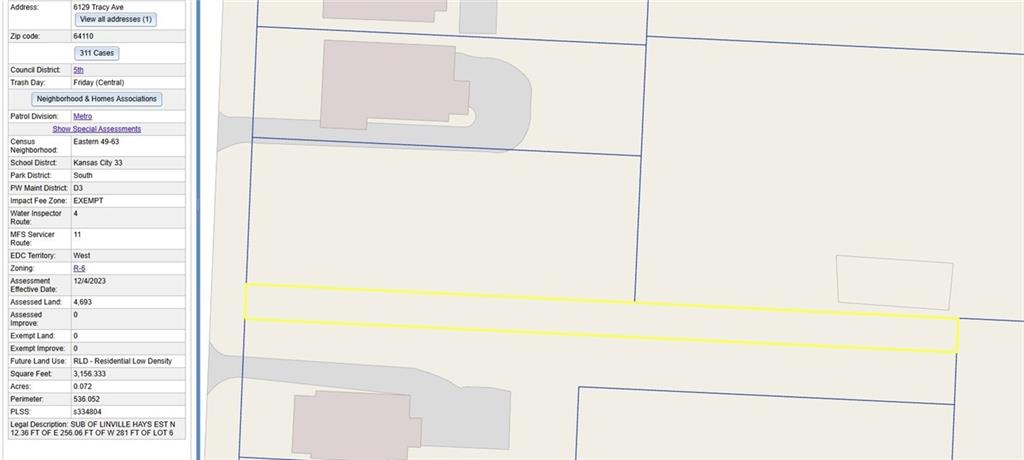 Two adjoining vacant lots offered together at 6127 & 6129 Tracy Ave, Kansas City, MO. Combined size approx. 10,600 sq ft (0.24 acres). Zoned R-6 Residential, allowing single-family construction (meets minimum lot size). Lots are level, cleared, partially fenced, with utilities available at street (buyer to verify). Great central location near UMKC, Rockhurst, Troost Corridor, and Hwy 71. Quick drive to Downtown, Plaza, and Brookside. Ideal for builder, investor, or custom home site. Rare chance to secure a double lot in an up-and-coming neighborhood. The lots at 6127 Tracy Ave and 6129 Tracy Ave, Kansas City, MO 64110, will be sold together as a package. Please refer to MLS # 2575726.