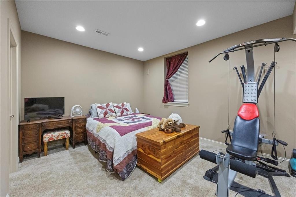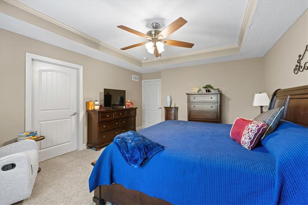 Beautiful, spacious reverse 1.5-story ranch on a premium corner lot in Nottington Creek! This well-maintained home features an open floor plan ideal for entertaining. Warm and welcoming,the main level features a home office/bedroom just off the entry, large living area with fireplace, and a generous kitchen with ample dining space. The kitchen features upgraded cabinetry, granite counters, and pull-outs in the double pantry. This level also features a secondary bedroom, full bathroom, and the primary suite. The primary includes an en suite with separate jetted tub and shower, dual vanities with upgraded cabinetry and granite counters, and a walk-in closet. The lower level is sure to wow with a ton of space! An expansive rec space gives you plenty of options with a kitchenette/bar and built-ins surrounding a second fireplace. You’ll also find another bedroom and full bathroom on this level along with the 27x11 storage room. This home features new carpet with premium padding on the main floor, ceiling fans throughout, a fully fenced backyard, beautiful new landscaping, an in-ground sprinkler system and spacious deck. This lovely neighborhood features a community pool and the trail system.