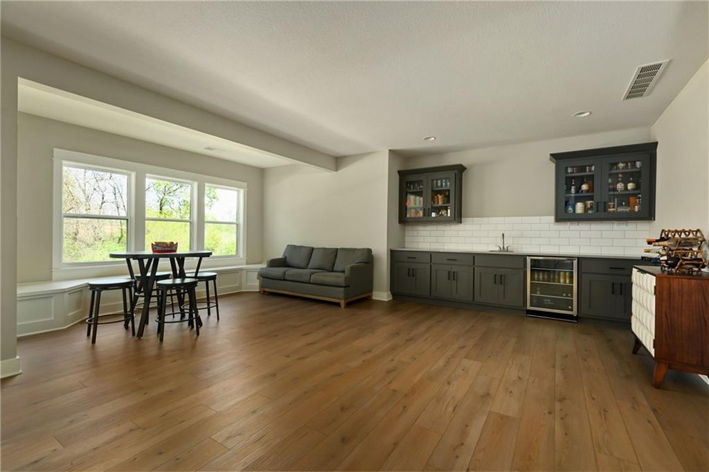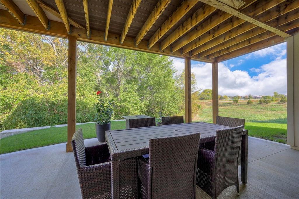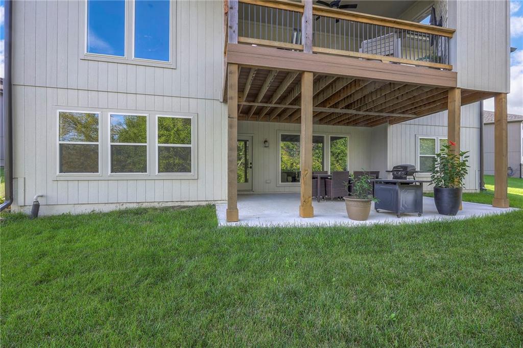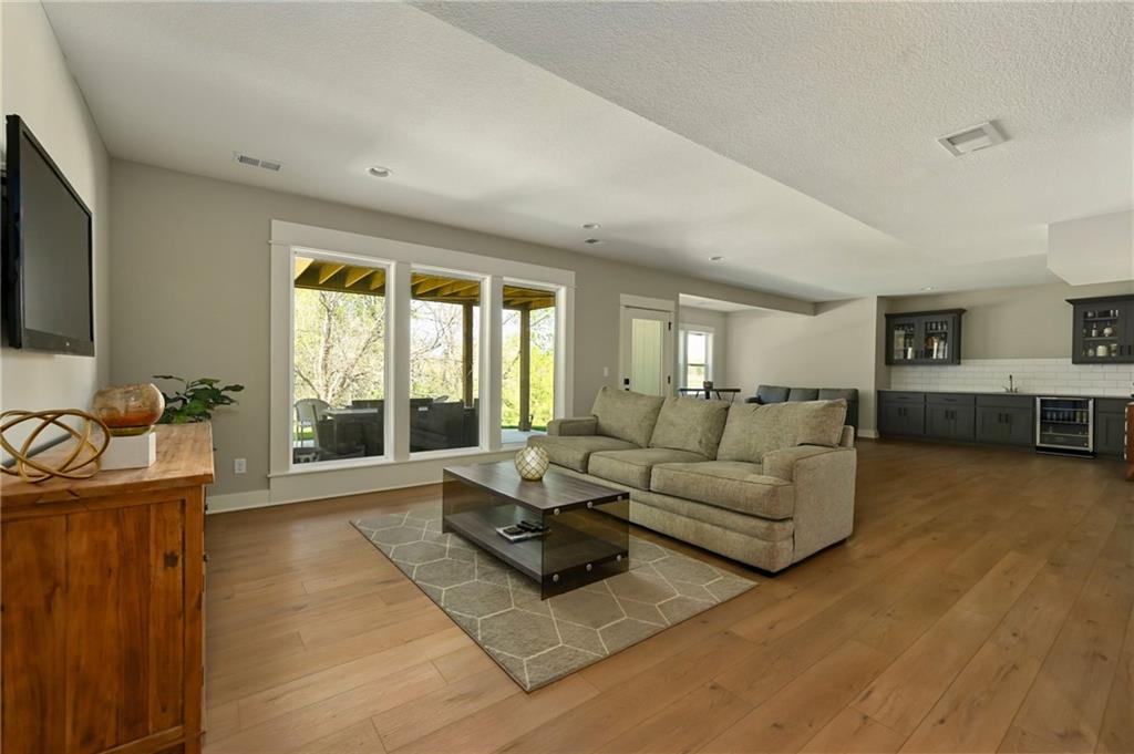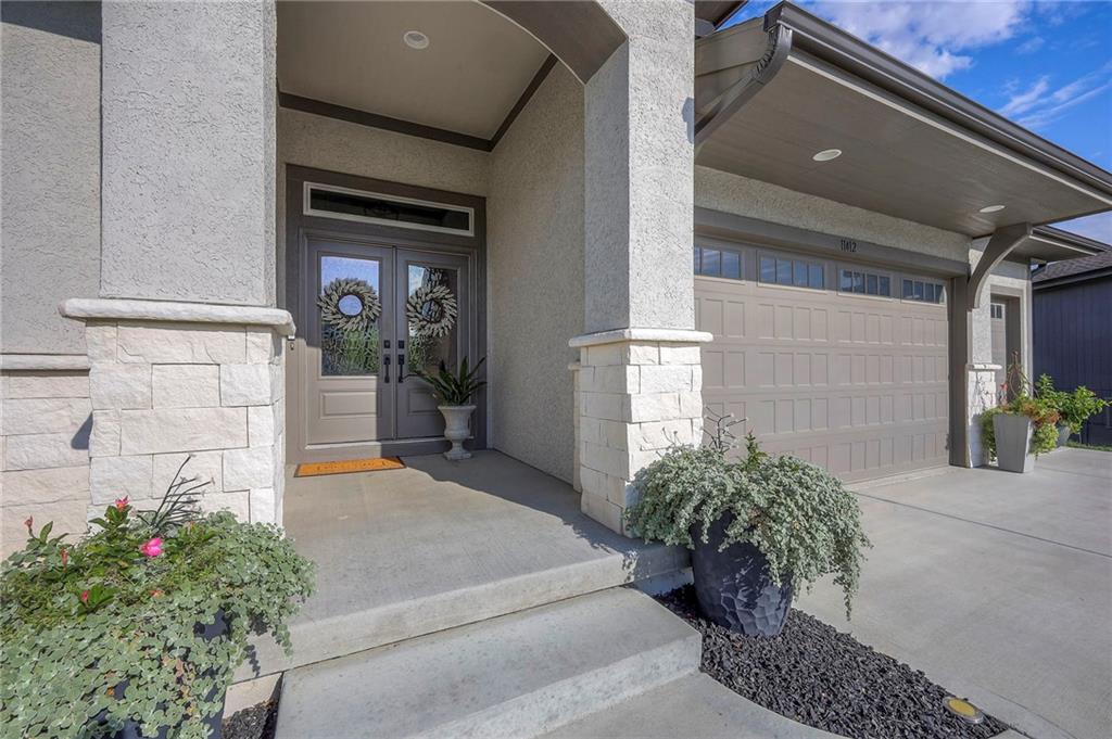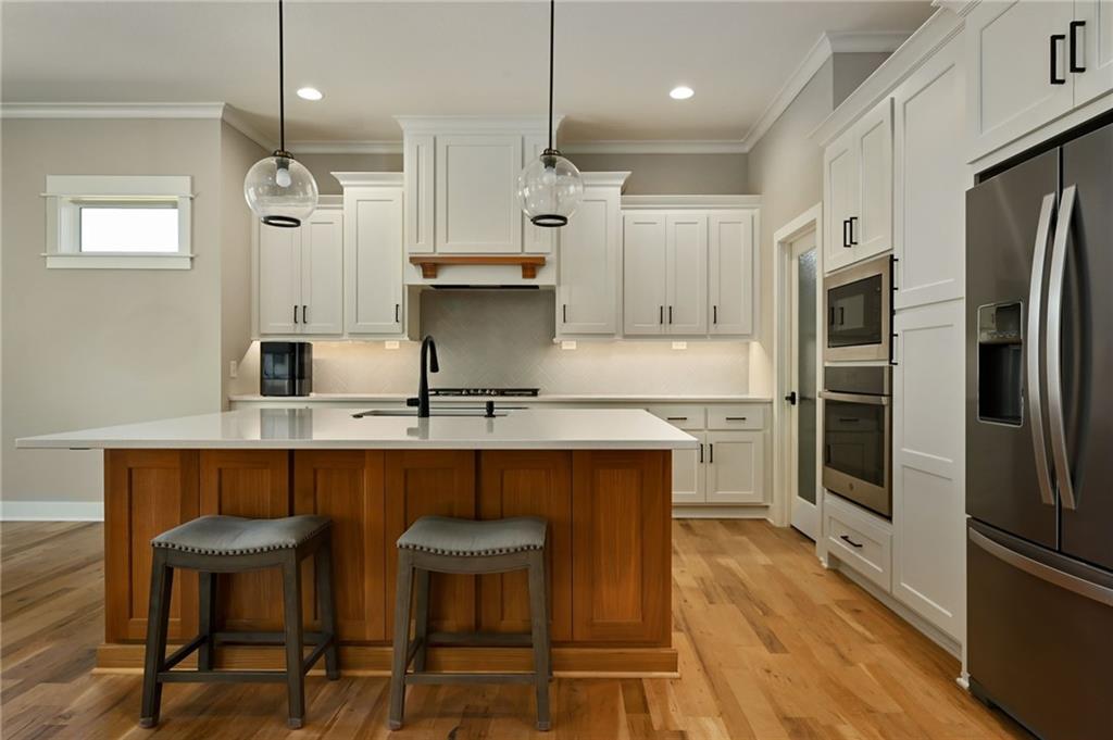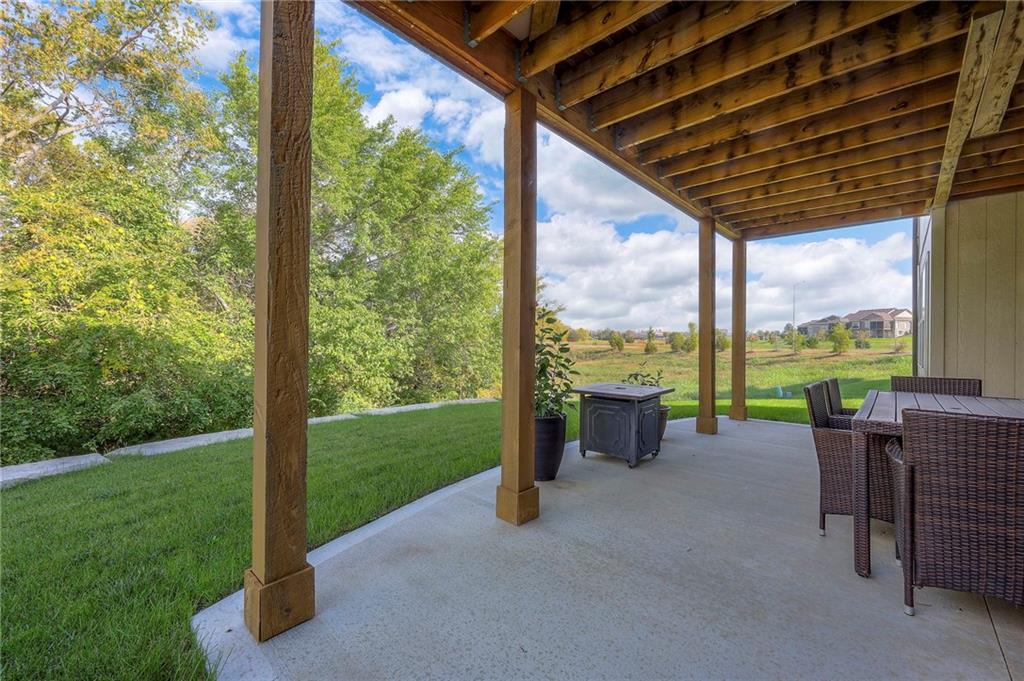 Covington Creek Retreat – Modern Comfort Surrounded by Nature Welcome to a home that beautifully blends modern luxury with everyday comfort. Nestled against a protected green space in one of Olathe’s most desirable neighborhoods, this 2022 reverse 1.5-story was thoughtfully designed for both effortless living and unforgettable entertaining. Step through double glass doors into a bright, open main level with soaring 14-foot ceilings and upgraded Loba hardwood floors throughout. The Great Room’s coffered ceiling, tiled fireplace, and Alderwood mantle create a warm centerpiece, while a wall of north-facing windows fills the space with natural light and peaceful green views. The kitchen is a true gathering spot—featuring white Quartz countertops, a large storage island, 5-burner gas range, double ovens, and a spacious walk-in pantry. The adjacent dining area opens to a covered TREX deck with its own fireplace, perfect for cozy evenings or weekend get-togethers. The main-floor primary suite offers a private retreat with hardwood floors, plantation shutters, and a spa-style bath complete with dual Quartz vanities, a tiled walk-in shower, and a generous closet. A guest bedroom, full bath, and laundry with sink complete the main level. Downstairs, the walk-out lower level offers two additional bedrooms, a full bath, and a large rec room with wet bar—ideal for movie nights or hosting friends. Upgraded LVP flooring adds durability, while a covered patio and landscaped yard provide a serene outdoor escape. With its 3-car garage, sprinkler system, Google Fiber, and access to the neighborhood pool and playground, this Covington Creek home combines thoughtful design, modern features, and a sense of warmth that makes it truly special.