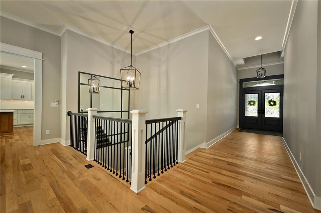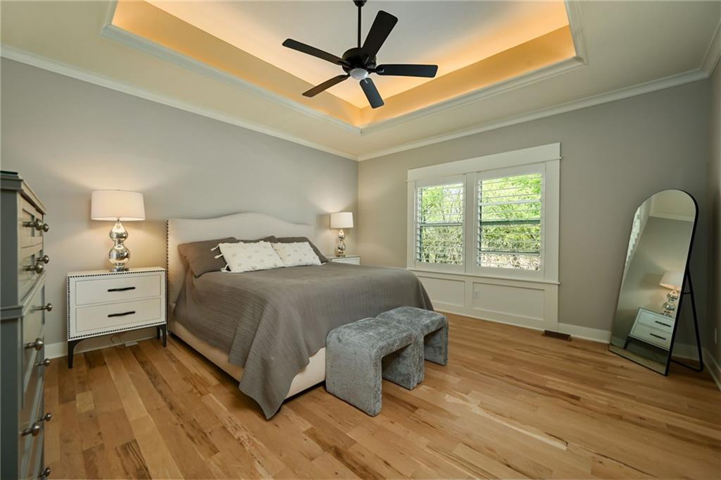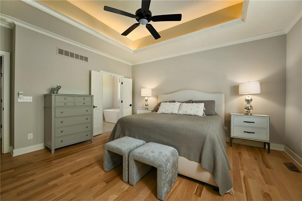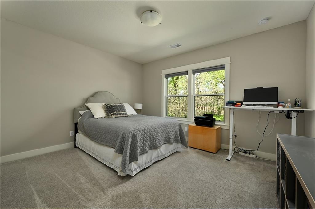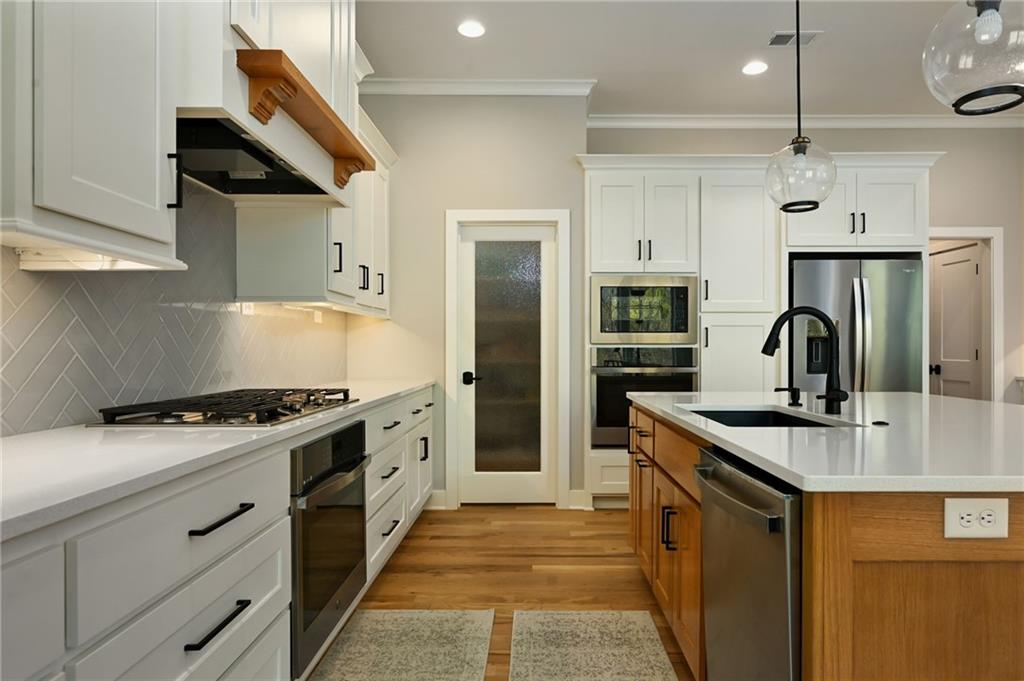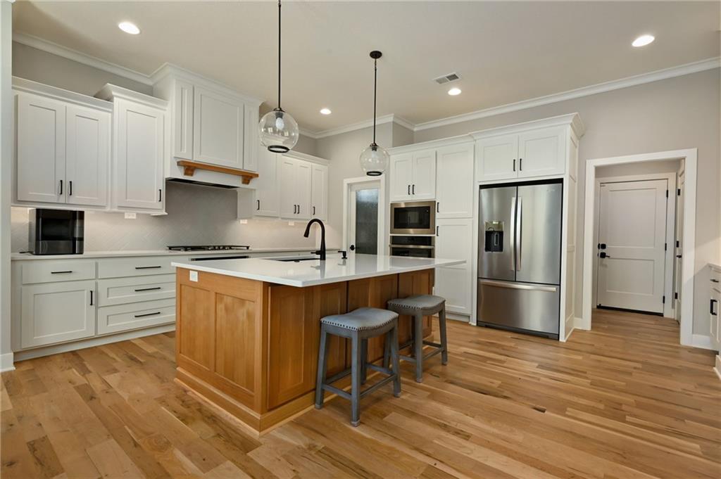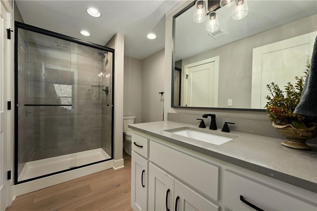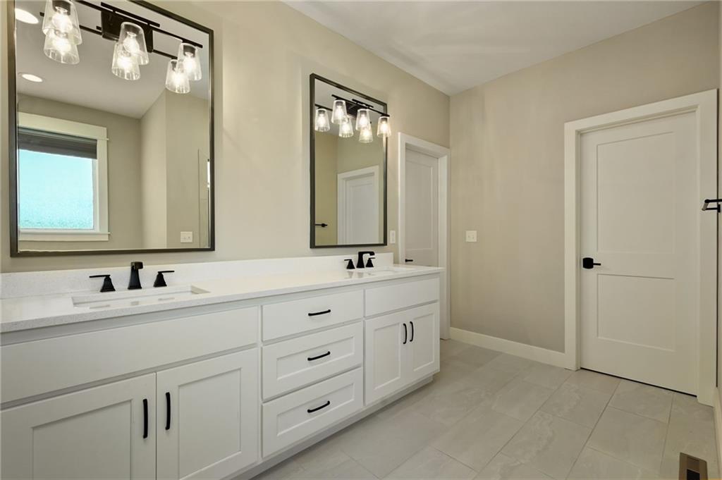 Covington Creek Retreat – Modern Comfort Surrounded by Nature Welcome to a home that beautifully blends modern luxury with everyday comfort. Nestled against a protected green space in one of Olathe’s most desirable neighborhoods, this 2022 reverse 1.5-story was thoughtfully designed for both effortless living and unforgettable entertaining. Step through double glass doors into a bright, open main level with soaring 14-foot ceilings and upgraded Loba hardwood floors throughout. The Great Room’s coffered ceiling, tiled fireplace, and Alderwood mantle create a warm centerpiece, while a wall of north-facing windows fills the space with natural light and peaceful green views. The kitchen is a true gathering spot—featuring white Quartz countertops, a large storage island, 5-burner gas range, double ovens, and a spacious walk-in pantry. The adjacent dining area opens to a covered TREX deck with its own fireplace, perfect for cozy evenings or weekend get-togethers. The main-floor primary suite offers a private retreat with hardwood floors, plantation shutters, and a spa-style bath complete with dual Quartz vanities, a tiled walk-in shower, and a generous closet. A guest bedroom, full bath, and laundry with sink complete the main level. Downstairs, the walk-out lower level offers two additional bedrooms, a full bath, and a large rec room with wet bar—ideal for movie nights or hosting friends. Upgraded LVP flooring adds durability, while a covered patio and landscaped yard provide a serene outdoor escape. With its 3-car garage, sprinkler system, Google Fiber, and access to the neighborhood pool and playground, this Covington Creek home combines thoughtful design, modern features, and a sense of warmth that makes it truly special.