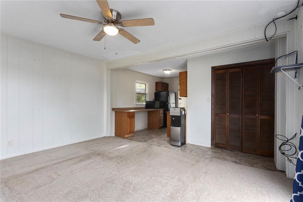 Unfurnished living room with light carpet, ceiling fan, wood walls, and a desk