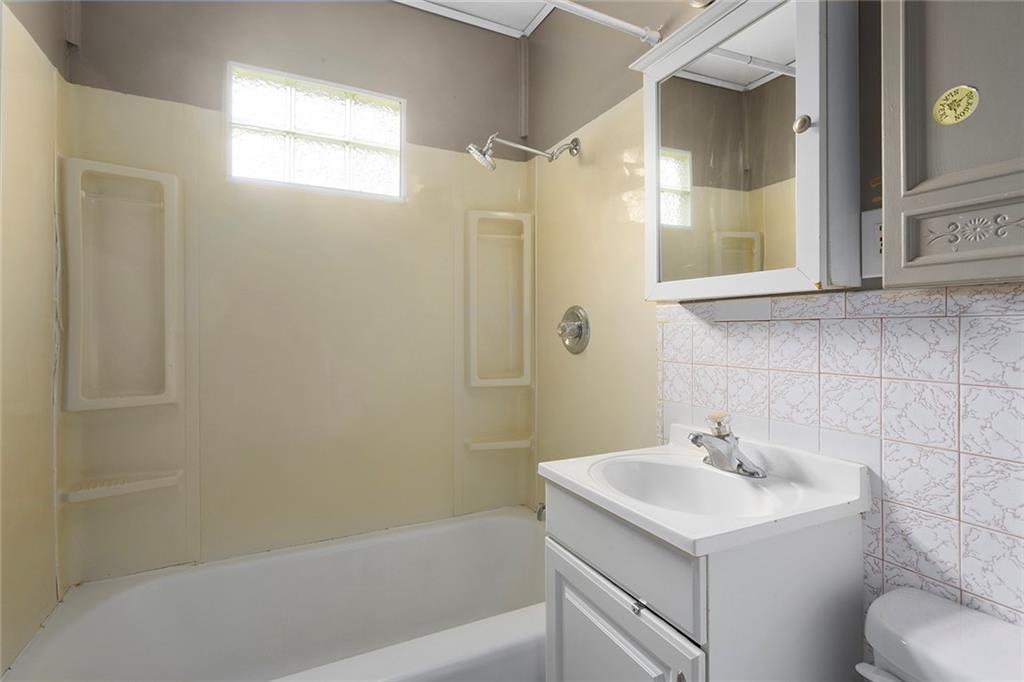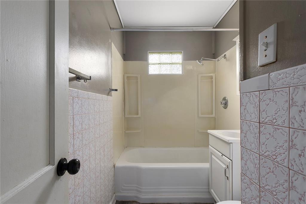 Bathroom with vanity, shower combination, healthy amount of natural light, backsplash, and tile walls