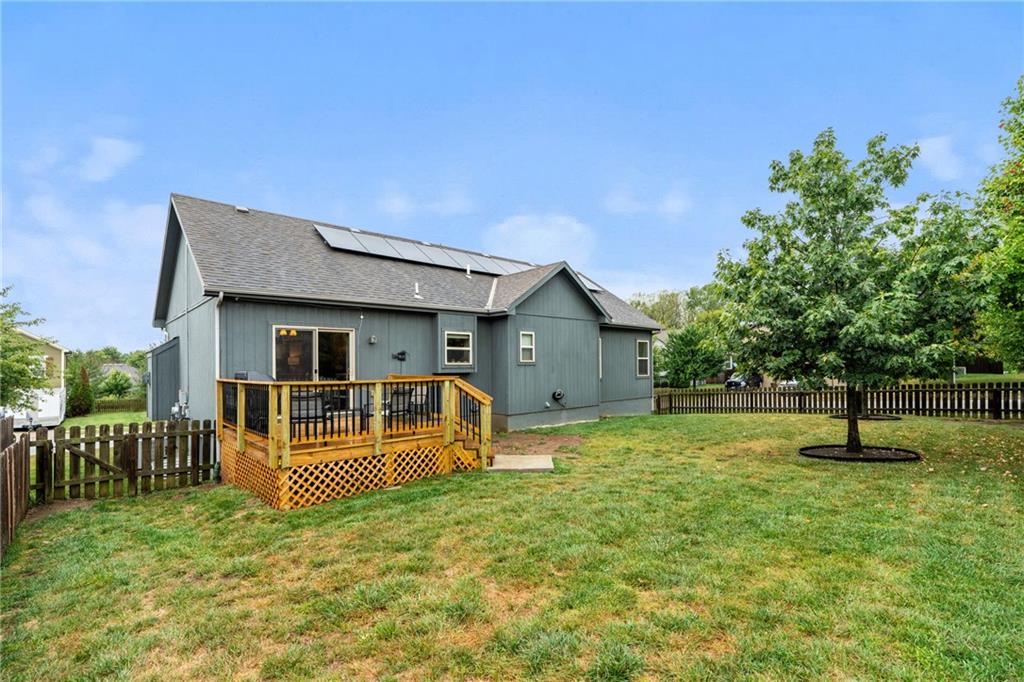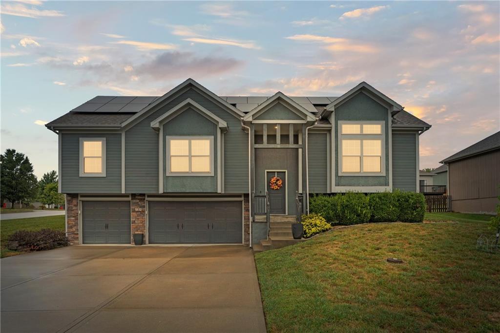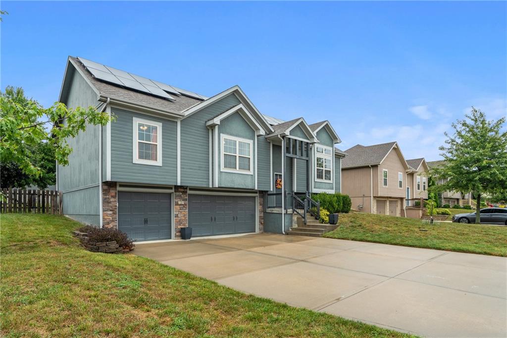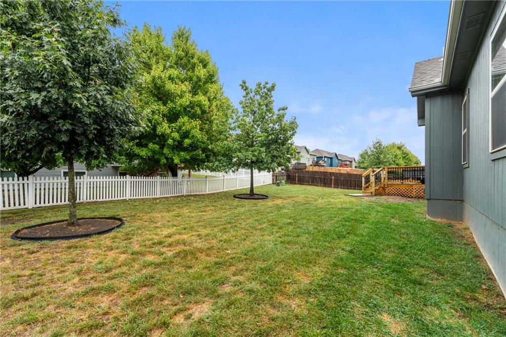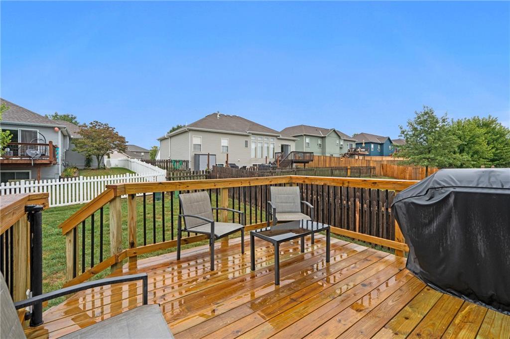 STUNNING and meticulously maintained 4-bed, 3-bath home on a corner lot/fenced yard with upgrades galore! Living area is open to kitchen with soaring vaulted ceilings, cozy gas fireplace, and an expansive kitchen with a giant oversized granite island, newer dishwasher/microwave, under-cabinet lighting, and stylish industrial pendants/chandelier. The primary suite offers a spa-like retreat with double vanities and abundant counter space, a whirlpool tub, and walk-in closet. 2 more good sized bedrooms and linen closet line the hall with a large walk-in laundry room has extensive built-in shelving for organization/storage. Iron spindles accent the staircase leading to a separate lower-level living area featuring its own bedroom, FULL bath, and separate living space! Step outside to enjoy the brand-new extended deck with black metal spindles and refreshed landscaping. A central vacuum system provides convenient quick cleaning! Located in Chapman Farms and down the street from the elementary school, this home offers easy access to shopping, dining, and amenities in both Blue Springs and Lee’s Summit! Priced to sell, must see!