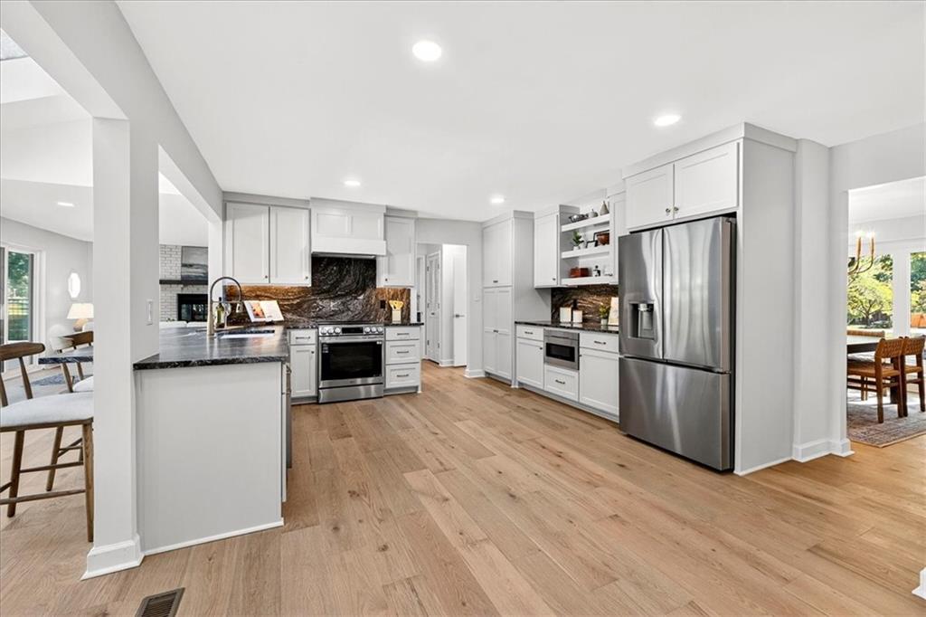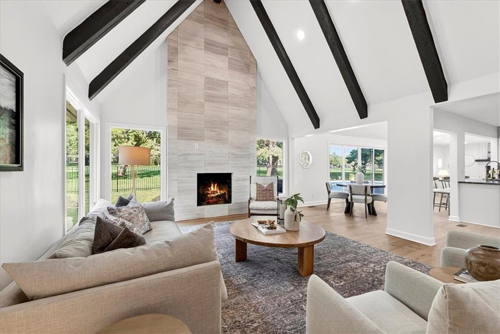 Hidden away on one of Leawood South's most coveted and private cul-de-sacs, this fully renovated residence with a sparkling pool sits on what is truly one of the best streets in the neighborhood. Perfectly positioned on the 9th hole of the Country Club of Leawood, this 4-bedroom, 3.5-bath home offers an unmatched combination of privacy, elegance, and resort-style living. Every detail has been elevated with designer finishes and modern upgrades, including brand-new windows, HVAC, and water heater. The main level features soaring ceilings, a dramatic floor-to-ceiling chiseled marble fireplace, and dual 7 foot sliding doors that frame spectacular golf course views while opening seamlessly to the pool and patio. A modern kitchen with custom cabinetry and a spacious mudroom with built-ins bring both sophistication and convenience. The primary suite captures peaceful views and features a spa-like marble walk-in shower and an expansive walk-in closet. The finished lower level extends the home's living space with a cozy fireplace-warmed rec room, a 5th non-conforming bedroom, exercise room, bonus room, and full bath. Outdoors, the newly poured concrete patio, refreshed landscaping, and sparkling pool create a private retreat overlooking manicured fairways ideal for both entertaining and serene relaxation. Located within the award-winning Blue Valley School District and minutes from upscale shopping and dining, this Leawood South masterpiece offers a rare opportunity to own a hidden gem on the golf course's most desirable street.