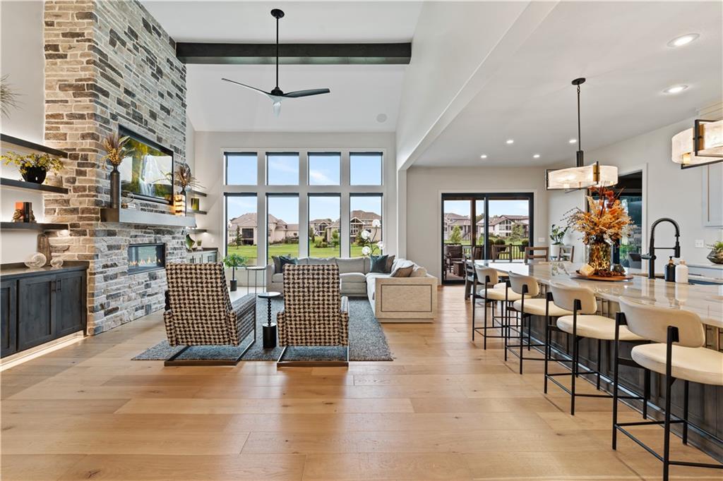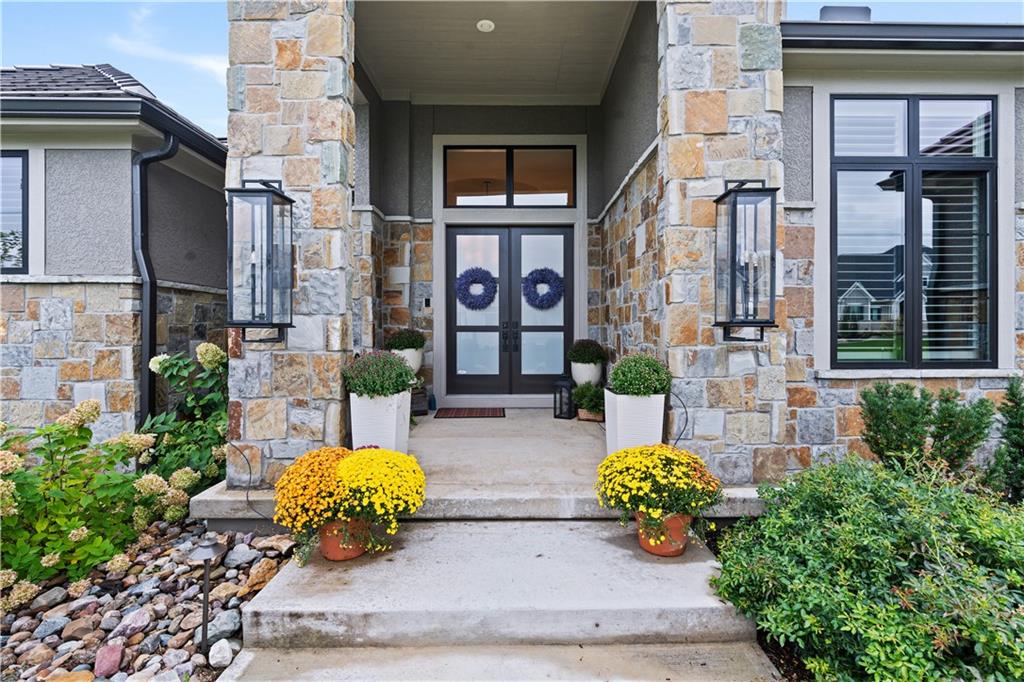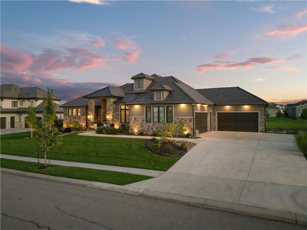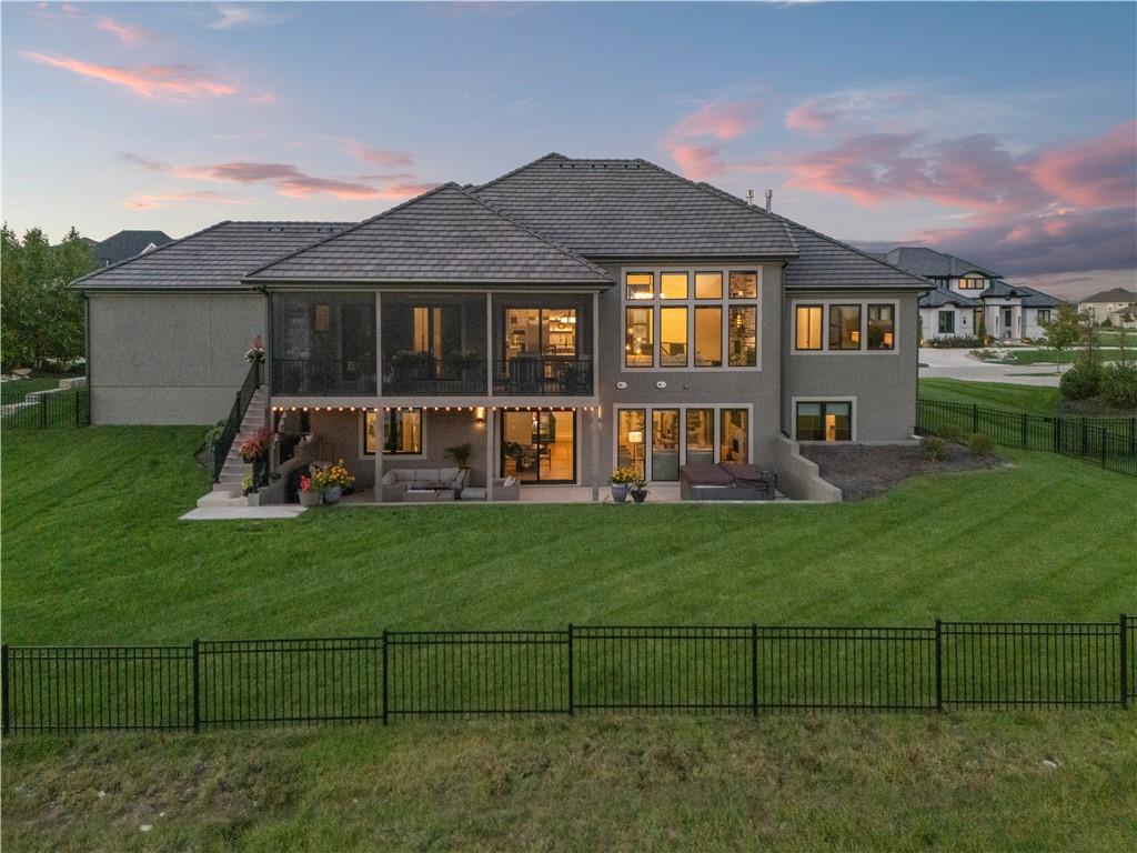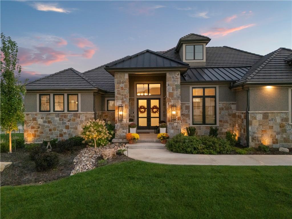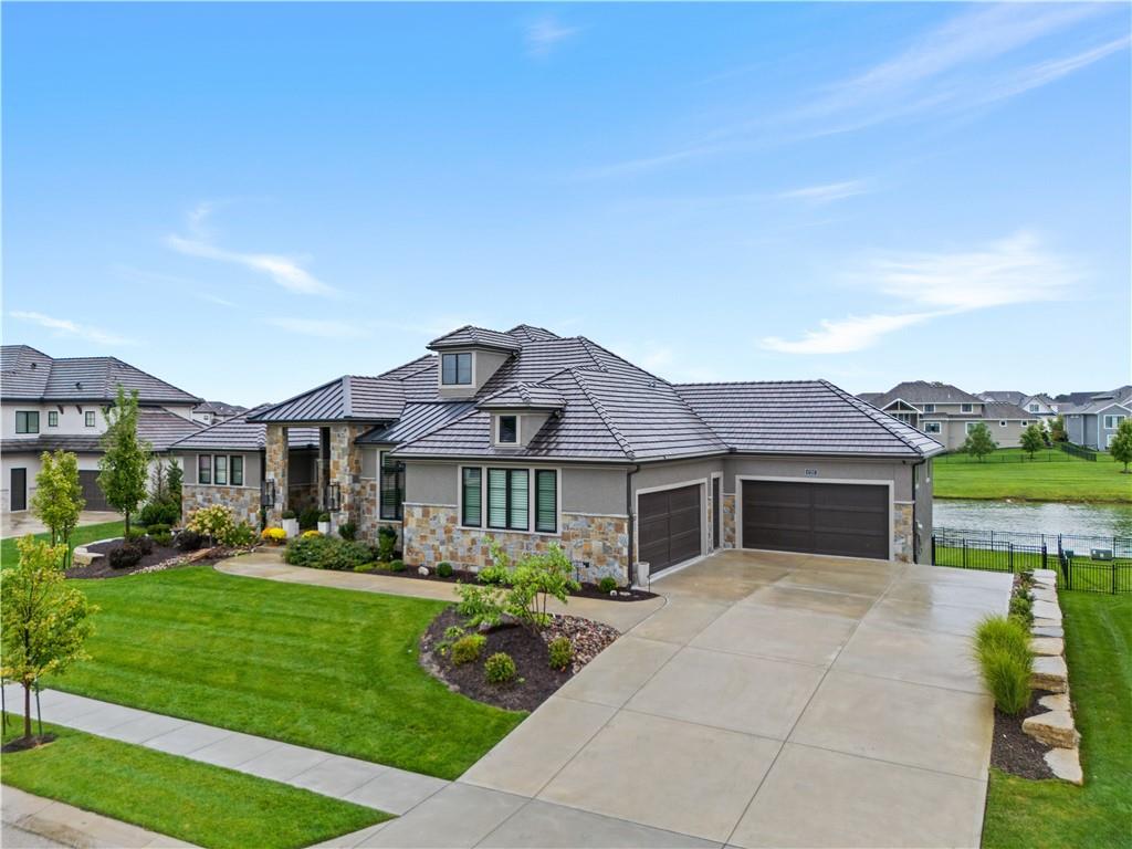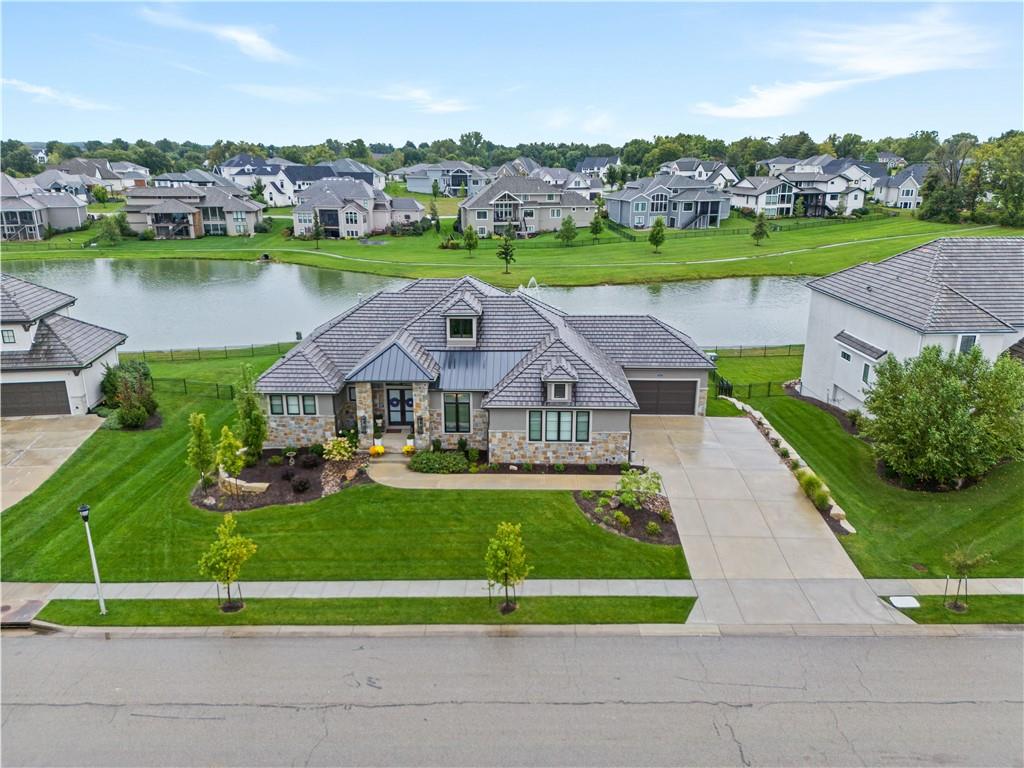 Poised within the prestigious Blue Valley School District, this award-winning Don Julian custom estate embodies the pinnacle of luxury living. Overlooking serene waters and dancing fountains, the residence offers a rare harmony of architectural excellence and natural beauty. The tranquil setting is best savored from the expansive main-level heated covered deck that connects the stunning four-seasons room. Every detail within reflects masterful craftsmanship and thoughtful design. With architectural LED lighting both interior and exterior, highlights the home's contemporary elegance. On the main level, the entrance meets you with glowing hardwoods that flow throughout both levels. The gourmet kitchen, appointed with Wolf appliances and luxurious finishes, anchors the open-concept living area—ideal for both intimate gatherings and grand entertaining. In the great room, remote-controlled window treatments reveal breathtaking lake views framed by cascading fountains.A graceful staircase leads to the lower level, designed as a private retreat and entertainment haven. Here, three ensuite bedrooms with walk-in closets complement an elegant wet bar, family recreation space, and a private music room—perfectly suited to transform into a wine cellar or recording studio. The suspended garage's unfinished space below offers endless possibilities like a home theater. Basement walkout access extends the living experience outdoors connecting to the patio and water views. Advanced home technology with a dedicated network hub with LUXUL gigabit switches, a PANAMAX MR4000 system, pre-wired for security system and in-ceiling Sonos speakers that encompasses the home in sound on both levels and the master bedroom.Enjoy year round energy efficiency with upgraded insulation and two laundry rooms for time efficiency. Blending timeless sophistication with modern innovation, this remarkable estate is more than a home—it is a statement of artistry and lifestyle in Terrybrook Farms.