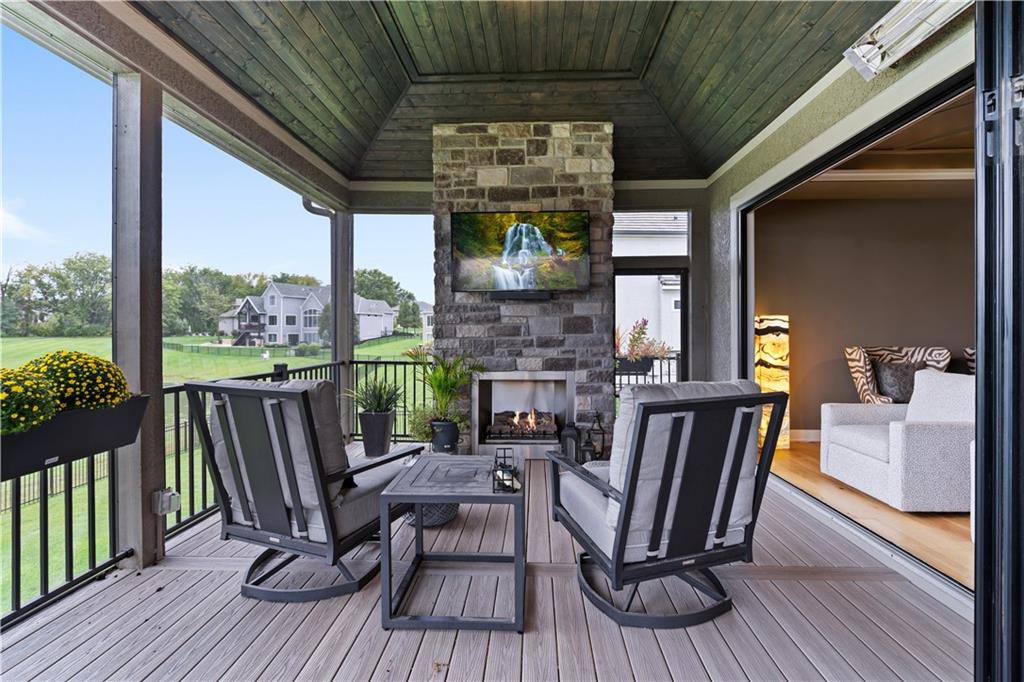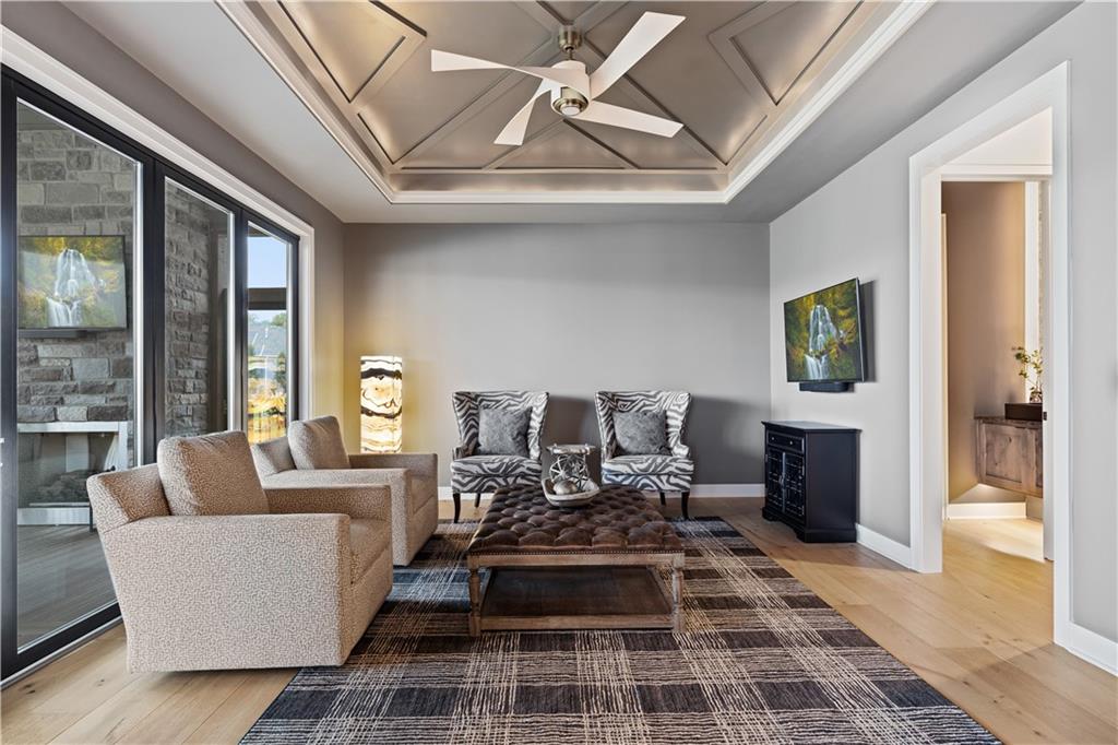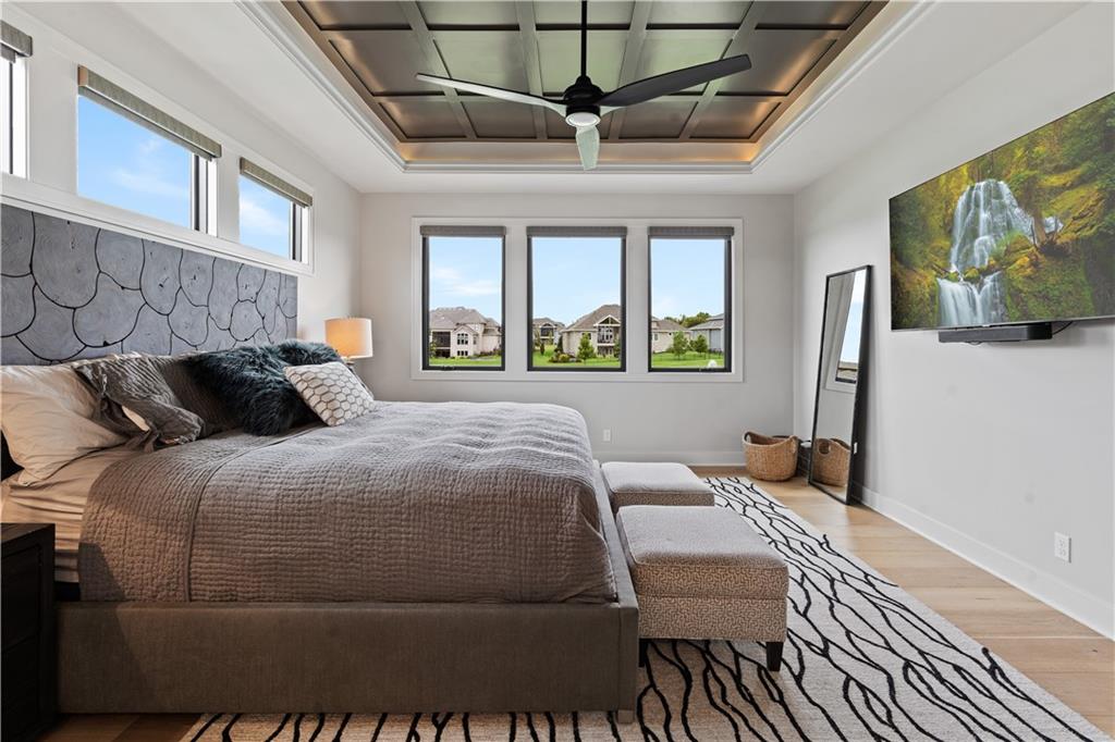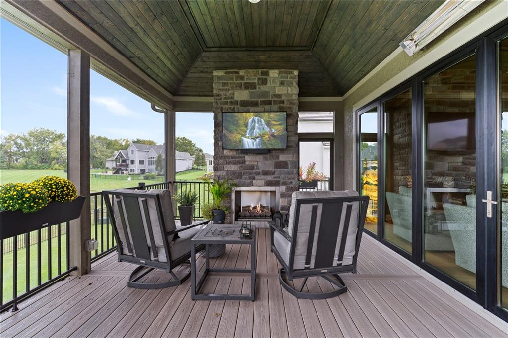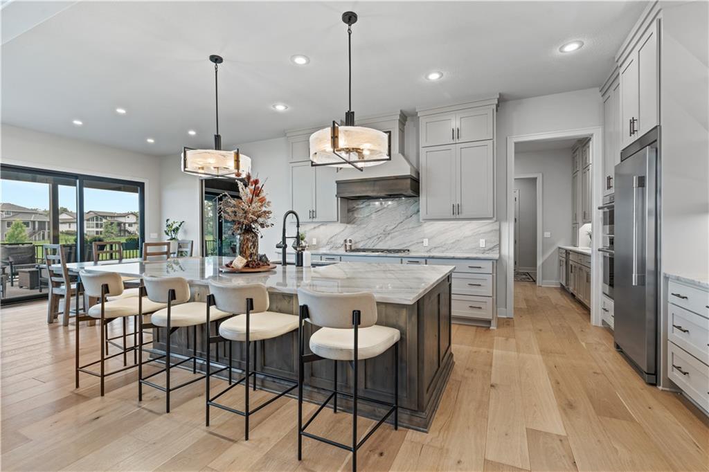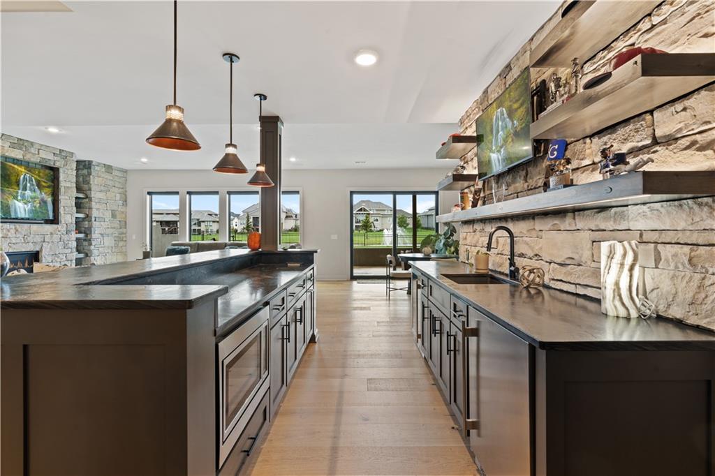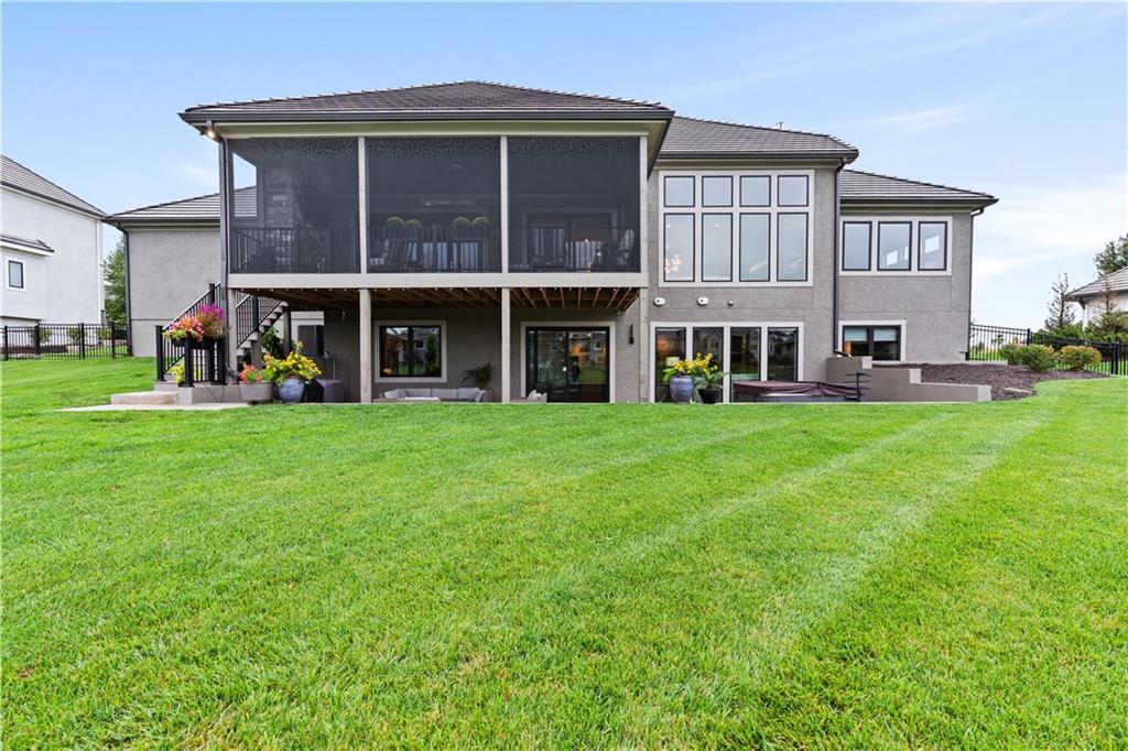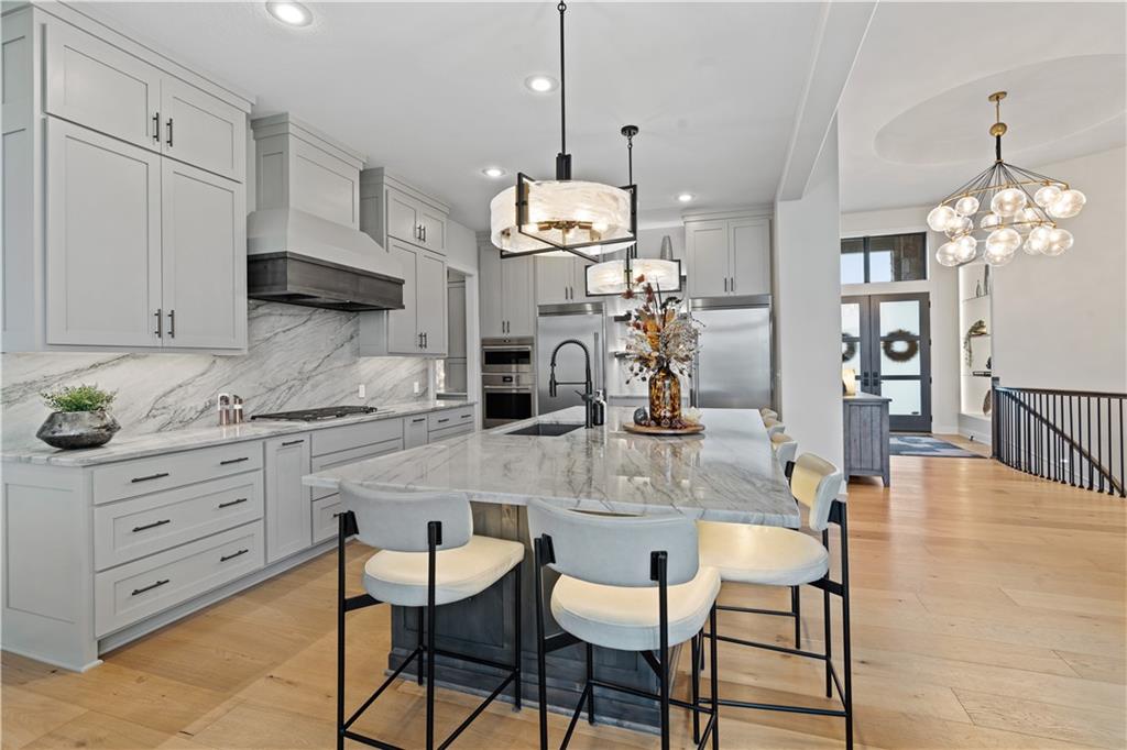 Poised within the prestigious Blue Valley School District, this award-winning Don Julian custom estate embodies the pinnacle of luxury living. Overlooking serene waters and dancing fountains, the residence offers a rare harmony of architectural excellence and natural beauty. The tranquil setting is best savored from the expansive main-level heated covered deck that connects the stunning four-seasons room. Every detail within reflects masterful craftsmanship and thoughtful design. With architectural LED lighting both interior and exterior, highlights the home's contemporary elegance. On the main level, the entrance meets you with glowing hardwoods that flow throughout both levels. The gourmet kitchen, appointed with Wolf appliances and luxurious finishes, anchors the open-concept living area—ideal for both intimate gatherings and grand entertaining. In the great room, remote-controlled window treatments reveal breathtaking lake views framed by cascading fountains.A graceful staircase leads to the lower level, designed as a private retreat and entertainment haven. Here, three ensuite bedrooms with walk-in closets complement an elegant wet bar, family recreation space, and a private music room—perfectly suited to transform into a wine cellar or recording studio. The suspended garage's unfinished space below offers endless possibilities like a home theater. Basement walkout access extends the living experience outdoors connecting to the patio and water views. Advanced home technology with a dedicated network hub with LUXUL gigabit switches, a PANAMAX MR4000 system, pre-wired for security system and in-ceiling Sonos speakers that encompasses the home in sound on both levels and the master bedroom.Enjoy year round energy efficiency with upgraded insulation and two laundry rooms for time efficiency. Blending timeless sophistication with modern innovation, this remarkable estate is more than a home—it is a statement of artistry and lifestyle in Terrybrook Farms.
