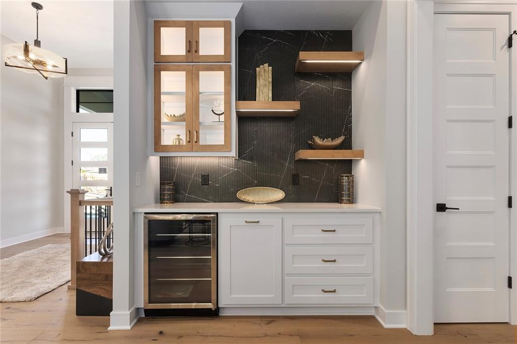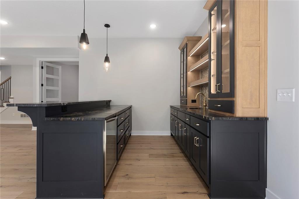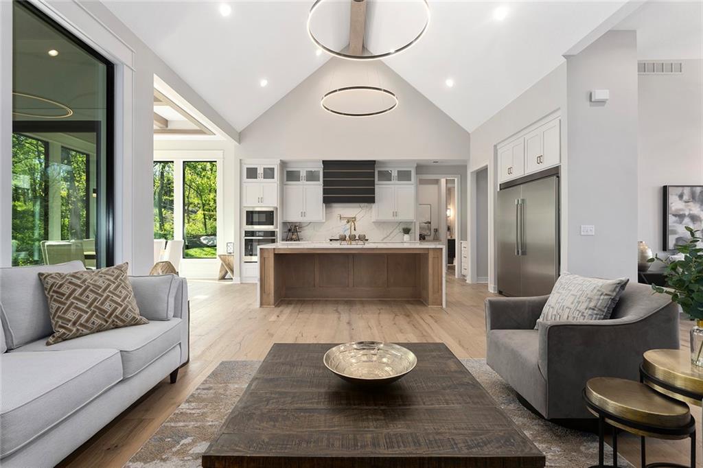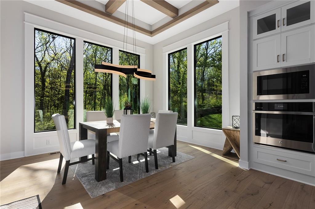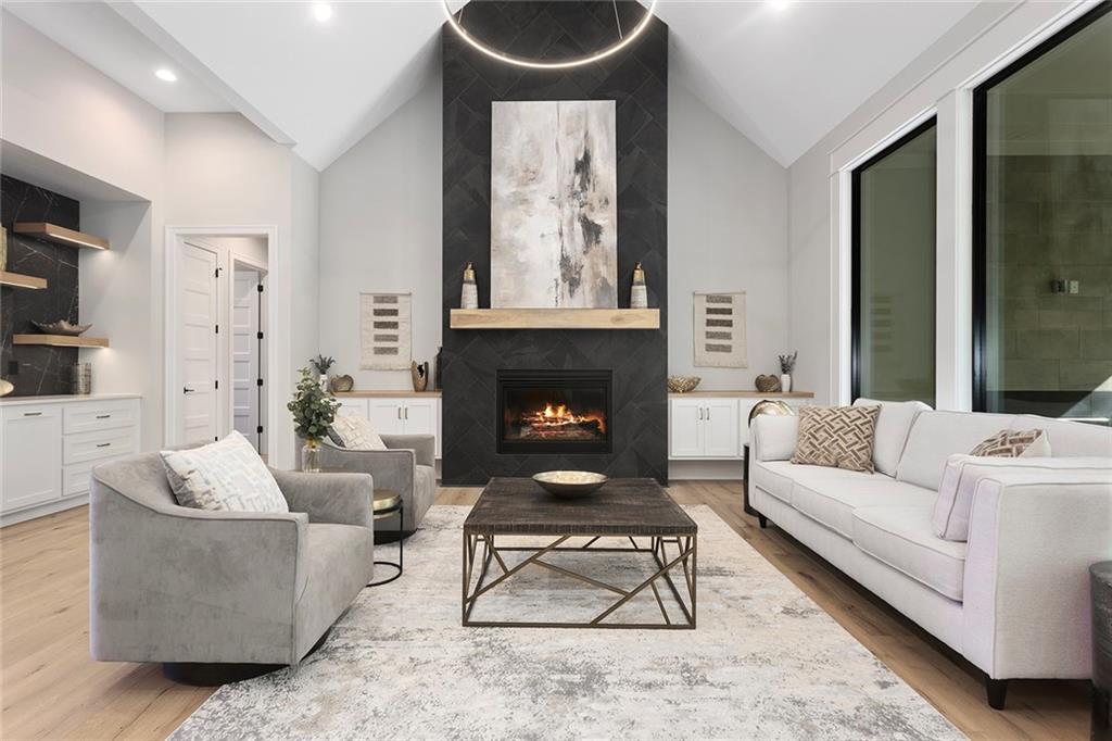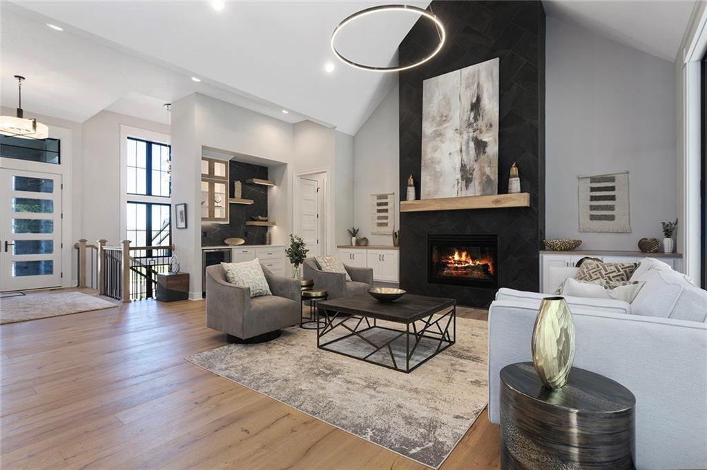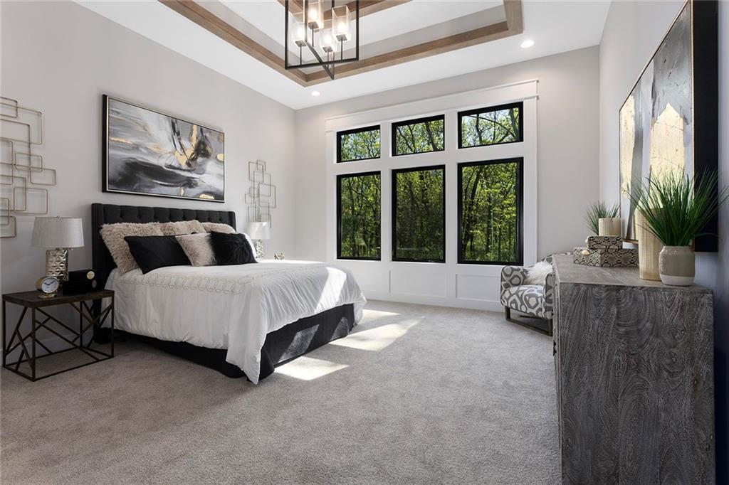 Stunning Reverse 1.5 Story on Heavily Wooded Walk-Out Lot. This exceptional new plan blends open, light-filled living with thoughtful design for both entertaining and privacy. The main level offers two private bedroom suites, each with its own bath. A vaulted great room and dining area feature walls of windows that flood the home with natural light and frame serene wooded views. Oversized 8’ sliding doors extend the living space to a covered lanai with fireplace and ceiling fan, creating the perfect indoor/outdoor retreat. The luxurious primary suite showcases wooded views and a spa-inspired bath with a freestanding tub, zero-entry shower, and floating custom cabinetry. The finished walk-out lower level boasts 10’ ceilings, three additional bedrooms, and a spacious rec room with entertainment center and decorative niches. The full bar is equipped with sink, beverage center, and quartz countertops—ideal for hosting. An oversized flex suite with built-ins and beverage center offers endless possibilities: gym, yoga studio, or media room. Located in sought-after Timberstone Ridge, this home combines luxury finishes, versatile spaces, and breathtaking views—an incredible opportunity for refined living