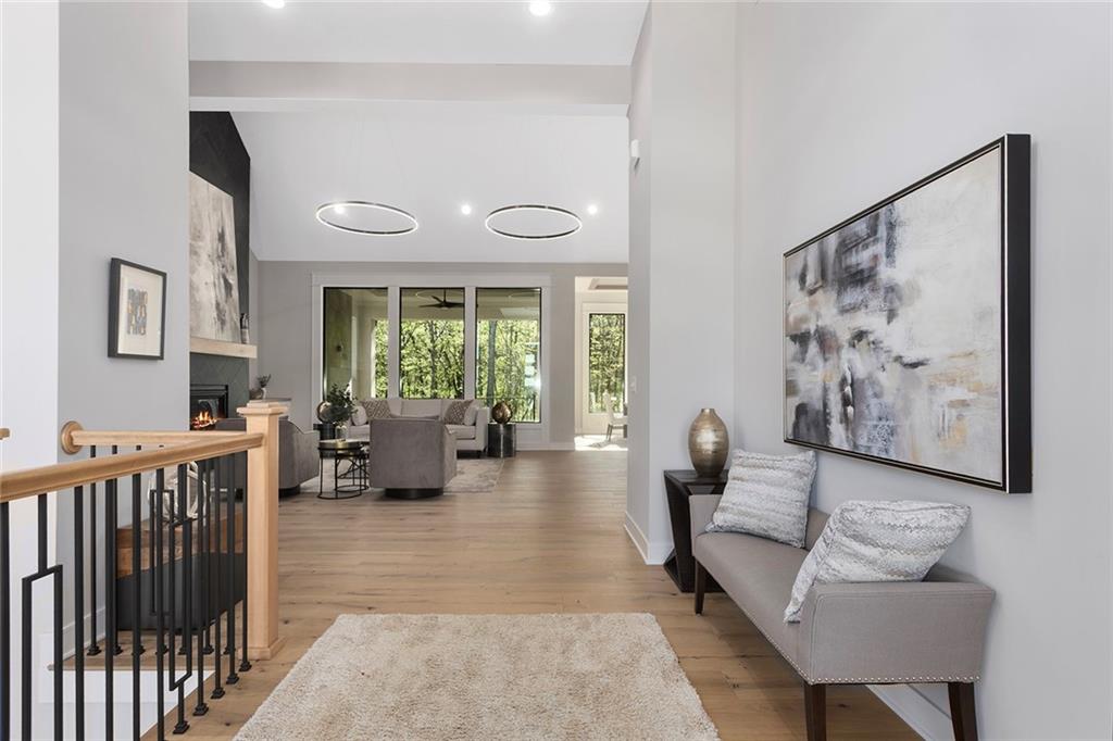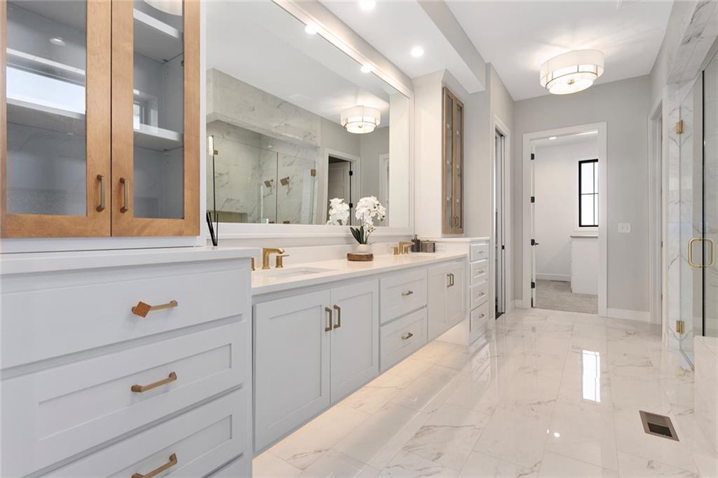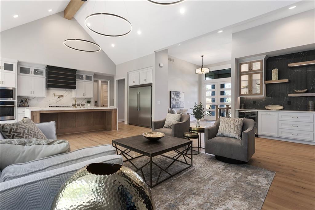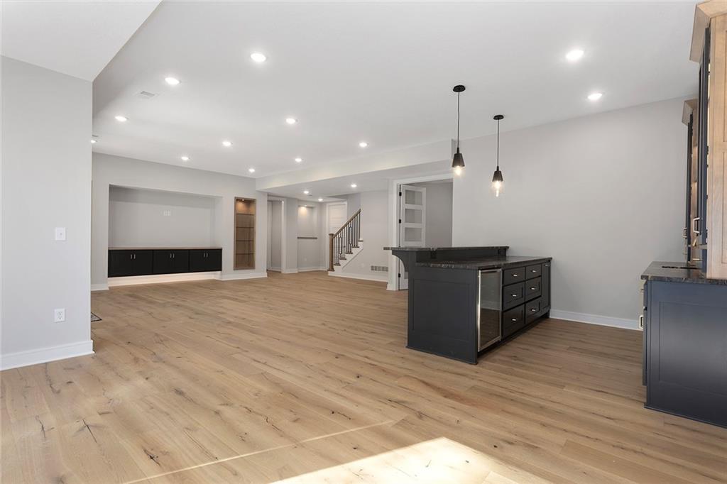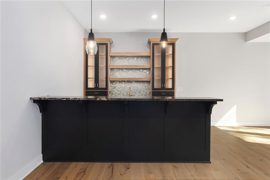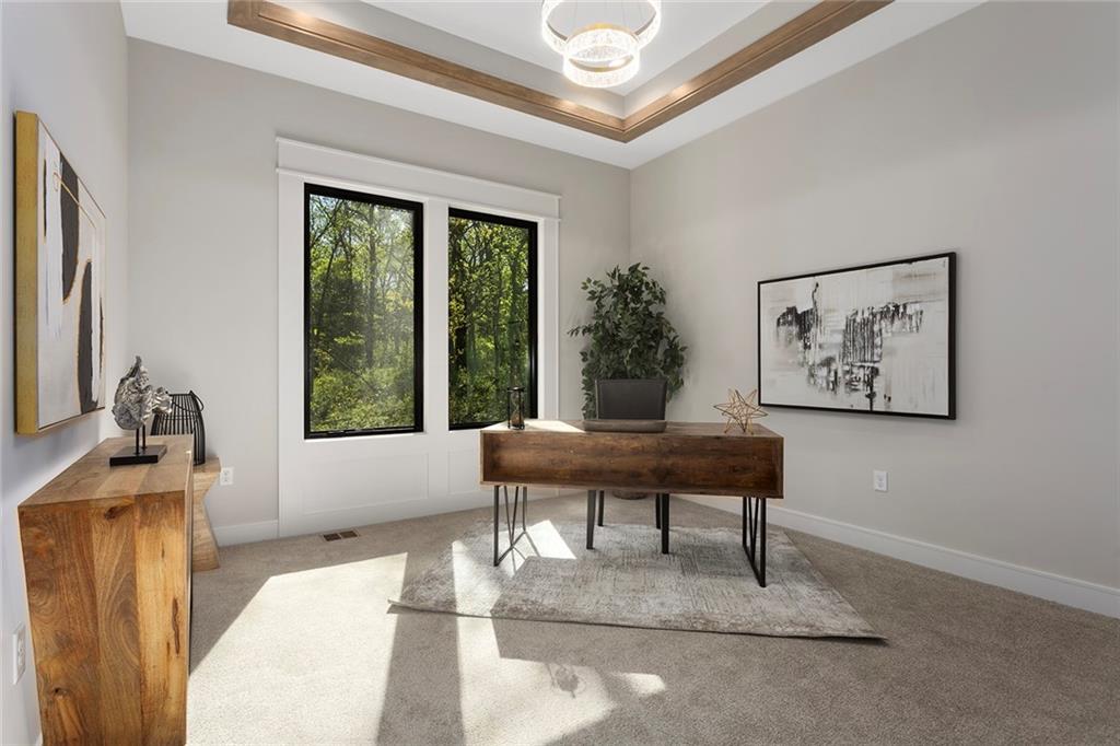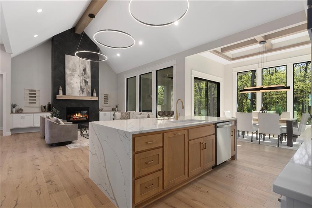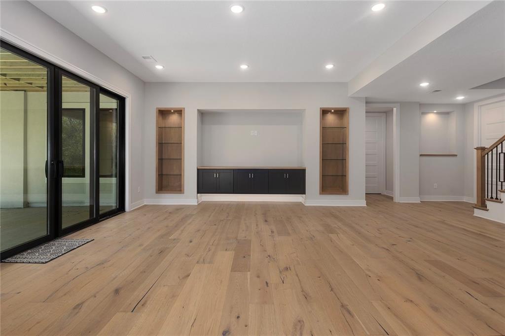 Stunning Reverse 1.5 Story on Heavily Wooded Walk-Out Lot. This exceptional new plan blends open, light-filled living with thoughtful design for both entertaining and privacy. The main level offers two private bedroom suites, each with its own bath. A vaulted great room and dining area feature walls of windows that flood the home with natural light and frame serene wooded views. Oversized 8’ sliding doors extend the living space to a covered lanai with fireplace and ceiling fan, creating the perfect indoor/outdoor retreat. The luxurious primary suite showcases wooded views and a spa-inspired bath with a freestanding tub, zero-entry shower, and floating custom cabinetry. The finished walk-out lower level boasts 10’ ceilings, three additional bedrooms, and a spacious rec room with entertainment center and decorative niches. The full bar is equipped with sink, beverage center, and quartz countertops—ideal for hosting. An oversized flex suite with built-ins and beverage center offers endless possibilities: gym, yoga studio, or media room. Located in sought-after Timberstone Ridge, this home combines luxury finishes, versatile spaces, and breathtaking views—an incredible opportunity for refined living