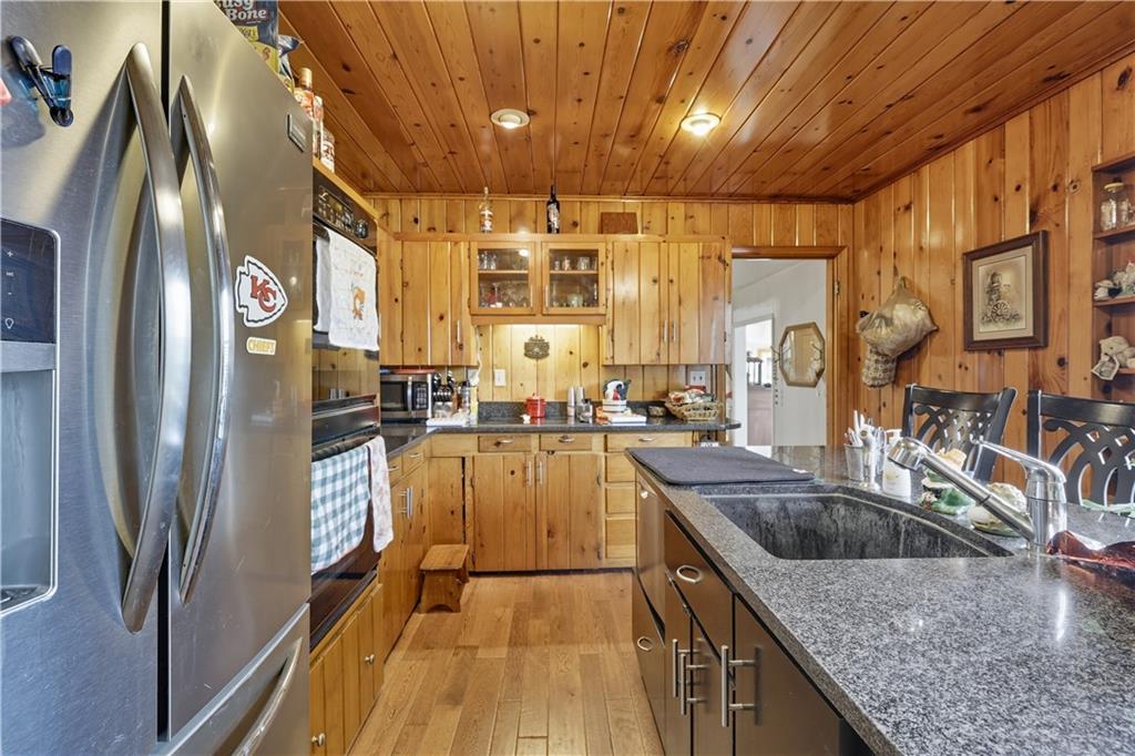 Welcome home to 9228 Wollard Blvd. Just outside the city limits on southern exposure. Home is a 2-bedroom 1 bath plus a non-conforming bedroom in the basement. All nestled on 1 m/l acre with so much room for your family. Behind the home is the KC Chiefs' house. Have your own Sunday afternoon football fun! It is set up and ready to cook your favorite Chiefs hot wings. The home has original hardwood floors and the kitchen is all Hardwood Pine. Sunroom is perfect for morning coffee or just relax. 2 outbuildings and nice nice-sized garden area. A great mix of privacy and convenience. Let's take a look!