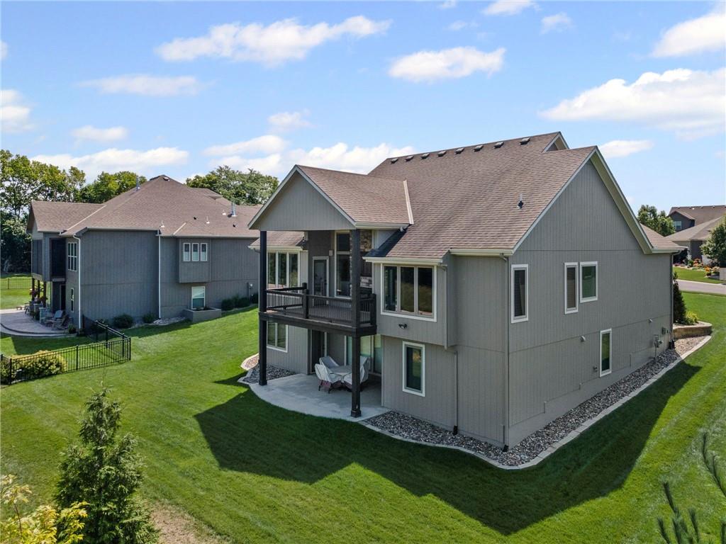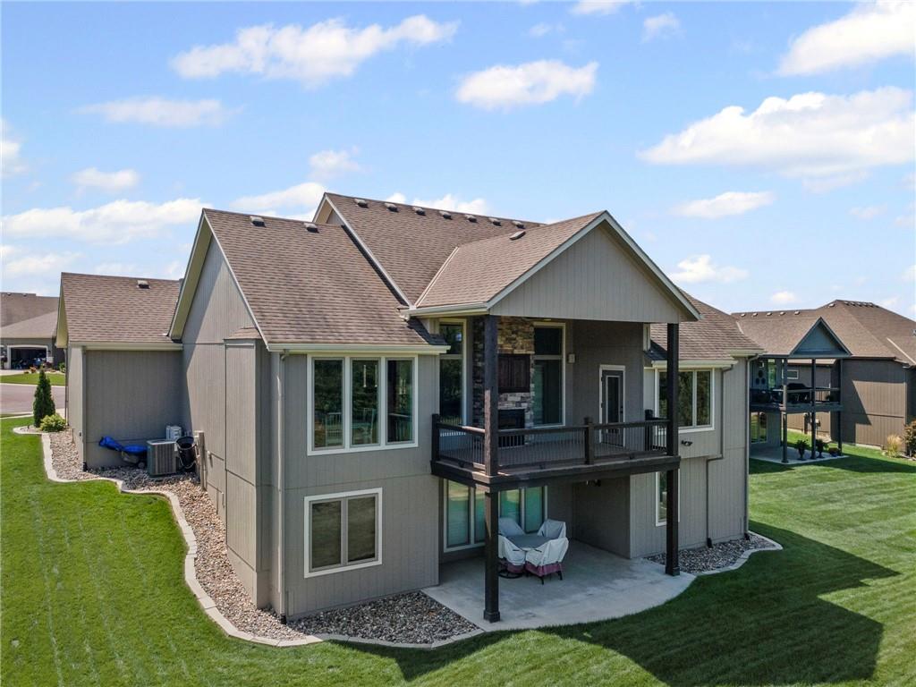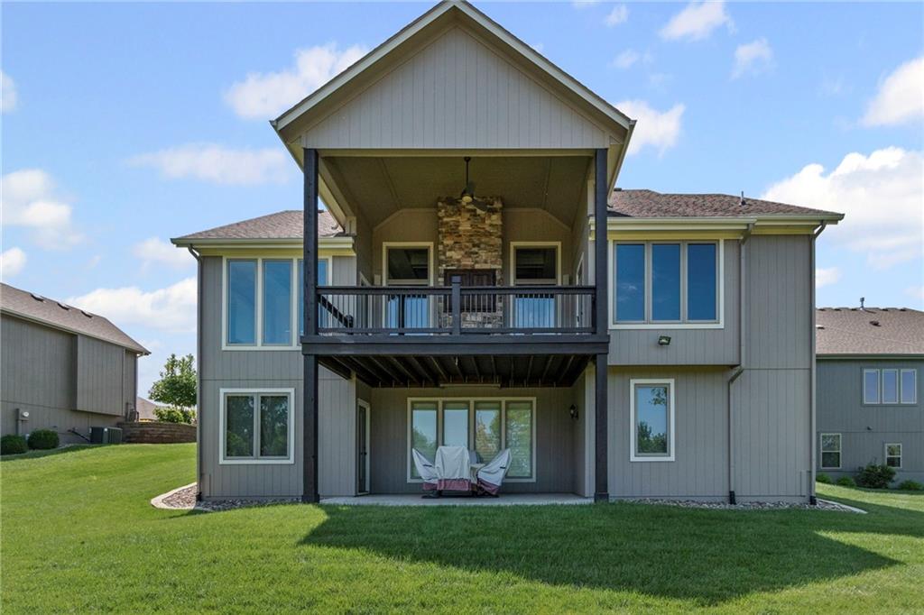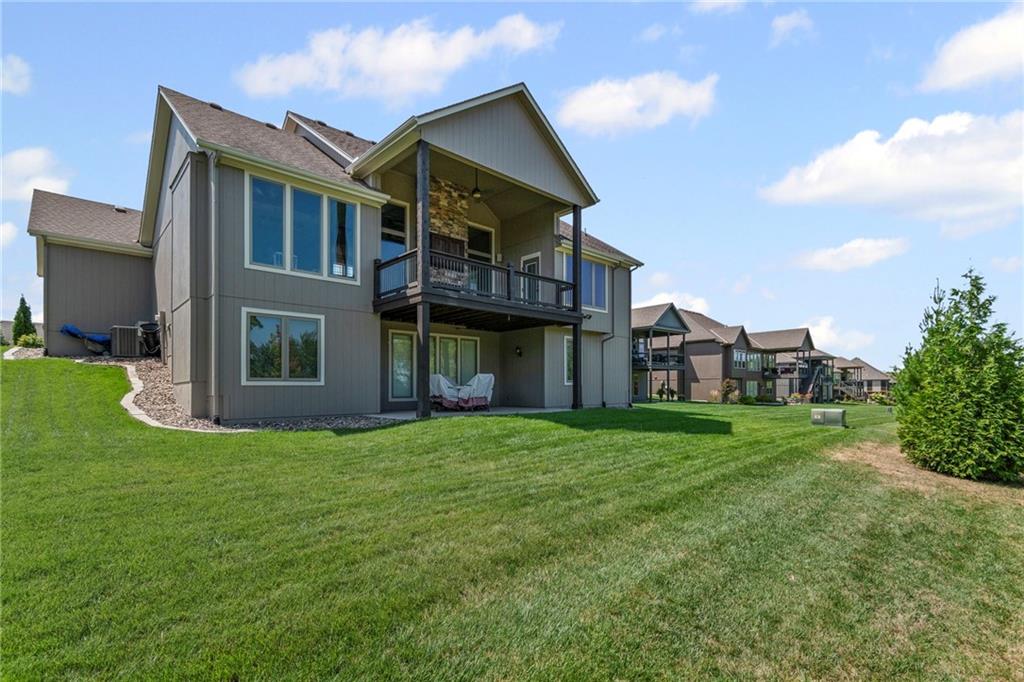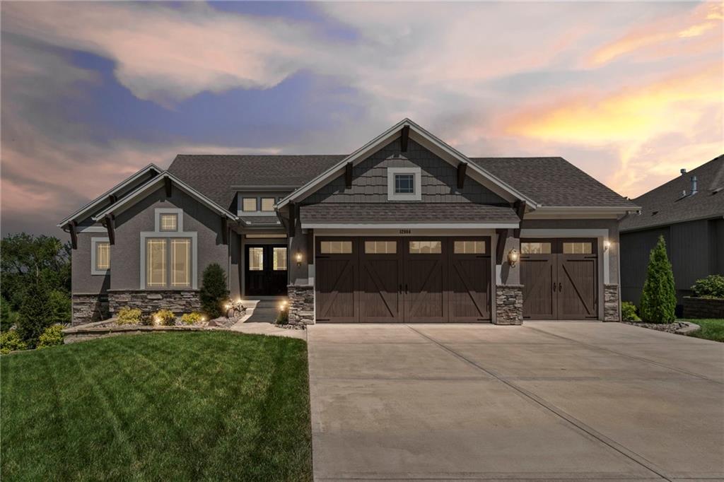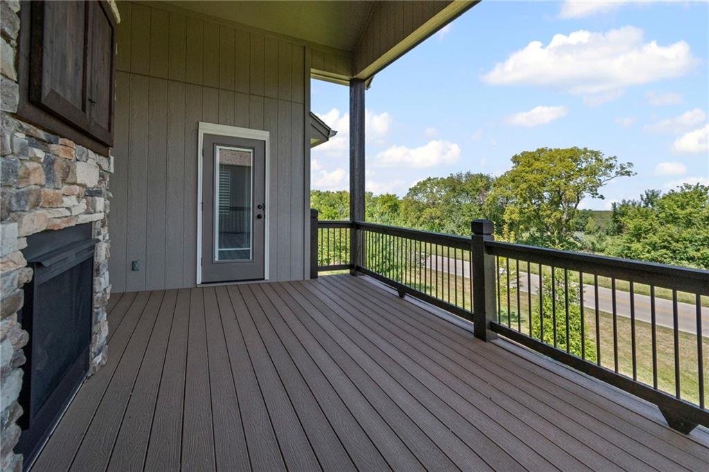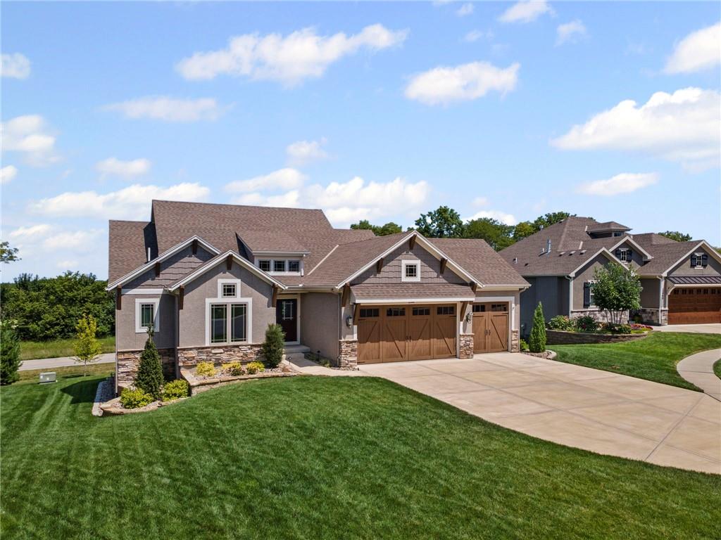 Beautiful Jefferson Reverse 1.5 by Bickimer Homes featuring plantation shutters, rich hardwoods, and stunning stonework with upgrades throughout. Step inside through the impressive double front doors into a soaring entryway with 14’ ceilings, leading into the Great Room with 12’ ceilings, crown molding, and a see-through fireplace that connects to the covered deck overlooking peaceful acreage—a perfect spot for morning coffee or evening relaxation. The kitchen has been fully refinished and shines with NEW countertops, NEW tile backsplash, NEW lighting, freshly painted cabinets with NEW hardware, NEW Kitchenaid appliances, NEW sink, NEW black stainless stove with gas cooktop and microwave/oven combo. A huge walk-in pantry for all your storage needs. The spacious Primary Suite also offers deck access and includes a gorgeous bath, massive closet, and adjoining laundry space. 4 full bedrooms plus a bonus office (converted from unfinished space in the lower level) and even a finished under-stairs play area for kids. Bathrooms feature elongated toilets and thoughtful details throughout. The lower level is designed for entertaining with built-in speakers, a large patio, and plenty of flexible storage space—perfect for a gym, hobby area, or more. The garage is a showstopper with extra finished square footage that’s heated/cooled, upgraded garage doors, NEW epoxy flooring, and fresh paint. Additional highlights include hardwood stair landings, mud bench, all casement windows, and wonderful neighborhood location close to Heritage Park. This one is PRICED TO SELL!
