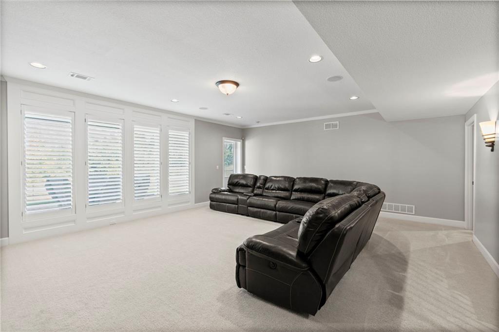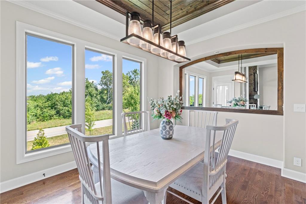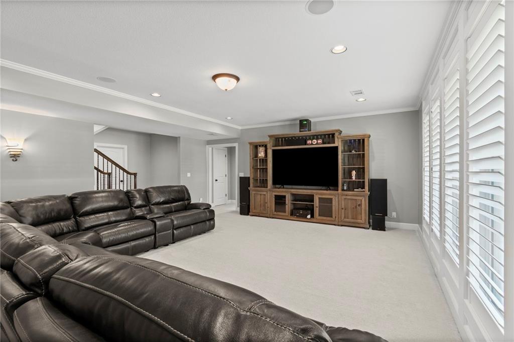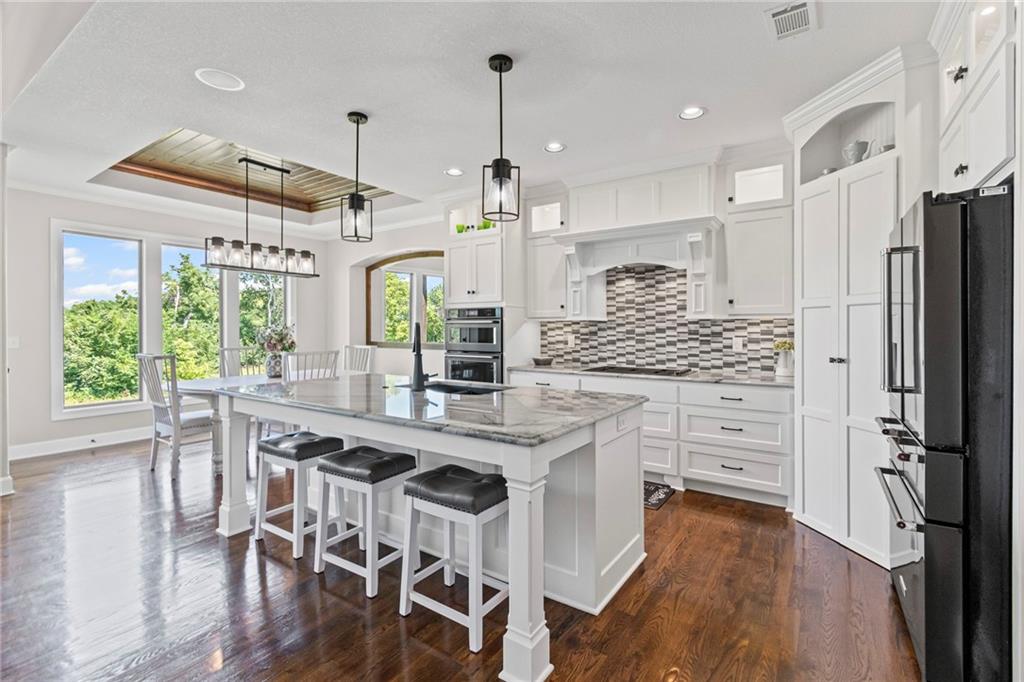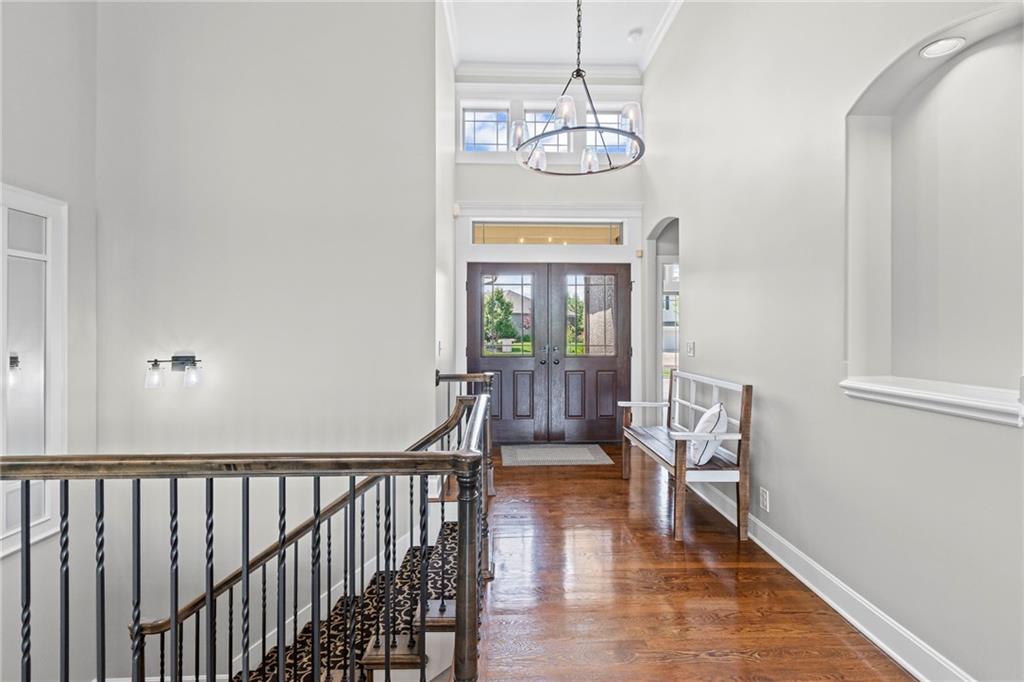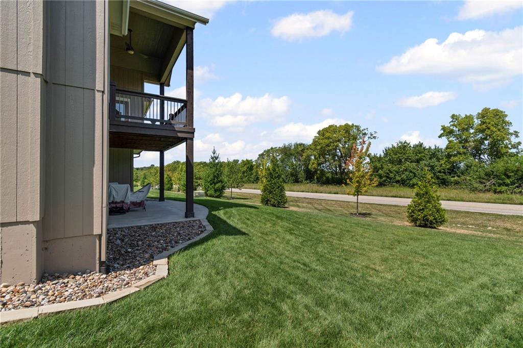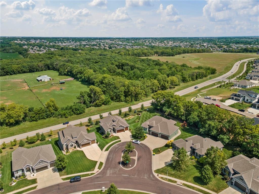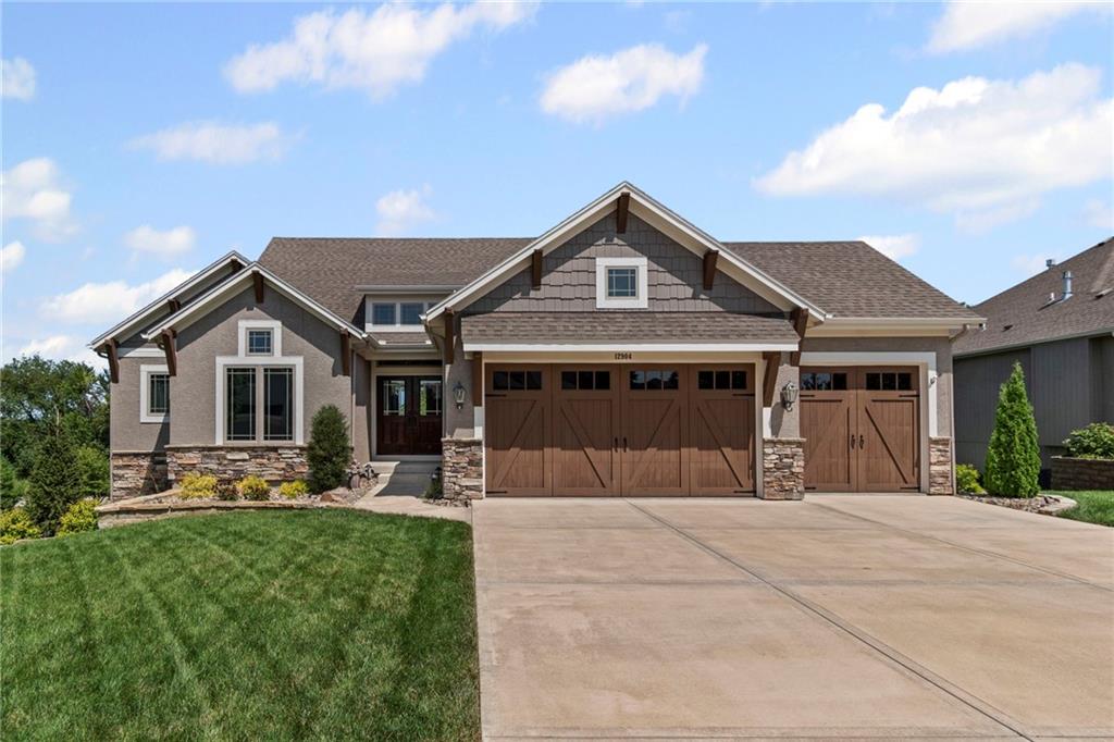Beautiful Jefferson Reverse 1.5 by Bickimer Homes featuring plantation shutters, rich hardwoods, and stunning stonework with upgrades throughout. Step inside through the impressive double front doors into a soaring entryway with 14’ ceilings, leading into the Great Room with 12’ ceilings, crown molding, and a see-through fireplace that connects to the covered deck overlooking peaceful acreage—a perfect spot for morning coffee or evening relaxation. The kitchen has been fully refinished and shines with NEW countertops, NEW tile backsplash, NEW lighting, freshly painted cabinets with NEW hardware, NEW Kitchenaid appliances, NEW sink, NEW black stainless stove with gas cooktop and microwave/oven combo. A huge walk-in pantry for all your storage needs. The spacious Primary Suite also offers deck access and includes a gorgeous bath, massive closet, and adjoining laundry space. 4 full bedrooms plus a bonus office (converted from unfinished space in the lower level) and even a finished under-stairs play area for kids. Bathrooms feature elongated toilets and thoughtful details throughout. The lower level is designed for entertaining with built-in speakers, a large patio, and plenty of flexible storage space—perfect for a gym, hobby area, or more. The garage is a showstopper with extra finished square footage that’s heated/cooled, upgraded garage doors, NEW epoxy flooring, and fresh paint. Additional highlights include hardwood stair landings, mud bench, all casement windows, and wonderful neighborhood location close to Heritage Park. This one is PRICED TO SELL!
