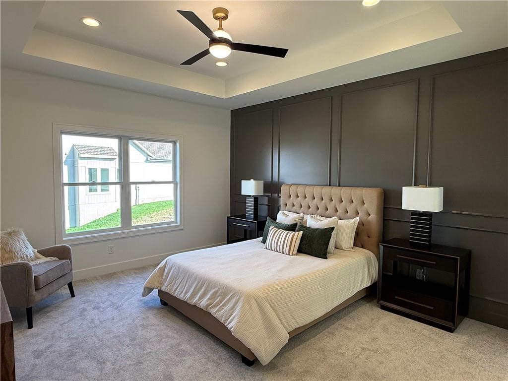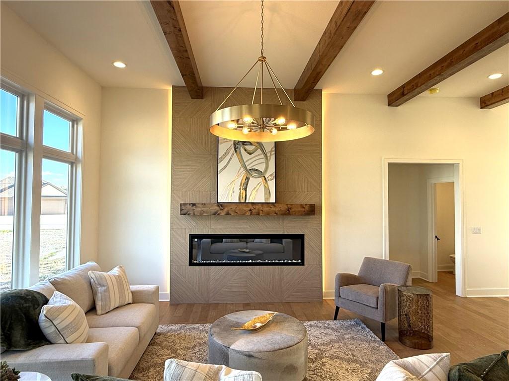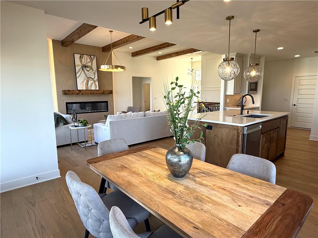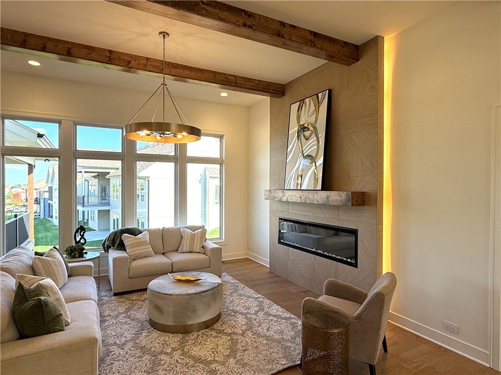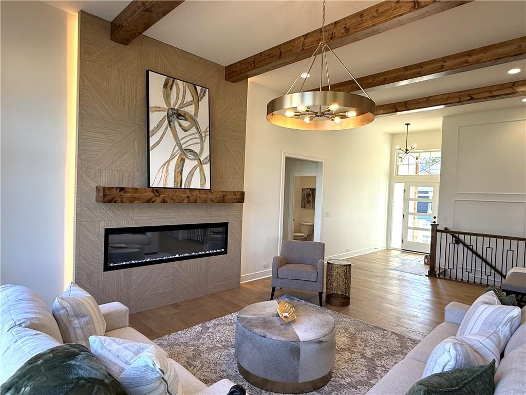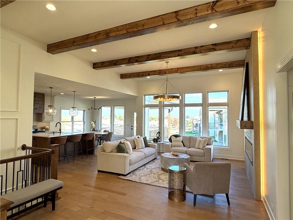 Step inside and you’ll immediately notice the bright, airy feel of this home. The open floor plan is accented by tall ceilings with exposed wood beams, oversized windows that pour in natural light, and wide-plank hardwoods that create a welcoming atmosphere. The living room is anchored by a striking floor-to-ceiling fireplace topped with a wood mantel, the perfect spot to gather with friends or relax at the end of the day. The gourmet kitchen is designed for both function and style, offering a large island with seating, quartz countertops, custom cabinetry, stainless steel appliances, and modern lighting. The adjoining dining area overlooks the backyard and provides direct access to the covered deck for outdoor enjoyment. The primary suite feels like a private retreat, complete with a tray ceiling, modern ceiling fan, soft carpet, and a bold accent wall. The adjoining spa-like bath is designed for relaxation, offering a calm and luxurious escape with a large shower, soaking tub, and double vanities. Additional main-level highlights include a private office, mudroom, walk-in pantry, and laundry room. The finished lower level expands the living space with a large recreation room featuring oversized windows, a wet bar, and a half bath. Two additional bedrooms share a full bathroom on this level. Additional upgrades include under-cabinet lighting and a variety of modern finishes throughout.