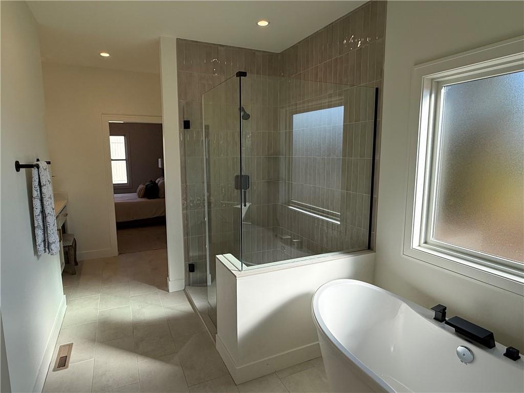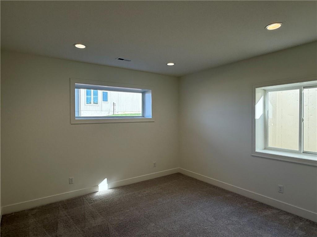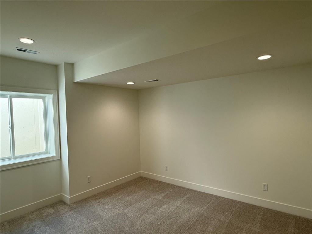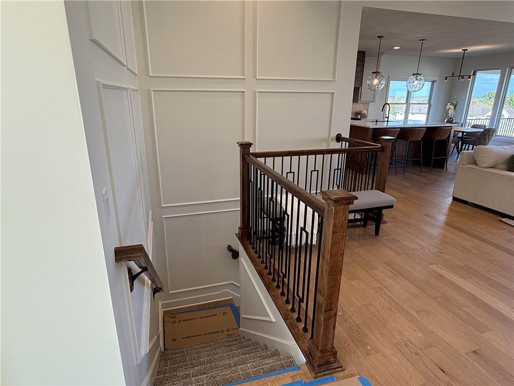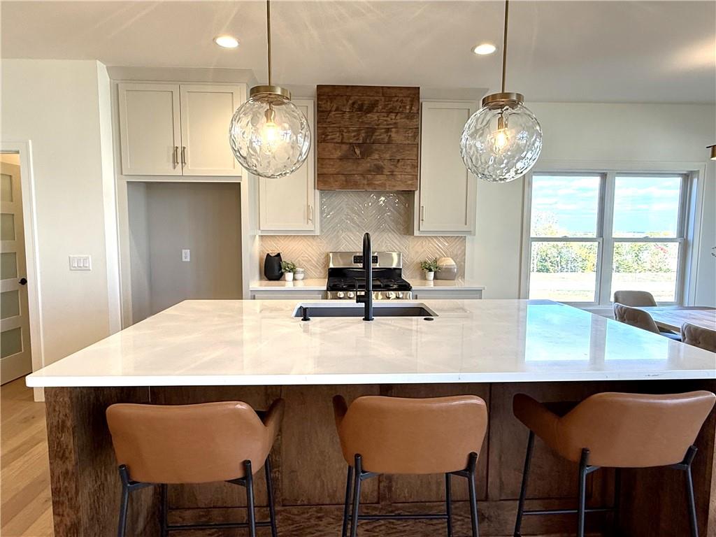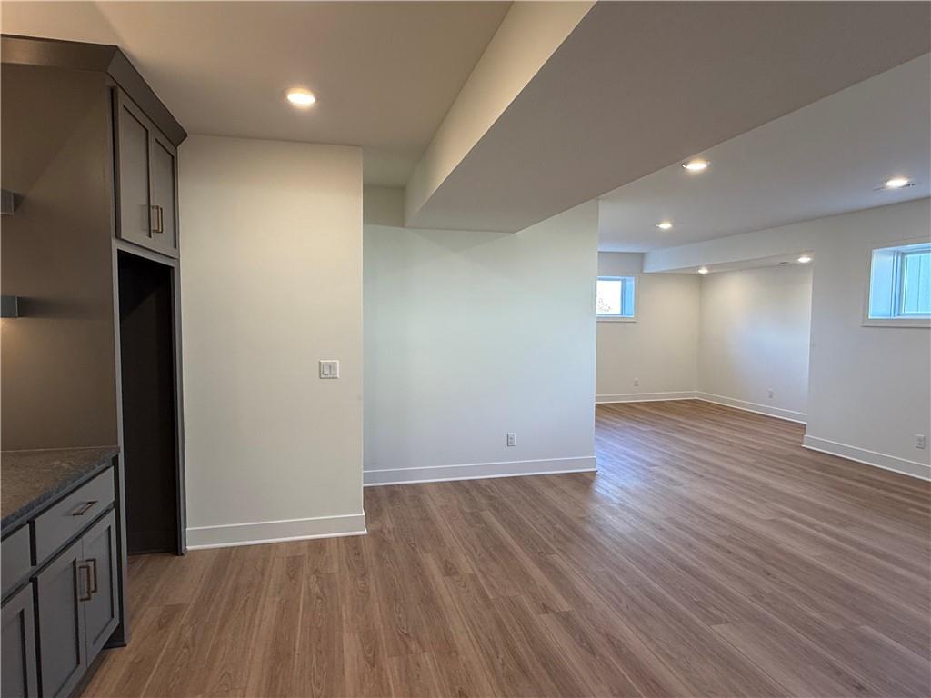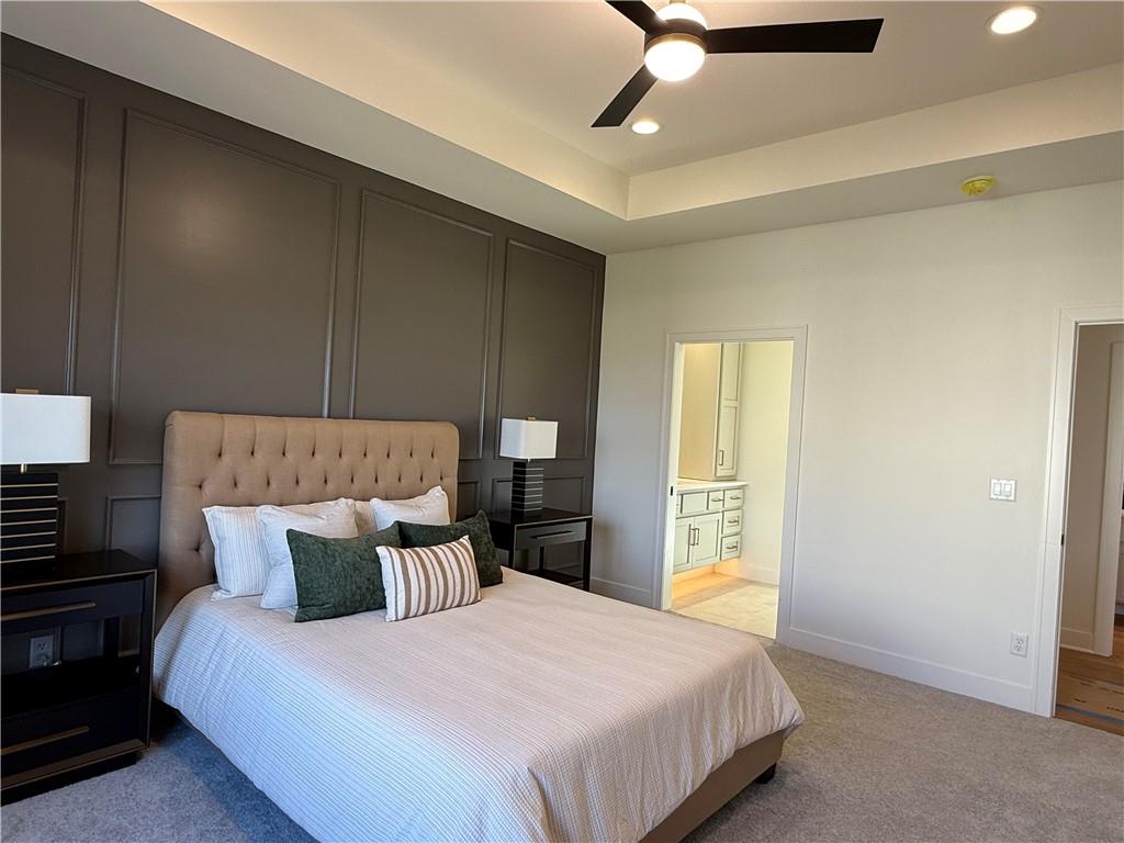 Step inside and you’ll immediately notice the bright, airy feel of this home. The open floor plan is accented by tall ceilings with exposed wood beams, oversized windows that pour in natural light, and wide-plank hardwoods that create a welcoming atmosphere. The living room is anchored by a striking floor-to-ceiling fireplace topped with a wood mantel, the perfect spot to gather with friends or relax at the end of the day. The gourmet kitchen is designed for both function and style, offering a large island with seating, quartz countertops, custom cabinetry, stainless steel appliances, and modern lighting. The adjoining dining area overlooks the backyard and provides direct access to the covered deck for outdoor enjoyment. The primary suite feels like a private retreat, complete with a tray ceiling, modern ceiling fan, soft carpet, and a bold accent wall. The adjoining spa-like bath is designed for relaxation, offering a calm and luxurious escape with a large shower, soaking tub, and double vanities. Additional main-level highlights include a private office, mudroom, walk-in pantry, and laundry room. The finished lower level expands the living space with a large recreation room featuring oversized windows, a wet bar, and a half bath. Two additional bedrooms share a full bathroom on this level. Additional upgrades include under-cabinet lighting and a variety of modern finishes throughout.