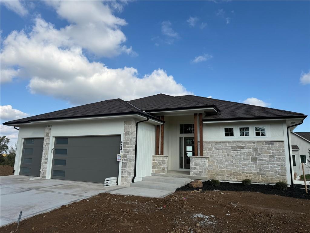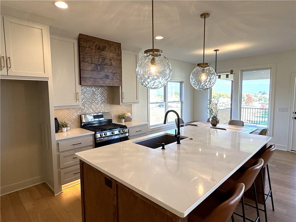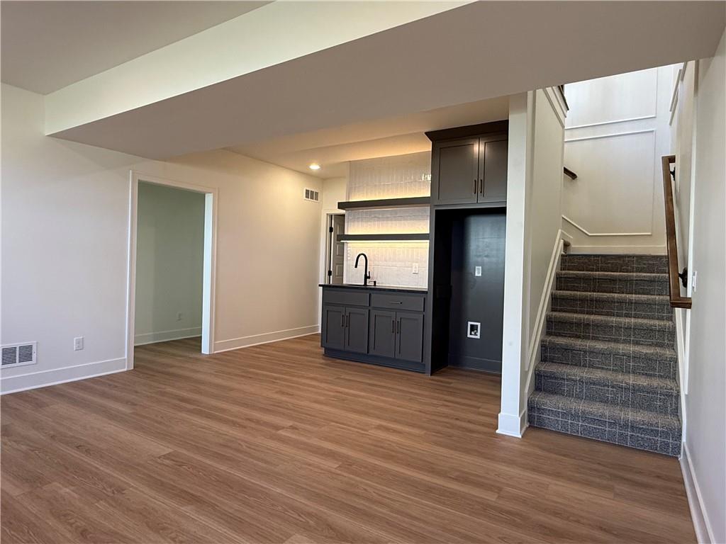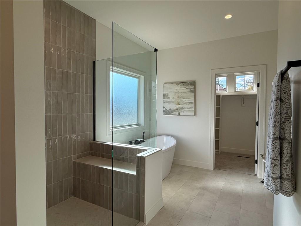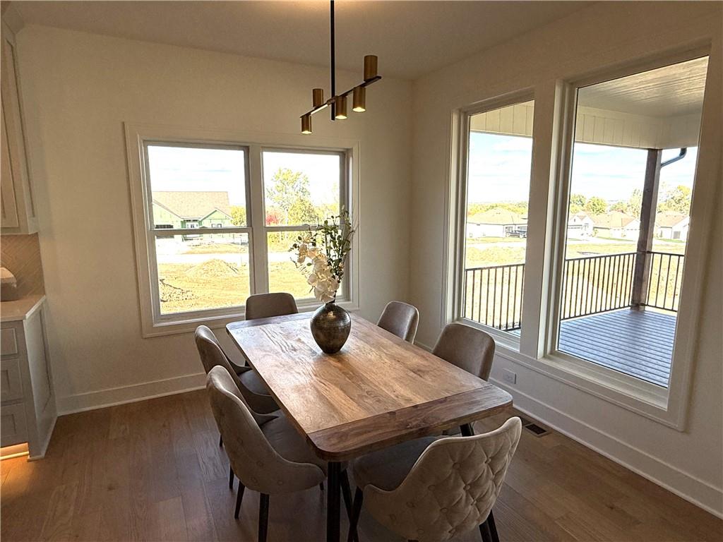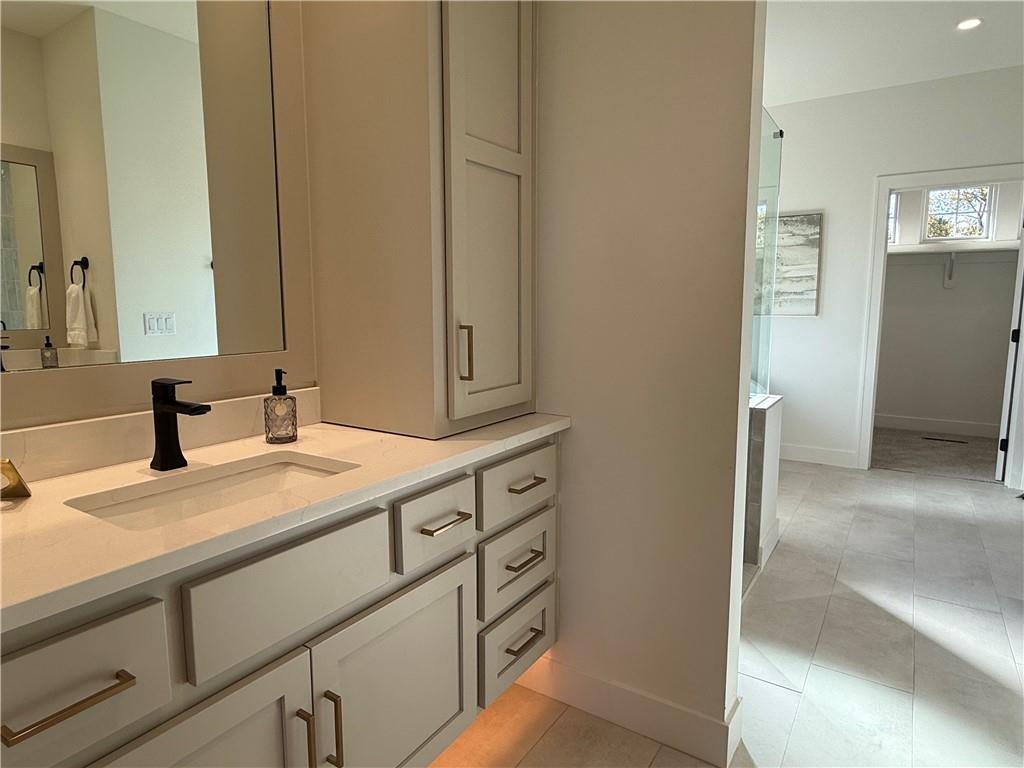 Step inside and you’ll immediately notice the bright, airy feel of this home. The open floor plan is accented by tall ceilings with exposed wood beams, oversized windows that pour in natural light, and wide-plank hardwoods that create a welcoming atmosphere. The living room is anchored by a striking floor-to-ceiling fireplace topped with a wood mantel, the perfect spot to gather with friends or relax at the end of the day. The gourmet kitchen is designed for both function and style, offering a large island with seating, quartz countertops, custom cabinetry, stainless steel appliances, and modern lighting. The adjoining dining area overlooks the backyard and provides direct access to the covered deck for outdoor enjoyment. The primary suite feels like a private retreat, complete with a tray ceiling, modern ceiling fan, soft carpet, and a bold accent wall. The adjoining spa-like bath is designed for relaxation, offering a calm and luxurious escape with a large shower, soaking tub, and double vanities. Additional main-level highlights include a private office, mudroom, walk-in pantry, and laundry room. The finished lower level expands the living space with a large recreation room featuring oversized windows, a wet bar, and a half bath. Two additional bedrooms share a full bathroom on this level. Additional upgrades include under-cabinet lighting and a variety of modern finishes throughout.