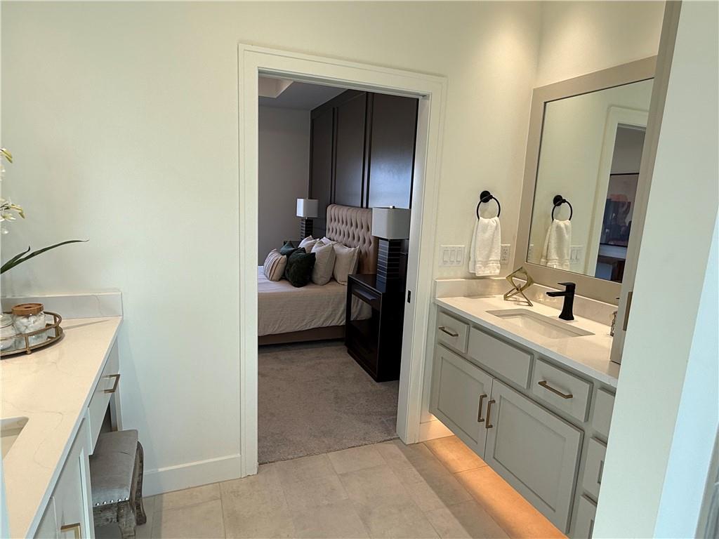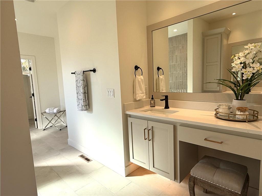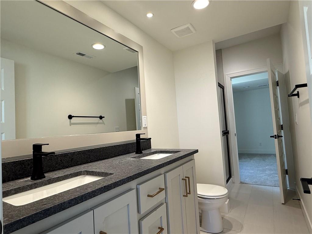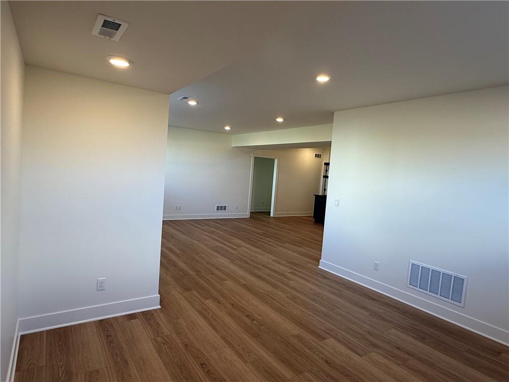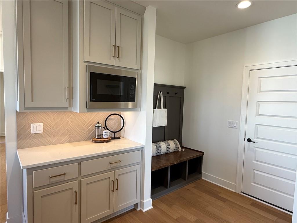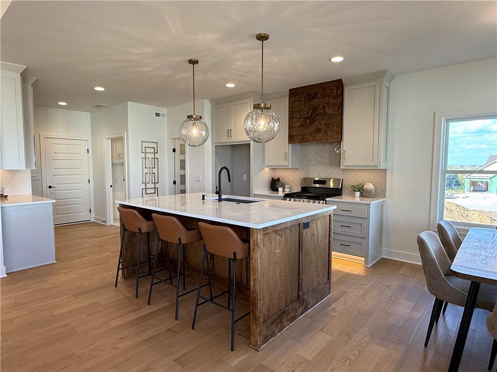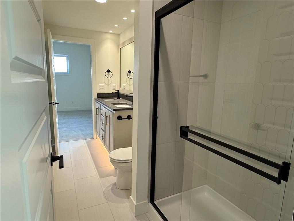 Step inside and you’ll immediately notice the bright, airy feel of this home. The open floor plan is accented by tall ceilings with exposed wood beams, oversized windows that pour in natural light, and wide-plank hardwoods that create a welcoming atmosphere. The living room is anchored by a striking floor-to-ceiling fireplace topped with a wood mantel, the perfect spot to gather with friends or relax at the end of the day. The gourmet kitchen is designed for both function and style, offering a large island with seating, quartz countertops, custom cabinetry, stainless steel appliances, and modern lighting. The adjoining dining area overlooks the backyard and provides direct access to the covered deck for outdoor enjoyment. The primary suite feels like a private retreat, complete with a tray ceiling, modern ceiling fan, soft carpet, and a bold accent wall. The adjoining spa-like bath is designed for relaxation, offering a calm and luxurious escape with a large shower, soaking tub, and double vanities. Additional main-level highlights include a private office, mudroom, walk-in pantry, and laundry room. The finished lower level expands the living space with a large recreation room featuring oversized windows, a wet bar, and a half bath. Two additional bedrooms share a full bathroom on this level. Additional upgrades include under-cabinet lighting and a variety of modern finishes throughout.