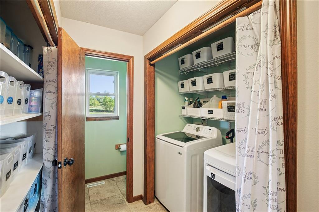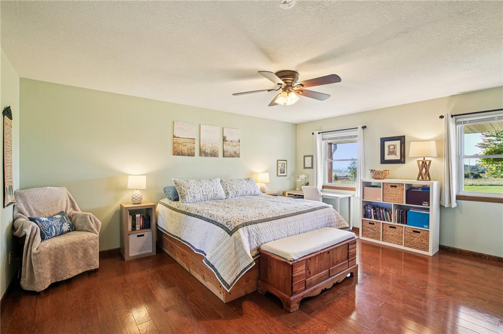 Low cost Geothermal Heating and Cooling! Acreage lifestyle with a fully stocked pond! Property offers opportunity for mini farm lifestyle. Large family room in lower level with full bath and bedroom and washer and dryer. Walkout door to allow for privacy for multi-generational living. Main floor features additional washer and dryer and primary suite. Living room and country kitchen finish out this large space. Upper level has two large bedrooms with a full bath. Lots of storage areas! Quick! Take a Look and Make this House Your New Home! Buyers to verify all measurements and claims.