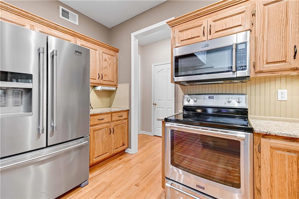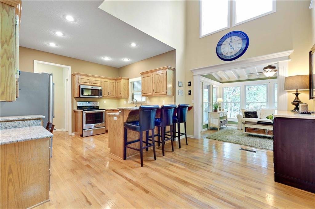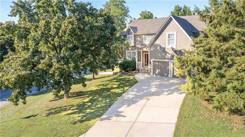 Perched atop a corner lot in the back of the coveted Northwood Trails Neighborhood, this 2-story is packed with ALL the upgrades and trimmings. Pride in ownership shines through every space from this one owner home. Love the outdoors? With this home's incredible custom sunroom addition, large covered porch, and tiered stamped concrete patio you can enjoy a low-maintenance retreat designed for outdoor leisure or entertaining guests all year long. As you step inside, you’re welcomed by soaring ceilings, and rich hardwood floors that flow seamlessly into this open-concept space. The kitchen transitions effortlessly into a spacious great room, where a striking fireplace creates a warm and inviting atmosphere. Formal dining room could easily be used as an office. Upstairs, an oversized master closet offers abundant storage, complemented by a generously sized hall bathroom and upstairs laundry room for added comfort and convenience. Light neutral tones throughout the interior lend a fresh, sophisticated charm, ready for your personal touch. The unfinished walkout basement expands your possibilities, featuring a RARE 3rd car side entry garage door... SO many opportunities for a hobby space / boat storage / home business... tailor it to your unique lifestyle! Never shovel snow again thanks to your southern facing driveway! Situated in a mature neighborhood, this home provides access to a refreshing community pool, picturesque trails—including the Gary Heller trailhead at the back, perfect for outdoor adventures—and a serene lake that enhances the natural surroundings. Served by the esteemed Olathe School District and just minutes from shopping, dining, and entertainment options, this move-in-ready property combines modern upgrades with timeless appeal. Don’t miss your chance to own this Northwood Trails gem—schedule a private showing today and envision the life that awaits you here!
