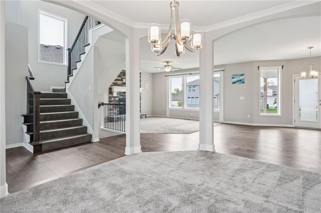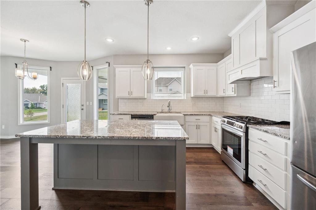 Prieb’s Paxton III is a beautifully designed two-story home offering 5 bedrooms and 4 full bathrooms, ideal for families of all sizes. The home features vaulted ceilings in the bedrooms and an open-concept layout that’s perfect for entertaining. The kitchen is a chef’s dream, with a large island with seating, apron sink, stainless steel appliances, and a walk-in pantry. Upstairs, a hallway with built-in bookshelves leads to a spacious master suite with double doors, a walk-in closet with direct access to the laundry room, and a luxurious master bathroom featuring a soaking tub, double vanity, and an expansive walk-in tile shower. Each secondary bedroom has private access to a bathroom, offering comfort and privacy. On the main floor, a flex room can serve as an office or fifth bedroom, conveniently located next to a full bathroom. The home also includes a mudroom with a boot bench, a sprinkler system, and a full basement that’s stubbed for a ¾ bath, offering potential for future expansion. This home seamlessly blends style, function, and comfort, making it a must-see for any family.