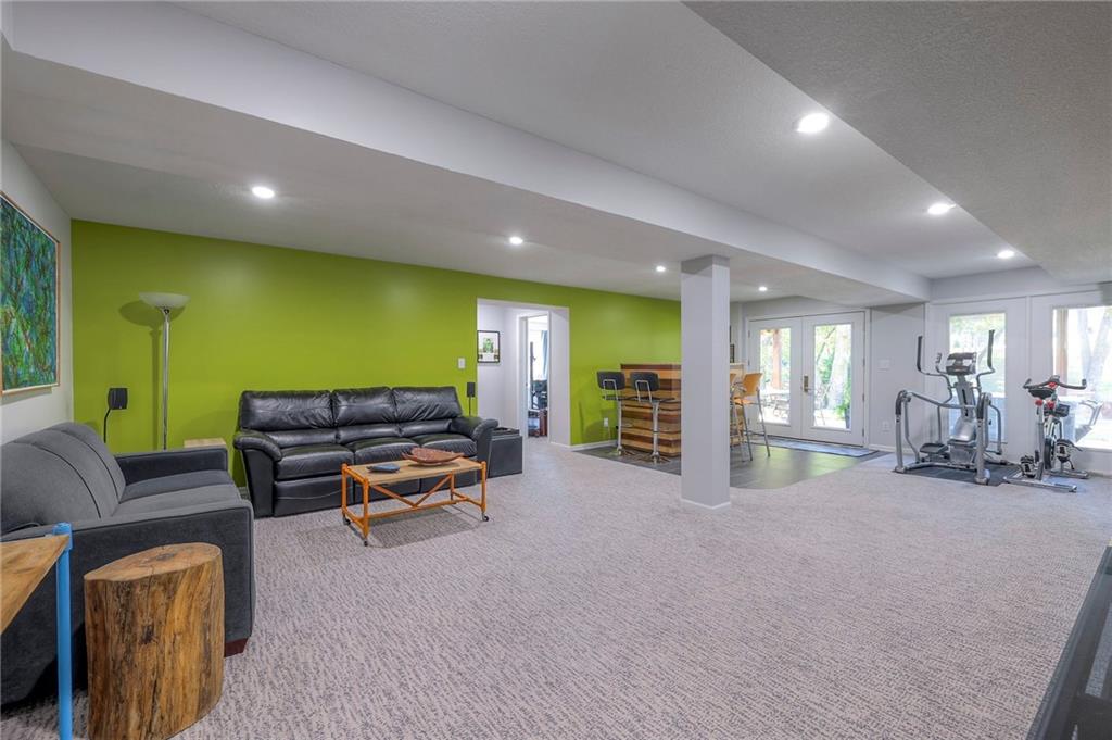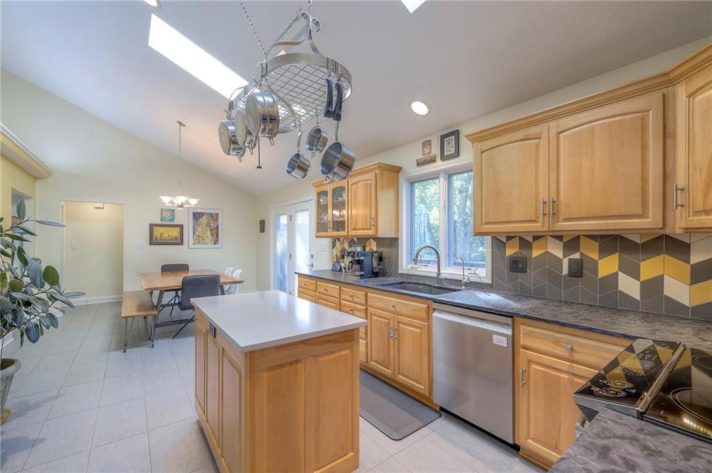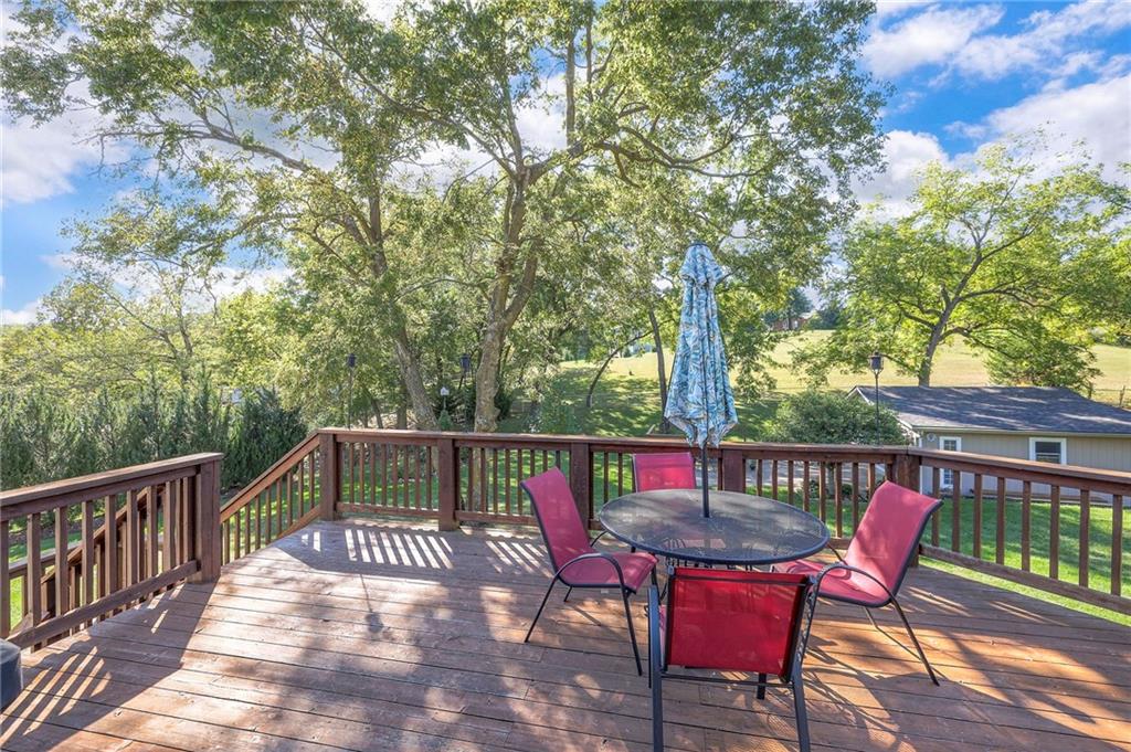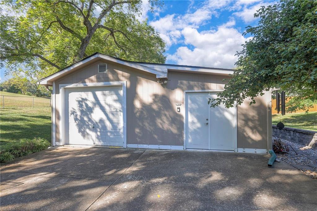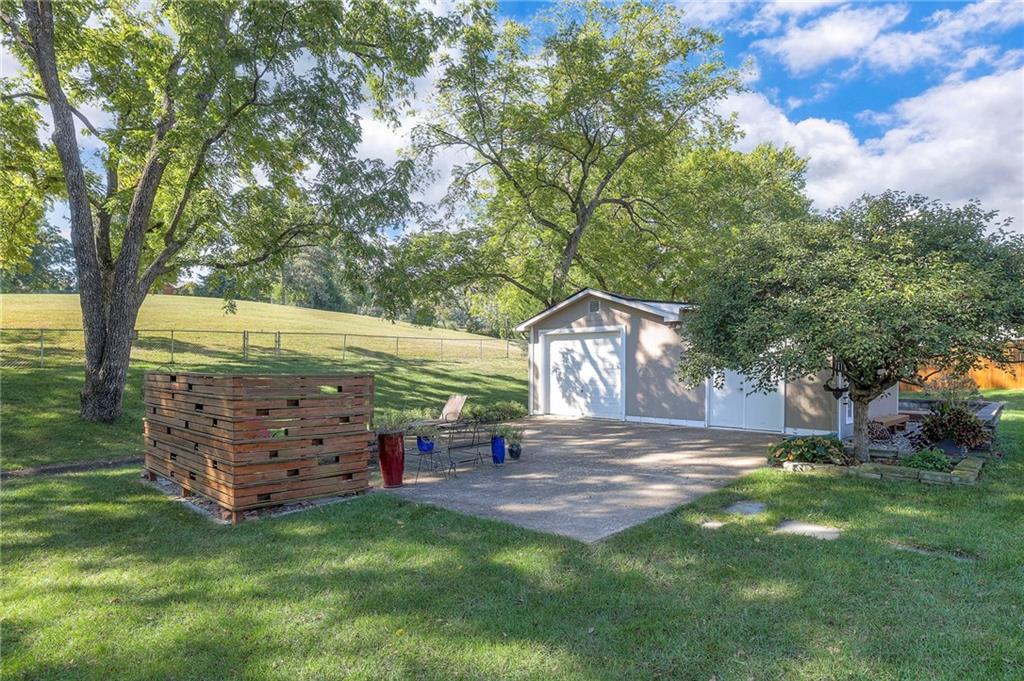Welcome to this beautifully updated 3-bedroom, 2.5-bath reverse 1.5-story home sitting on a scenic .65-acre lot! Step inside a light-filled living room featuring vaulted ceilings, porcelain tile floors, a ceiling fan, and an abundance of natural light. The updated kitchen is a true highlight, featuring granite countertops, stainless steel appliances, a stylish backsplash, and a spacious eat-in dining area—perfect for daily living or entertaining. The primary suite is your personal retreat, offering a large walk-in closet and a fully updated en-suite bathroom designed for relaxation. Convenient main-level living flows seamlessly into the finished walkout lower level, complete with a large rec room, two additional bedrooms, and a full bath. French doors open to a patio with a hot tub overlooking the private, fenced backyard with a firepit—ideal for cozy fall evenings. Outside, you’ll find even more to love. The backyard features a versatile finished outbuilding, for use as a bonus entertaining space, gym, or office, and half for all your storage or yard equipment needs. Mature trees and a park-like setting provide the perfect blend of privacy and outdoor enjoyment. With recent updates, including newer windows, this home is truly move-in ready. Add in its unbeatable location—just minutes from shops, restaurants, highway access, and KCI airport—and you’ve got a home that checks every box.