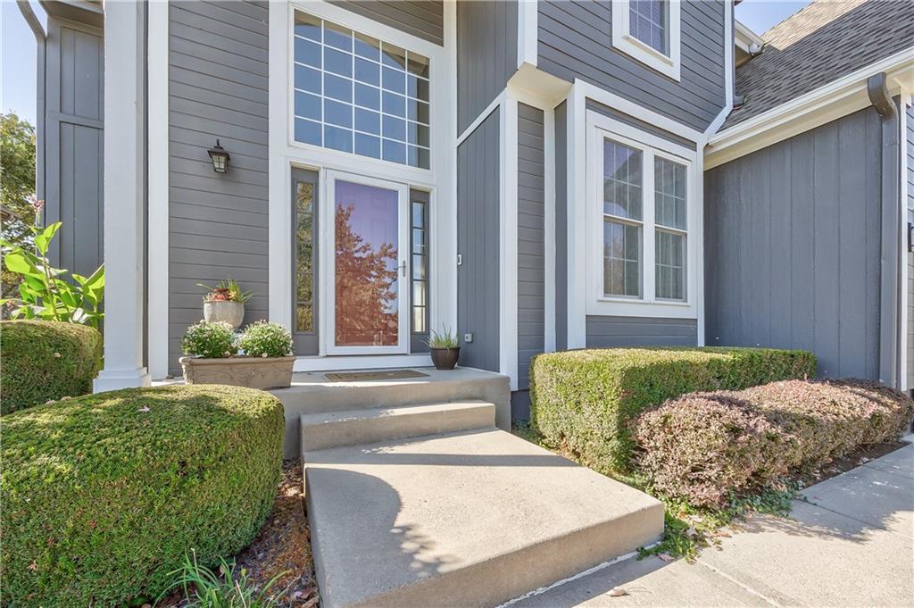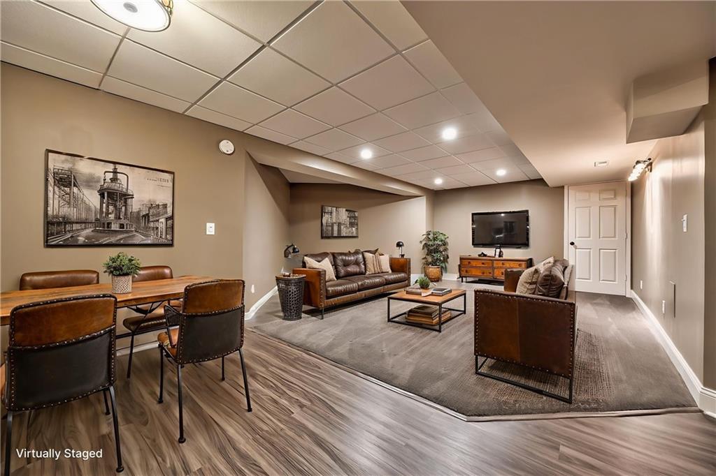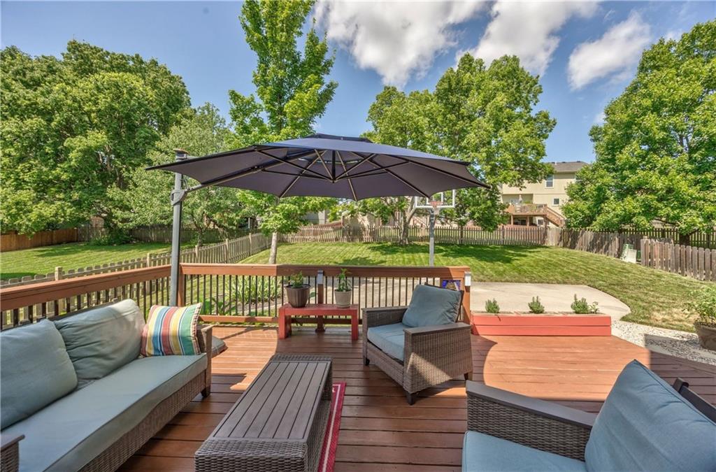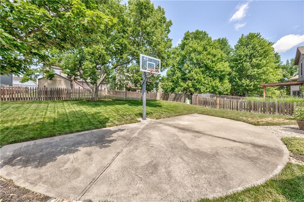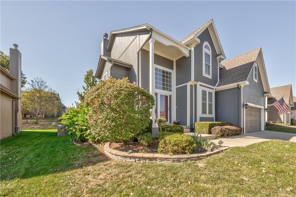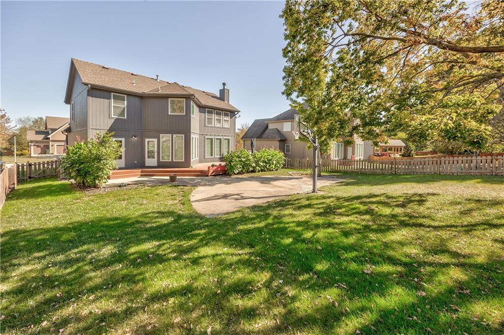 Beautiful 2-story home on a cul-de-sac in Olathe! Step inside to find a flexible front room, perfect as a formal dining space or a home office. Brand new carpet and fresh interior paint throughout! The inviting great room features a cozy gas fireplace with elegant, fluted trim and mantle. The eat-in kitchen offers hardwood floors, a large island, granite countertops, subway tile backsplash, stainless steel appliances, a pantry, and a spacious breakfast area that easily fits a full-size dining table. Upstairs, the spacious primary suite impresses with a vaulted ceiling, soaker tub, separate shower, dual vanities, and walk-in closet. Additionally, the secondary bedrooms are generously sized and there is a second full bath. The finished lower level is made for entertaining with a large rec room, sleek bar featuring quartz countertops, a beverage fridge plus a convenient half bath. Unfinished space offers plenty of room for storage. Additional main-floor perks include a half bath and a laundry/mudroom with exterior access to the backyard. Recent updates include comfort-height toilets, kitchen backsplash, primary shower tile, and a fully finished basement. Enjoy outdoor living on the expansive deck with private basketball court and landscaped, treed yard. The two-car garage features built-in shelving and a workbench. Radon mitigation system in place.
