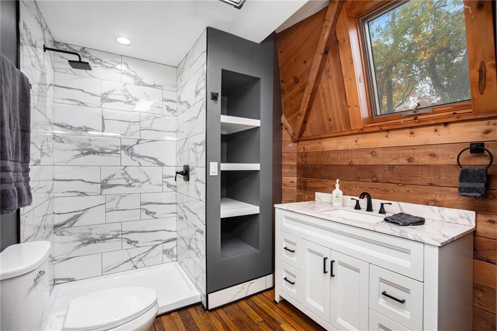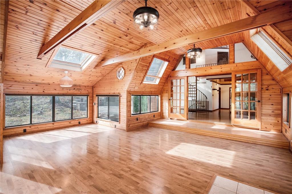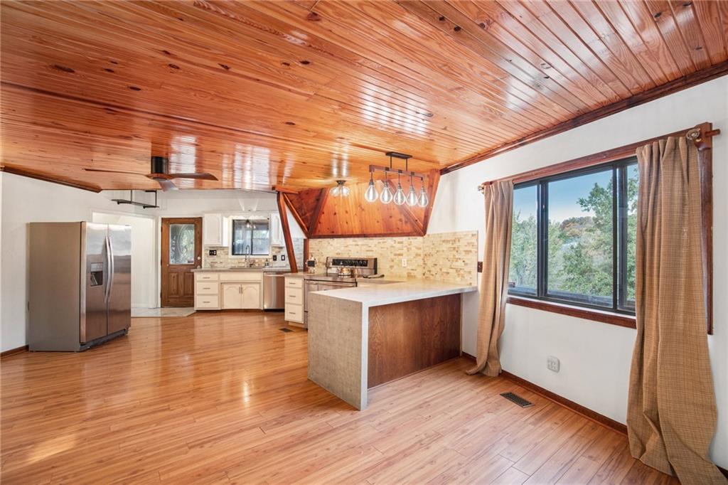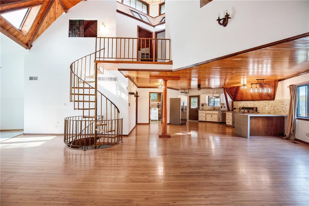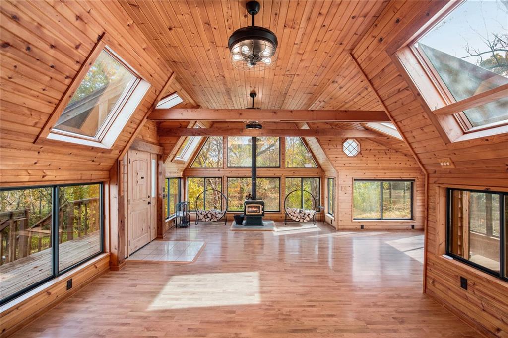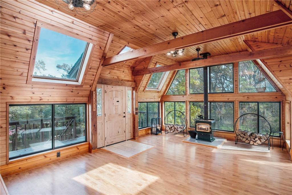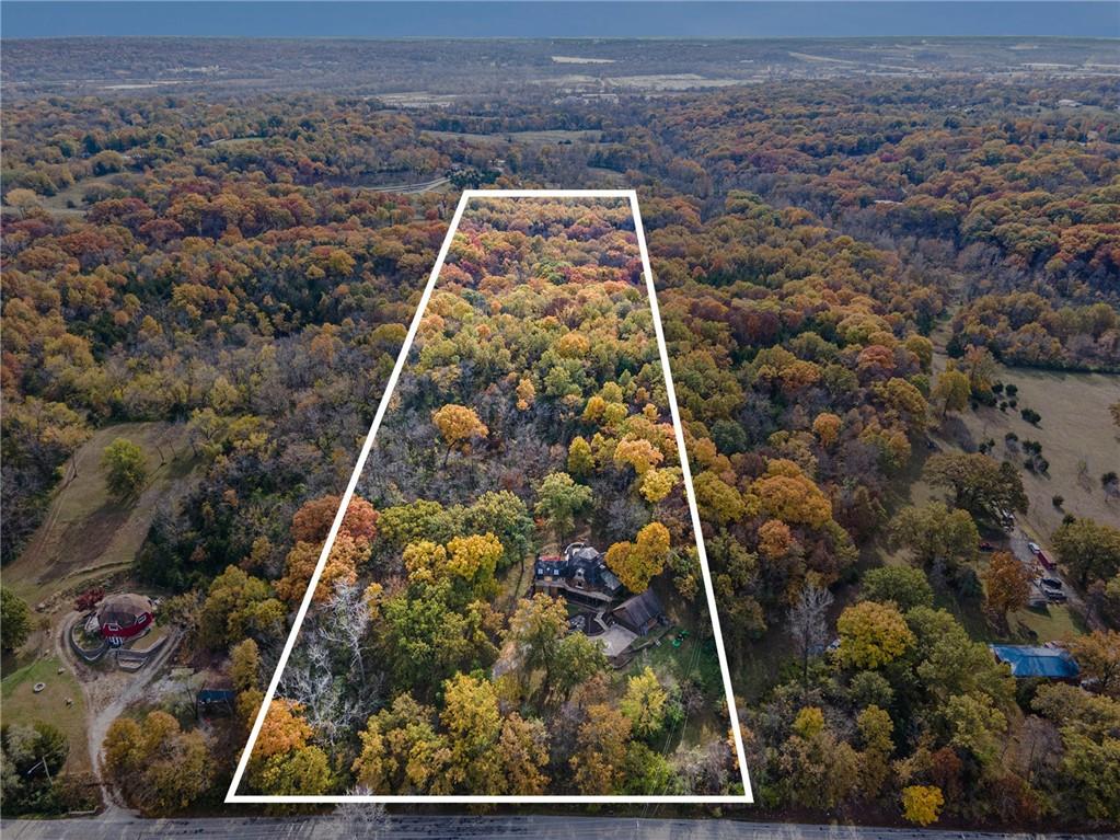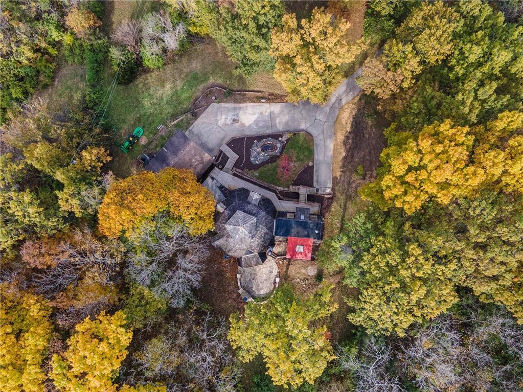 Experience the warmth and character of this geodesic dome home nestled on nearly 10 wooded acres close to everything! Designed for nature lovers and architecture enthusiasts, this unique retreat offers amazing wood ceilings, abundant natural light and the warmth of both a wood-burning stove and 2 fireplaces. The open-concept living area flows seamlessly on the main area to the kitchen, dining area, great room, bedroom and full bath. One set of French doors open to a spectacular room with windows on all sides that overlook your private retreat. Curl up next to the wood stove or fireplace with a good book or just sit back, relax and take in nature. Step out back to the gorgeous stone patio with built-in outdoor fireplace - the perfect place for entertaining or a quiet evening under the stars by the warm of a fire. Upstairs you will find 2 additional bedrooms and full bath, and the finished walkout basement affords space for a family room or rec room. With an updated HVAC system and hot water heater, remodeled baths, concrete kitchen countertops, updated light fixtures, fresh interior paint and an oversized 2-car garage for all your "toys", this home offers comfort, efficiency and the luxury of enjoying wooded beauty. Whether you're looking for your personal home or a weekend getaway, once you step out back and walk through the wooded acreage, you'll feel like the city is miles away! But just 3 minutes east of 435 and less than 10 minutes from The Legends, you'll have excellent highway access to all that Kansas City has to offer. Please note property is being sold "as is".