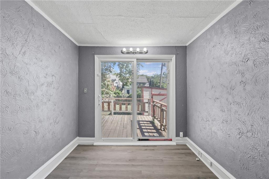 Discover the perfect blend of classic charm and modern convenience in this delightful 2-story home, located at 3427 Agnes Avenue in Kansas City. This property offers a welcoming atmosphere with its vibrant red exterior, complemented by a covered front porch featuring distinctive stone pillars. The home provides ample space for both relaxation and entertainment, with a functional and inviting layout. Upon entering, you are greeted by a spacious open-concept living and dining area, distinguished by elegant coffered ceilings and a decorative painted brick fireplace that serves as a beautiful focal point. The interior is freshly painted in a neutral gray with crisp white trim, creating a bright and airy feel throughout. Large windows allow for an abundance of natural light, enhancing the sense of space. The main living areas feature attractive and durable laminate flooring, providing a seamless flow from room to room. Thoughtful built-in cabinetry and a cozy window seat add to the home's character and provide practical storage solutions. The galley-style kitchen is well-equipped with dark wood cabinetry, offering plenty of storage, and is paired with stylish granite-look countertops. The kitchen comes complete with a refrigerator, stove, and microwave, making it ready for all your culinary endeavors. A convenient pantry provides additional storage space for your kitchen essentials. This home includes multiple comfortable bedrooms, each featuring ceiling fans and ample natural light. The updated bathroom is clean and modern, with a white tub and shower combination and contemporary fixtures. For outdoor enjoyment, a wooden deck at the rear of the house provides a private space for grilling and relaxing. The fenced backyard also includes two sheds for extra storage. With its combination of traditional architectural details and recent updates, this home is move-in ready and waiting for you to make it your own.