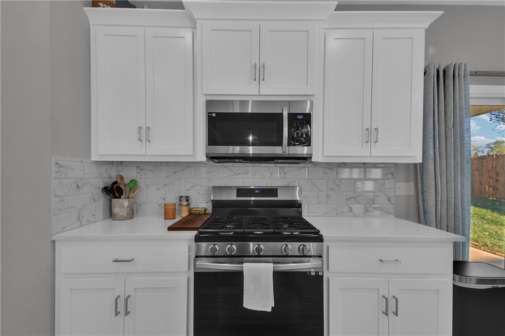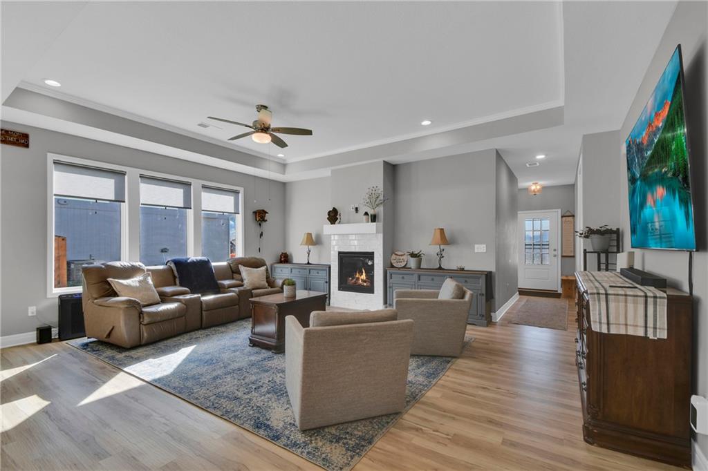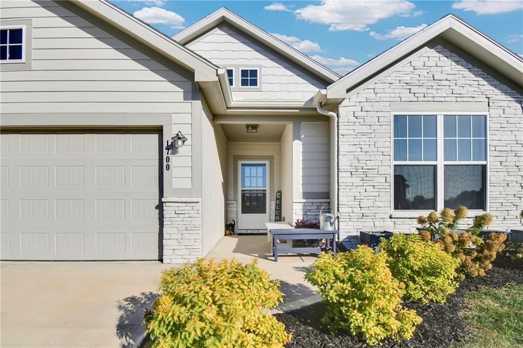Nearly “New” built home, ready for you. Welcome to Aster, a beautiful ranch-style home by Authentic Homes KC! This thoughtfully designed home is packed with luxurious upgrades and stylish touches throughout. Gorgeous & upgraded flooring offers both elegance and durability. This open-concept layout features a chef-inspired kitchen with quartz countertops, stainless steel appliances including a gas stove, custom cabinetry, a walk-in pantry, ample counter space, and a large center island that flows seamlessly into the spacious living room—perfect for entertaining. The master suite boasts a large bedroom, a spa-inspired bathroom with double vanity, custom tiled shower with bench seat, and a generous walk-in closet conveniently connected to the laundry room. Step outside to enjoy the expansive covered patio, large back patio, and beautifully manicured yard—ideal for relaxing or hosting gatherings. This home is move-in ready and easy to show—don’t miss your chance to make it yours!