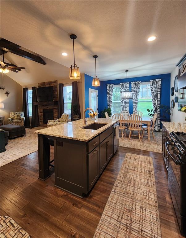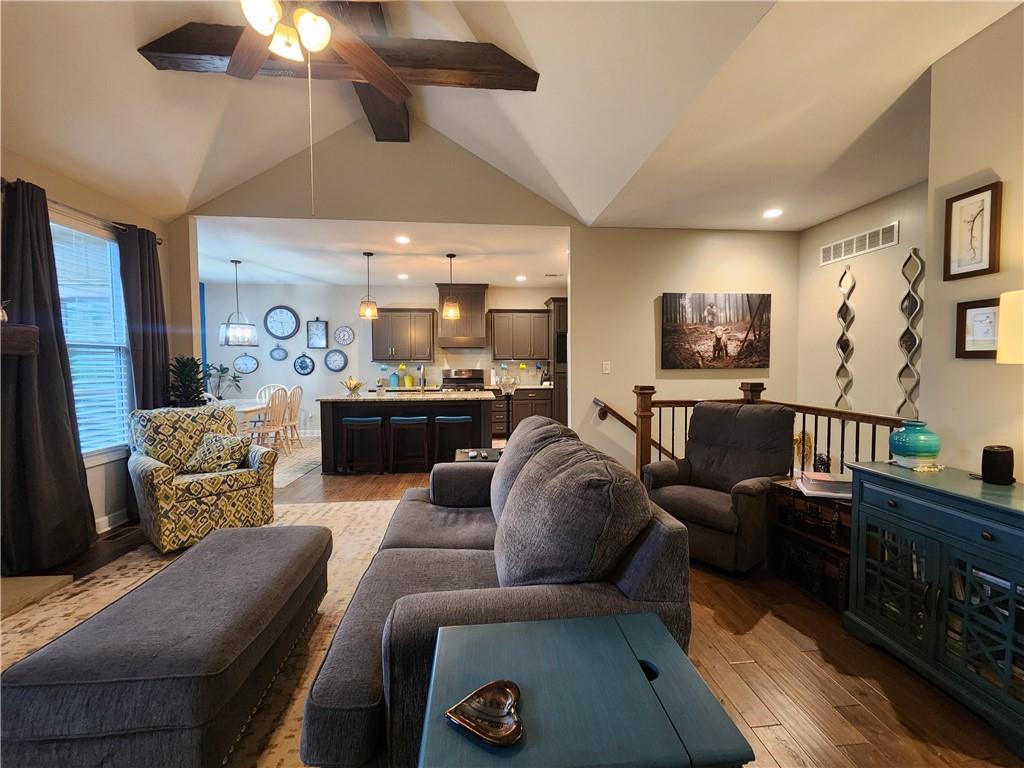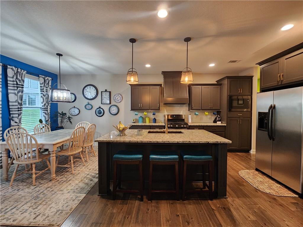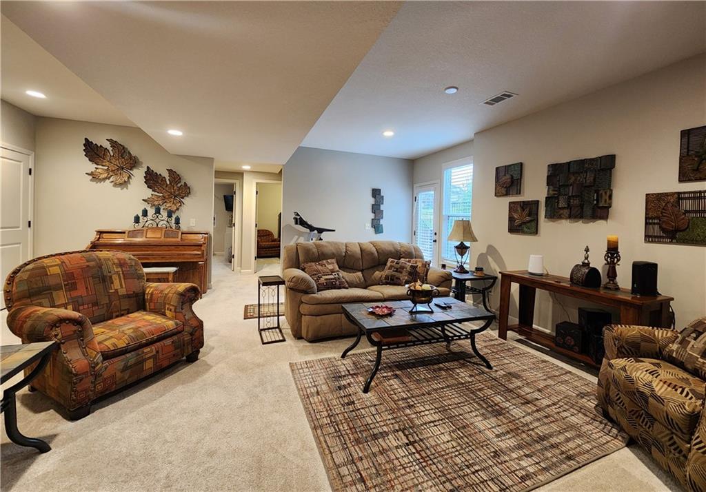 WONDERFUL Reverse Ranch home on cul-de-sac in the desired Seven Bridges Neighborhood! Walk inside this warm home & make it your own! The living room is open to the kitchen and dining areas- Great for entertaining! The living room with the vaulted ceilings, floor-to-ceiling windows, & stone fireplace makes a perfect sitting area to enjoy while overlooking the kitchen. The Kitchen is lovely with the large island, painted cabinets, gold hardware, gas stove, stainless appliances, and open to the dining area with additional floor-to-ceiling windows that walk out to the beautiful, fenced yard with sprinkler system. The MBR is conveniently located on the main floor, along with the laundry room. Bonus: make hauling groceries inside easy with just a few steps from the garage to the kitchen. The basement rec room is nicely finished with 2 additional bedrooms, full bathroom & ample storage areas that walk out to the lower patio. Not only is the home fantastic, so is the Neighborhood-- with a Community clubhouse, Party Room, Play Area, Swimming Pool, Tennis Courts, Trails & Gorgeous entrance waterfall.