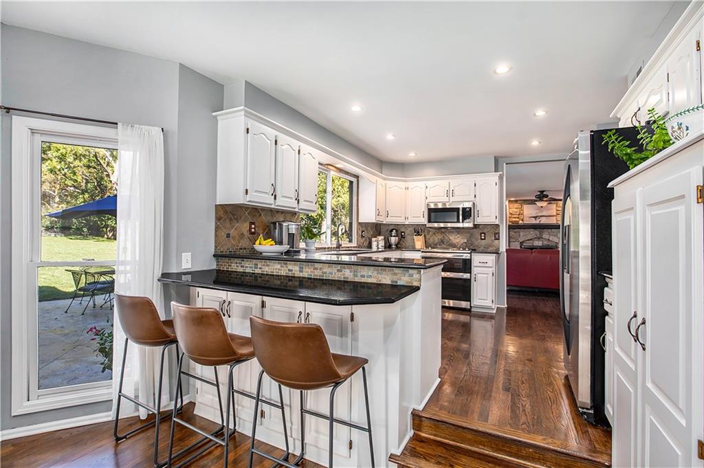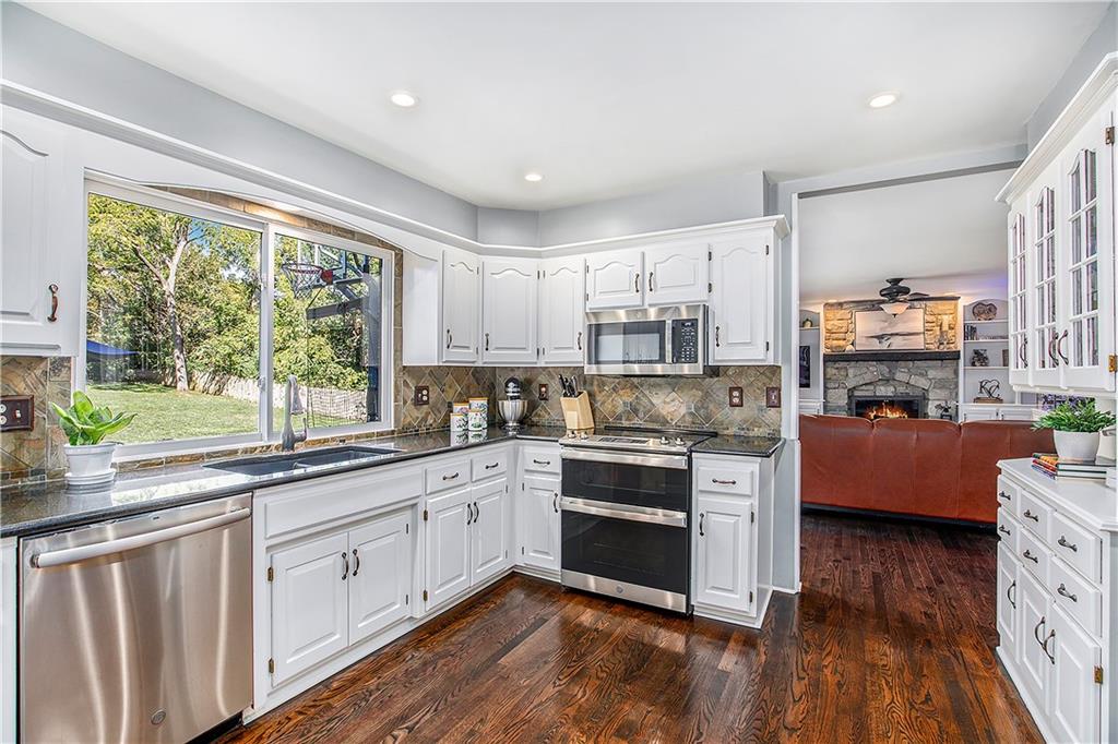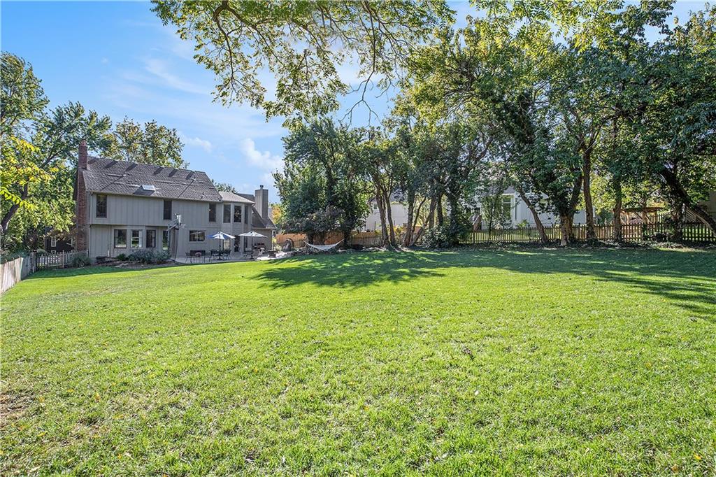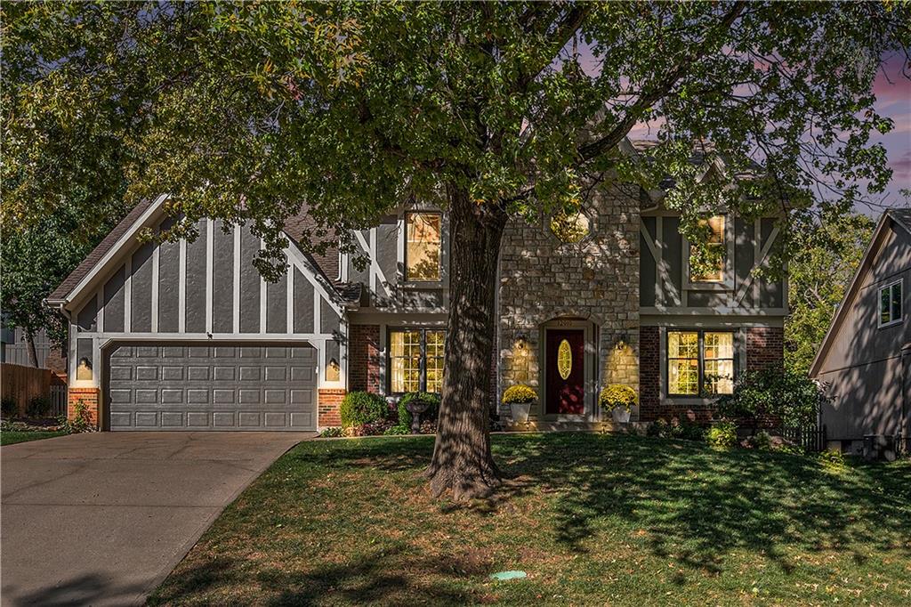 Celebrate the Holidays in Oak Tree Meadows Move in before the end of the year and enjoy the seasons ahead in this beautifully-updated home on a stunning park-like lot. This 4-bedroom, 2 1/2 -bath home in the desirable Oak Tree Meadows community of Overland Park offers the perfect blend of comfort, charm, and thoughtful design. Pride of ownership shines throughout with consistent updates including an updated roof, fresh exterior paint, and an updated kitchen that opens to the hearth room, dining room, and living room—all overlooking a spectacular backyard. The kitchen features painted cabinetry, granite counters, stainless steel appliances, and an eat-in hearth area accented by a brick fireplace and a clever barn-door drop zone for everyday organization. The living room boasts a stone fireplace framed by built-ins and rich hardwood floors that bring warmth and character to the main level. Step outside to your own private oasis—a lush, level .39-acre treed lot with a stamped concrete patio, tranquil water feature, and ample space for entertaining or quiet evenings under the trees. Upstairs, the spacious primary suite includes a sitting area, updated ensuite bath with granite double vanity, walk-in shower, jacuzzi tub, and generous walk-in closet. Secondary bedrooms are equally spacious and share a hall bath with painted vanity and skylight. The finished lower level is designed for fun and function—featuring a family room, wet bar, exercise space, and a stylish barn door accent. Nestled in a quiet, established neighborhood with access to Stoll Park, a private neighborhood lake, and just minutes from shopping, dining, and major highways (I-35, 435, and 69)—this home perfectly balances comfort, convenience, and community.