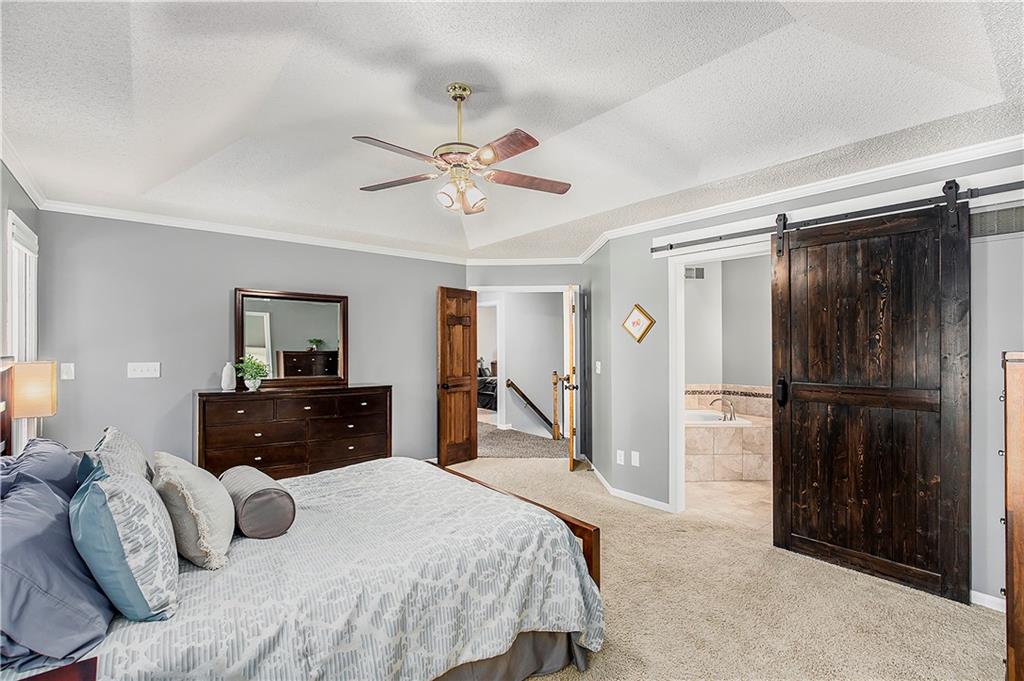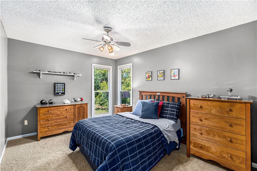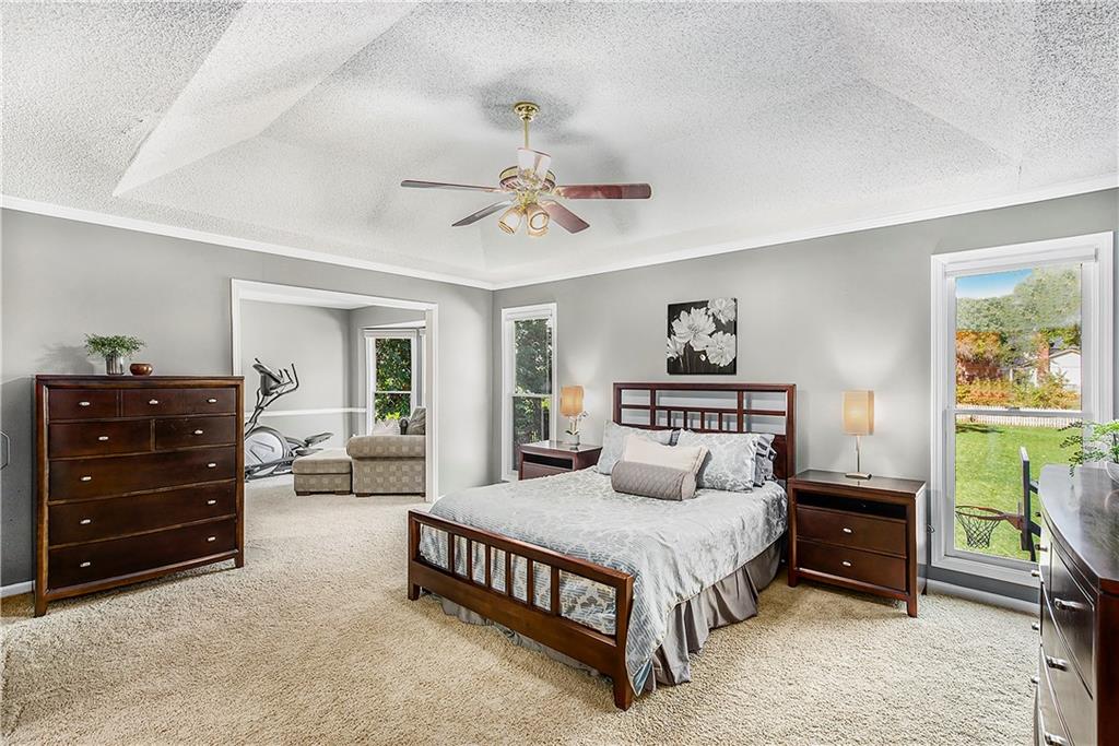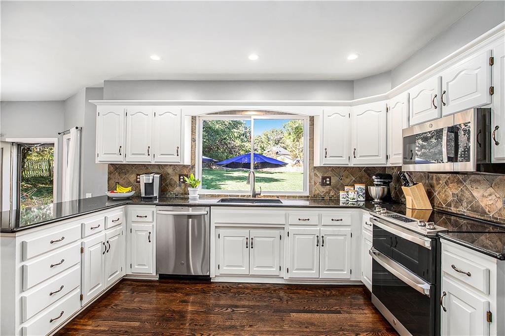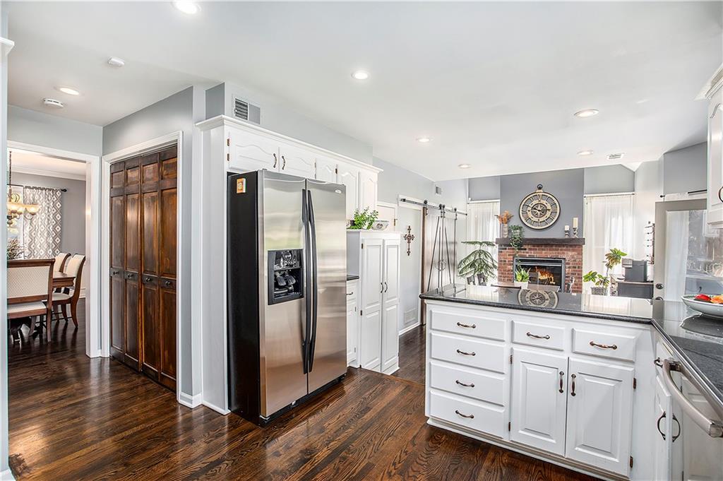 Celebrate the Holidays in Oak Tree Meadows Move in before the end of the year and enjoy the seasons ahead in this beautifully-updated home on a stunning park-like lot. This 4-bedroom, 2 1/2 -bath home in the desirable Oak Tree Meadows community of Overland Park offers the perfect blend of comfort, charm, and thoughtful design. Pride of ownership shines throughout with consistent updates including an updated roof, fresh exterior paint, and an updated kitchen that opens to the hearth room, dining room, and living room—all overlooking a spectacular backyard. The kitchen features painted cabinetry, granite counters, stainless steel appliances, and an eat-in hearth area accented by a brick fireplace and a clever barn-door drop zone for everyday organization. The living room boasts a stone fireplace framed by built-ins and rich hardwood floors that bring warmth and character to the main level. Step outside to your own private oasis—a lush, level .39-acre treed lot with a stamped concrete patio, tranquil water feature, and ample space for entertaining or quiet evenings under the trees. Upstairs, the spacious primary suite includes a sitting area, updated ensuite bath with granite double vanity, walk-in shower, jacuzzi tub, and generous walk-in closet. Secondary bedrooms are equally spacious and share a hall bath with painted vanity and skylight. The finished lower level is designed for fun and function—featuring a family room, wet bar, exercise space, and a stylish barn door accent. Nestled in a quiet, established neighborhood with access to Stoll Park, a private neighborhood lake, and just minutes from shopping, dining, and major highways (I-35, 435, and 69)—this home perfectly balances comfort, convenience, and community.