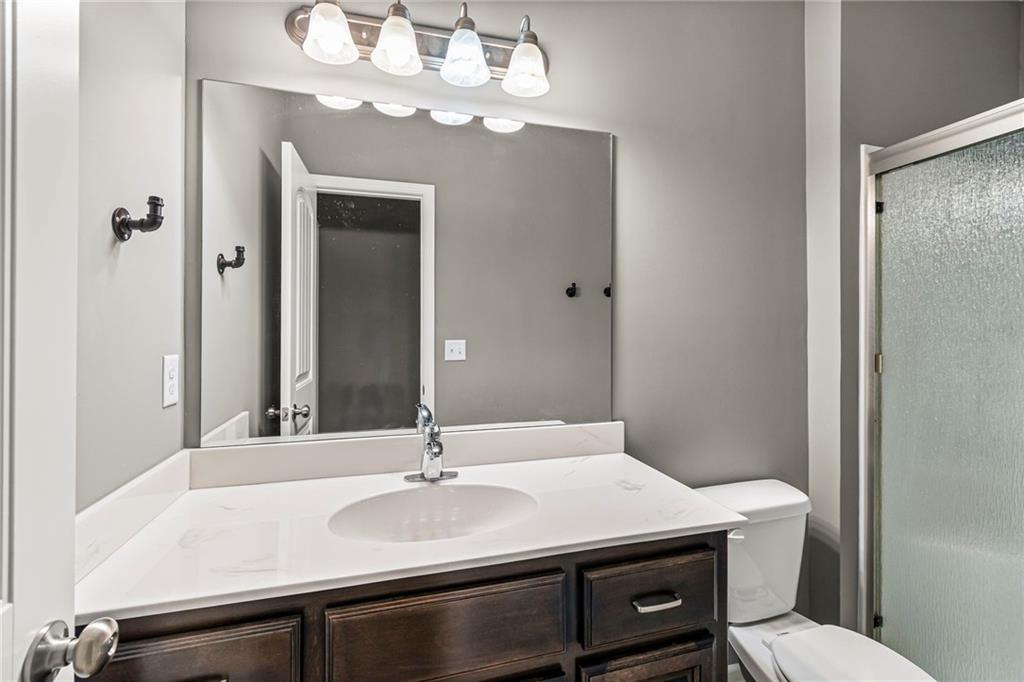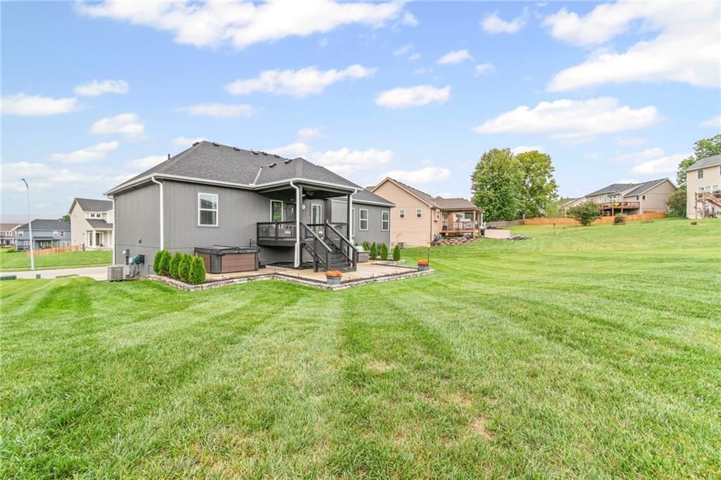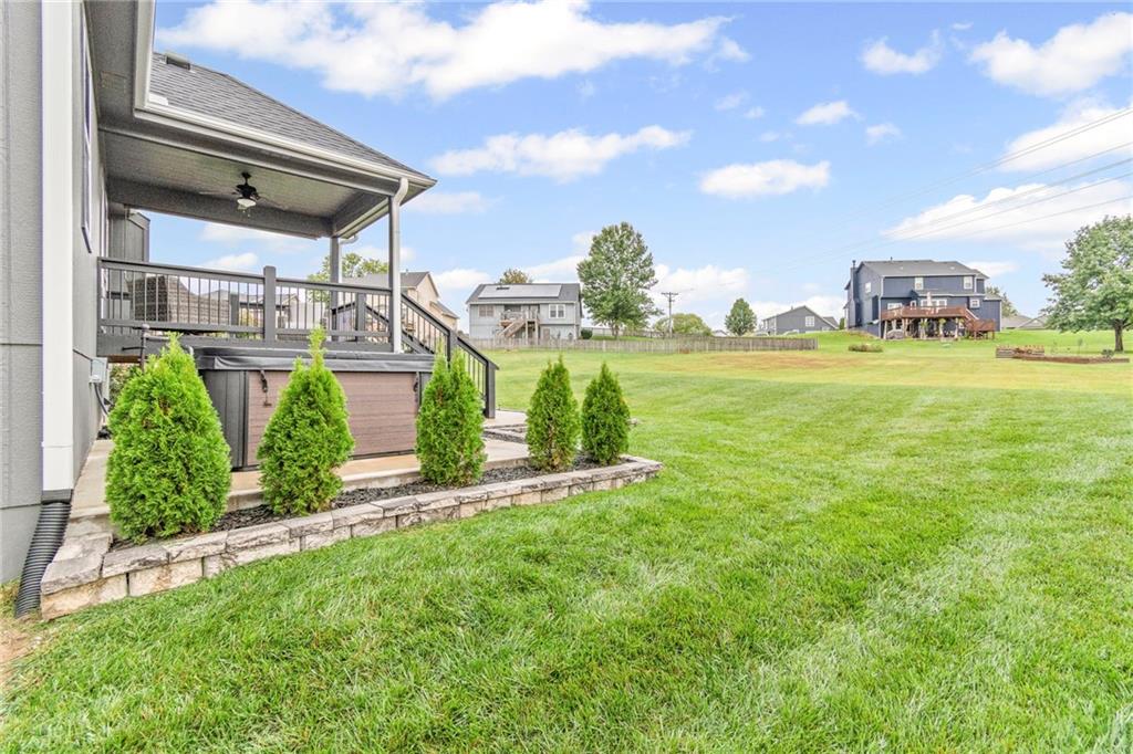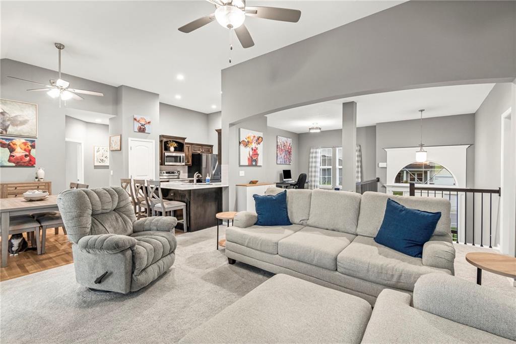 Step inside this nearly new Liberty home where thoughtful design and everyday comfort come together. The main level greets you with a spacious, light-filled living room anchored by a cozy gas fireplace and plush carpet that invites you to kick off your shoes and stay awhile. Just beyond, warm hardwood floors carry through the kitchen and dining area—an open, seamless space perfect for gatherings. The kitchen shines with quartz countertops, stainless steel appliances, ample cabinetry, and a pantry, while the conveniently located laundry room just off the kitchen keeps everything practical and within reach. The primary suite is privately tucked away, offering a peaceful retreat with a large walk-in closet and a spa-inspired bath complete with dual sinks, soaking tub, and separate shower. Two additional bedrooms and a full bath round out the main level. Downstairs, the finished lower level expands your living space with a generous family room ideal for movie nights, game days, or a cozy hangout spot. You’ll also find a fourth bedroom and third full bath—perfect for guests or a home office. Out back, unwind on the covered deck or entertain on the extended patio overlooking the beautifully maintained yard. With an oversized three-car garage and access to Clay Meadows’ neighborhood pool, this home blends small-town Liberty charm with modern style and convenience.
